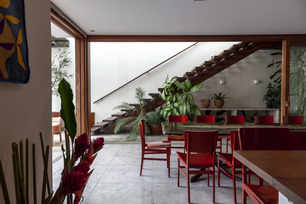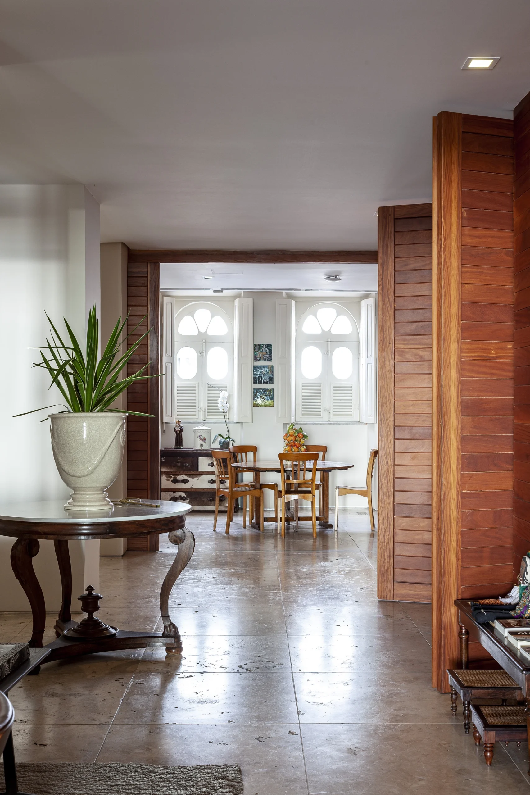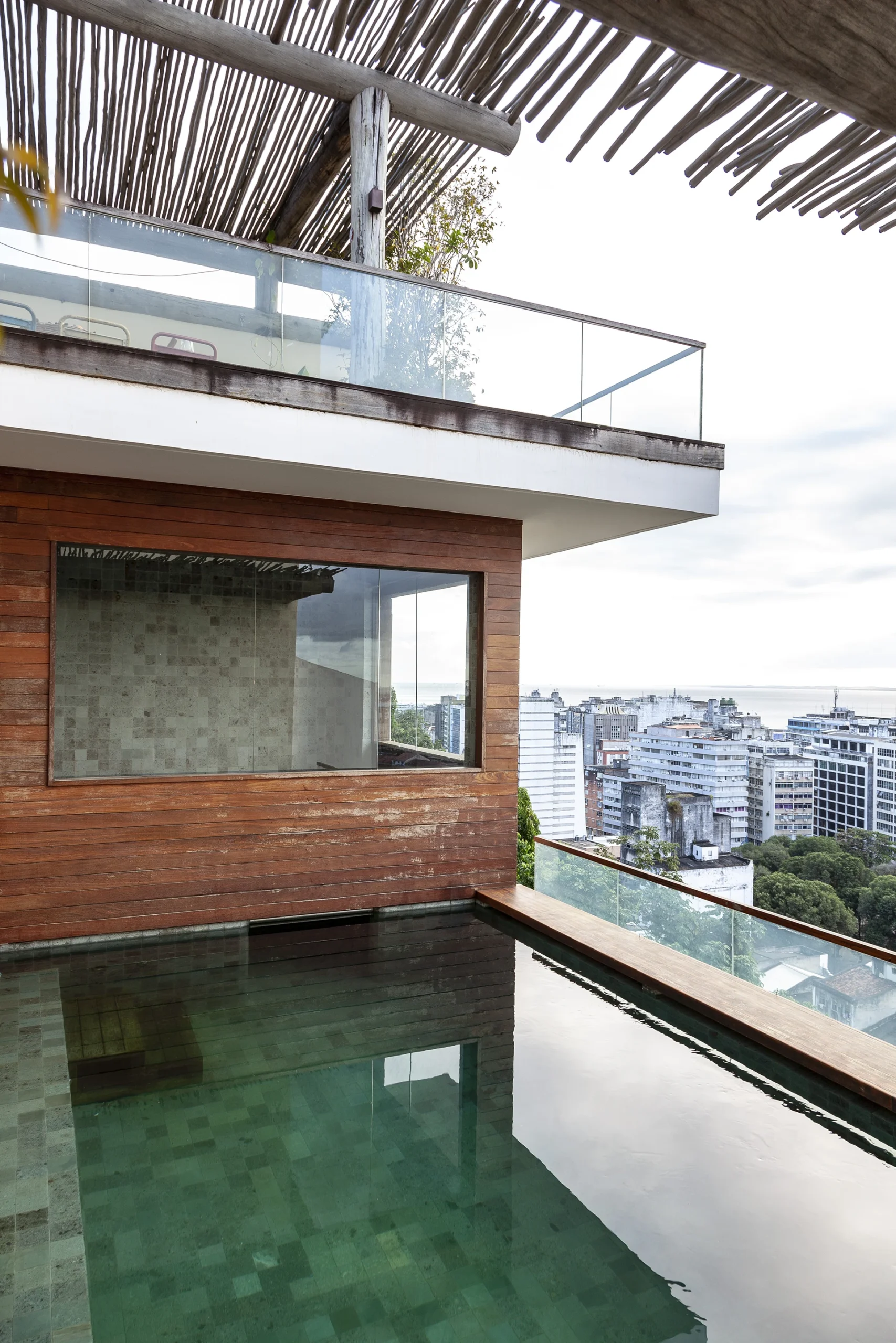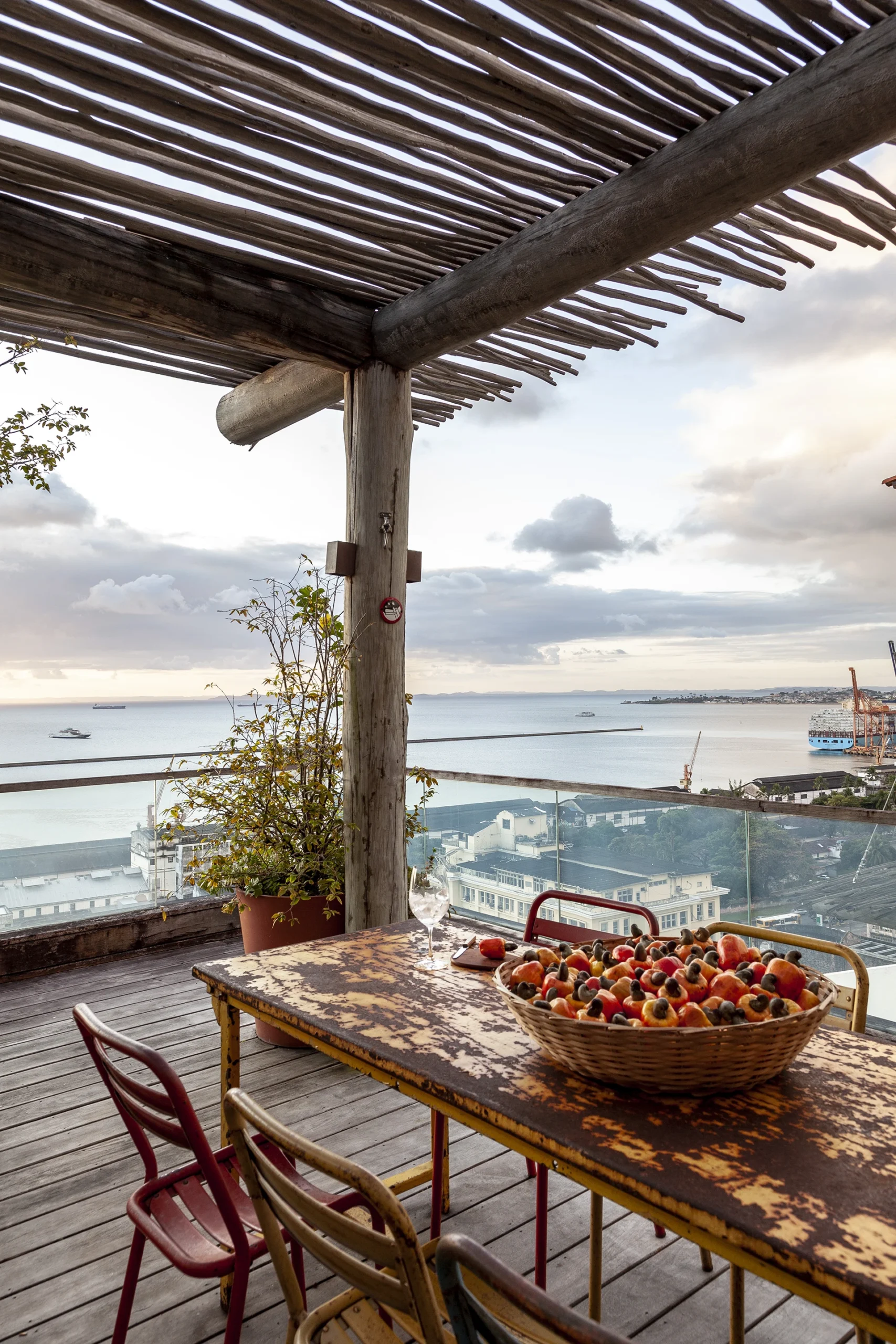 Entre o movimento da cidade e a contemplação da paisagem, esta casa no Centro Histórico de Salvador equilibra contrastes com naturalidade. De um lado, o Convento do Carmo e o cotidiano pulsante da calçada; do outro, a Baía de Todos os Santos e o vaivém do Elevador Lacerda, vistos a partir do terraço. Ao unificar duas antigas casas geminadas, possivelmente dos séculos XVIII e XIX, David Bastos valorizou a localização privilegiada do imóvel e promoveu uma requalificação cuidadosa dos espaços, respeitando integralmente as diretrizes do patrimônio histórico. As fachadas originais — uma em tom rosado, outra em creme — foram preservadas, assim como os pilares internos e as paredes de adobe que orientaram a nova planta.