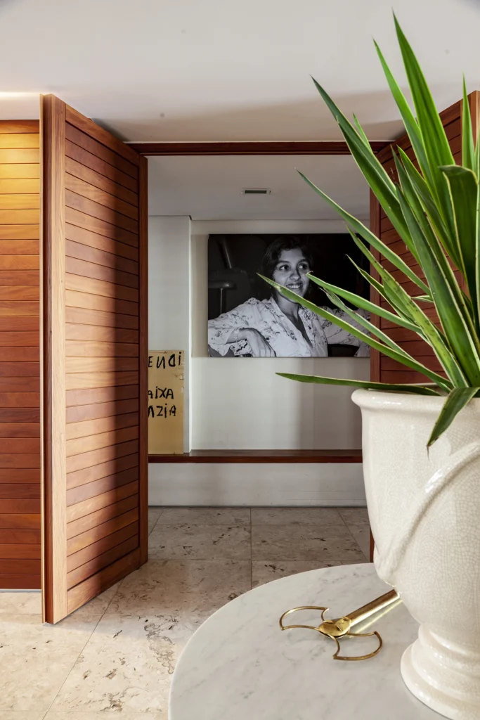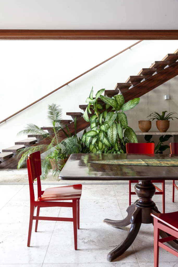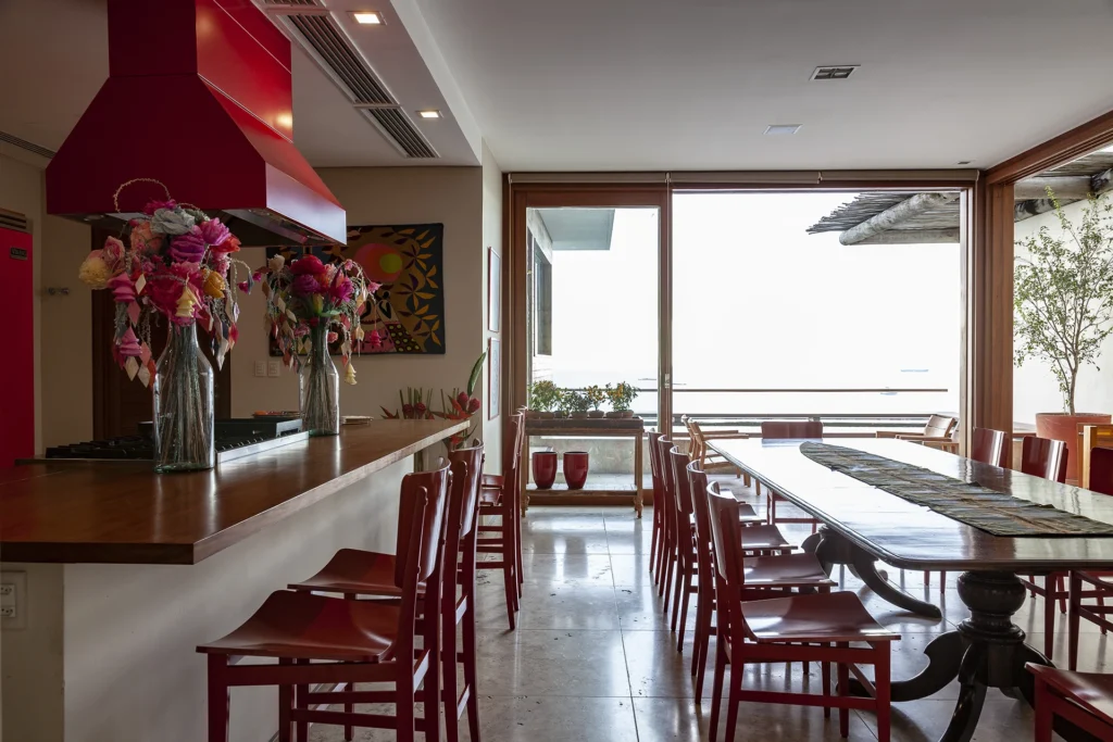 A decoração reflete a personalidade marcante da moradora, Regina Casé, que dividiu com David Bastos as decisões do projeto: enquanto o arquiteto definiu o mobiliário principal, ela se dedicou à curadoria de objetos e obras de arte. O resultado é um conjunto vibrante e autoral, onde cores intensas, obras de artistas renomados e produções populares convivem em harmonia — um retrato fiel de quem habita o espaço.