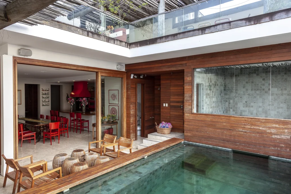 Os telhados mantiveram seu desenho original, embora tenham exigido a substituição do madeiramento e a reprodução artesanal das telhas de barro. Com a estrutura reforçada, foi possível criar um novo pavimento em subsolo, que abriga a cozinha e a sala de jantar. Ao longo dos demais cinco níveis, incluindo o sótão, distribuem-se suítes, escritório, salas, dependências de serviço e áreas de apoio. Elementos contemporâneos como piscina, sauna e um amplo terraço com áreas de estar e refeição foram incorporados à casa centenária, ampliando as possibilidades de uso e lazer.
