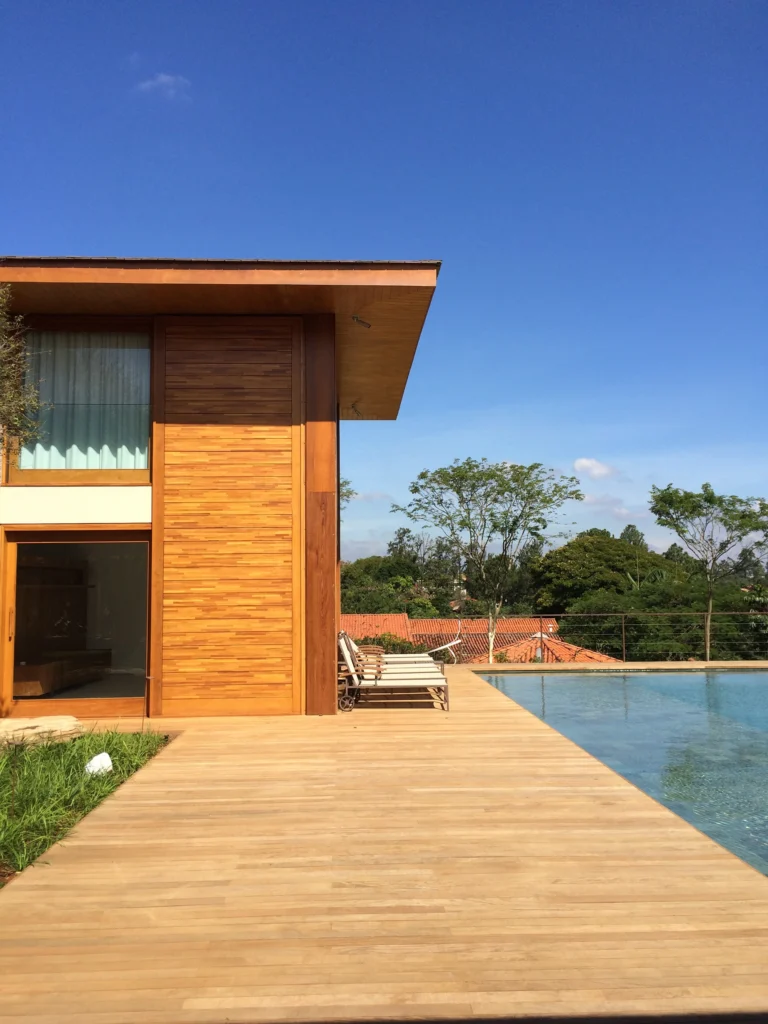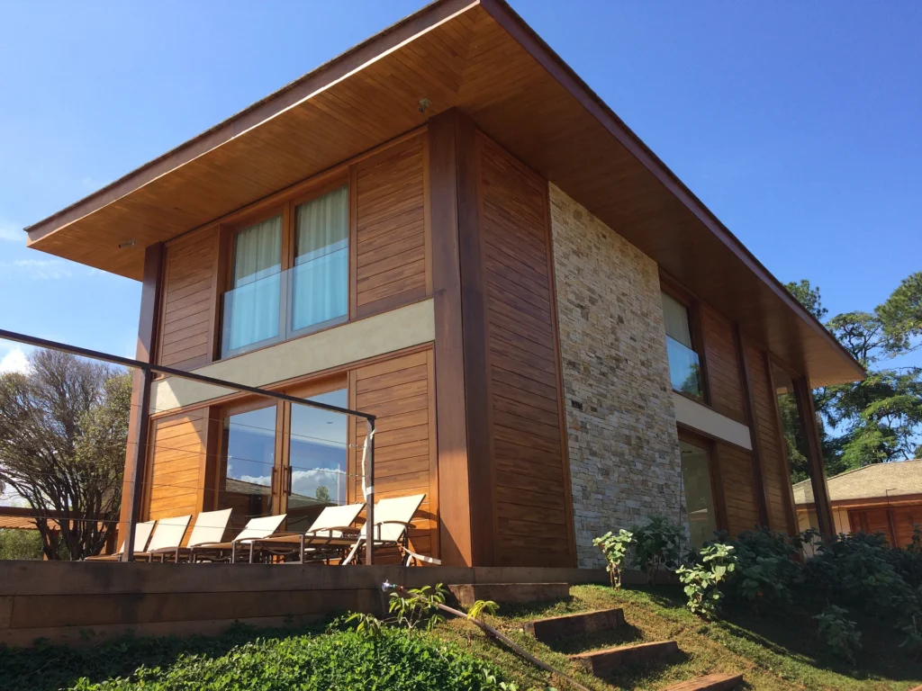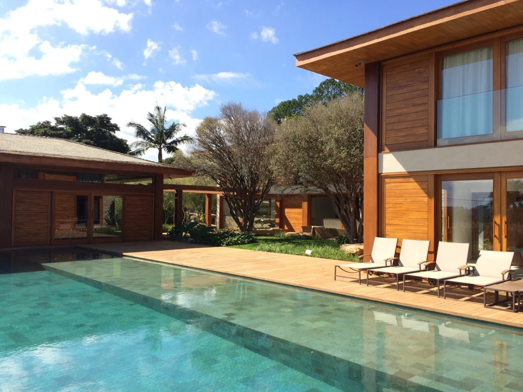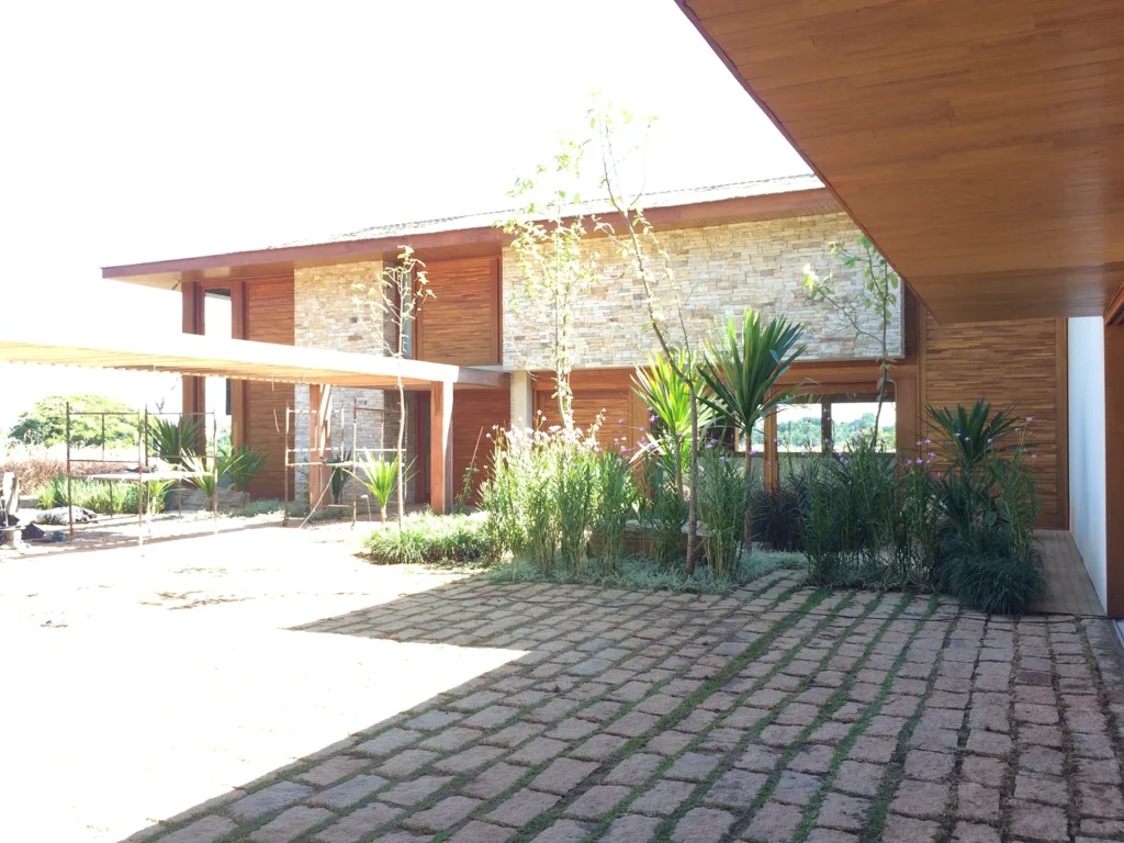 Concebida como uma casa contemporânea em um dos condomínios mais exclusivos do interior paulista, a residência explora amplos espaços e uma forte relação entre interior e exterior. A escolha de materiais naturais, como pedra natural e madeira, reforça a sensação de acolhimento e cria uma estética atemporal, típica da arquitetura residencial de luxo.