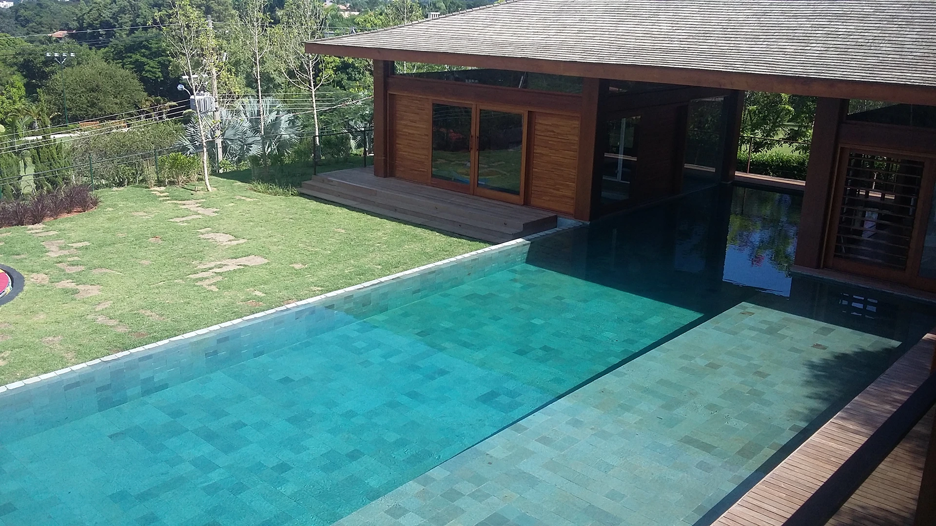 Entre os grandes destaques da casa está o spa integrado à piscina, pensado como um verdadeiro refúgio de bem-estar. O espaço pode ser acessado tanto pelo interior da residência quanto diretamente pela área externa, criando uma experiência única de lazer e relaxamento em uma casa com piscina e spa.