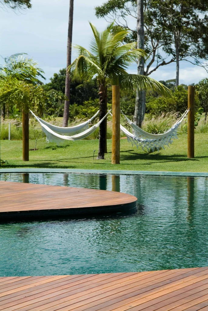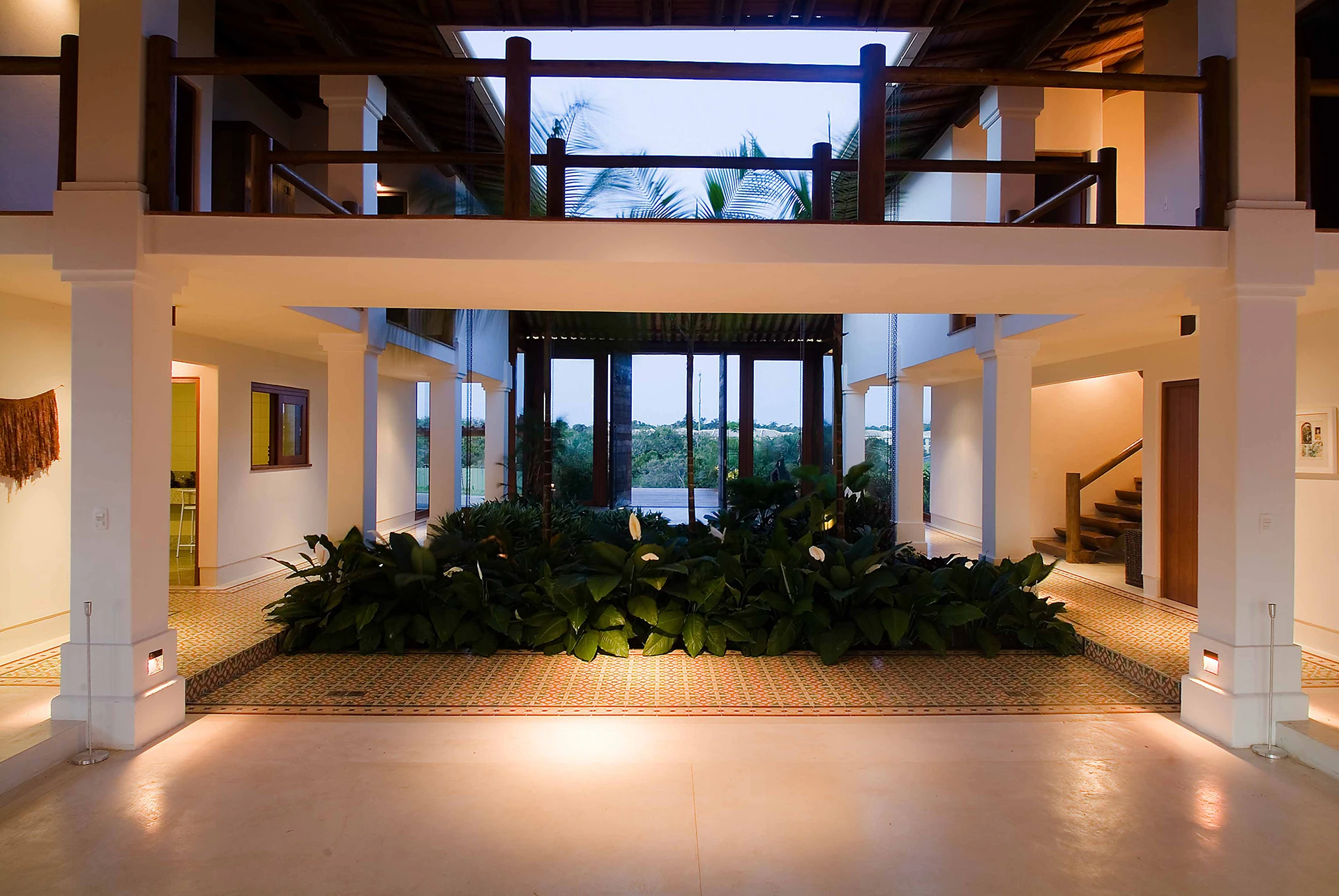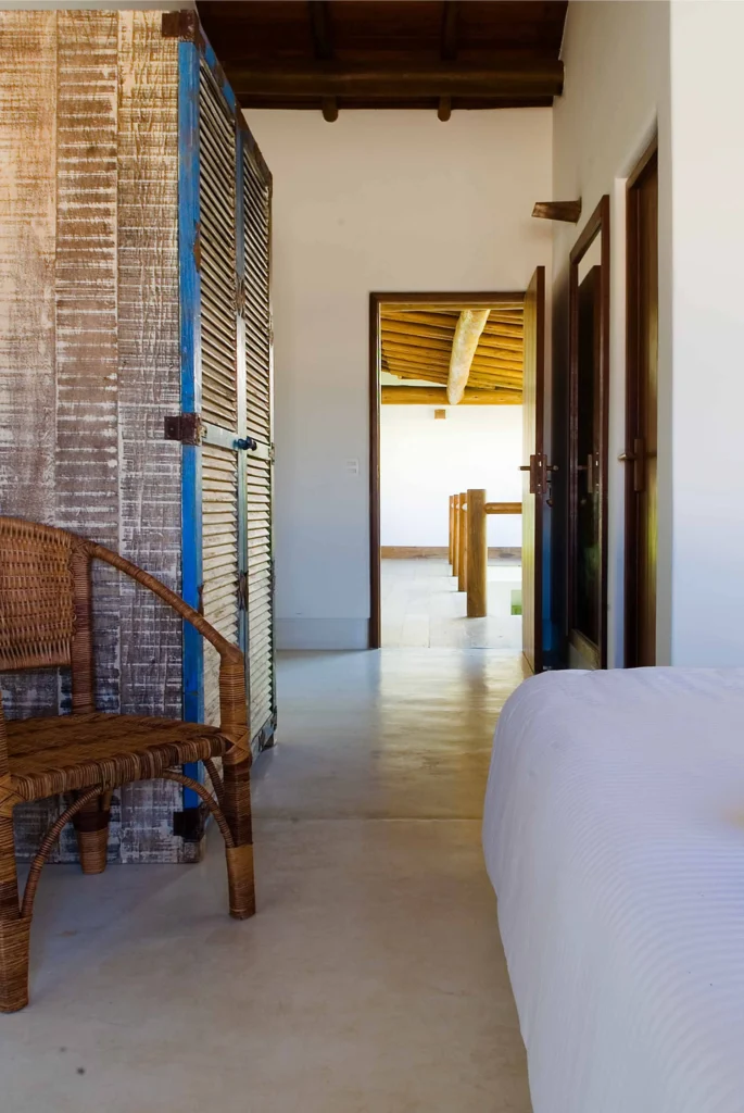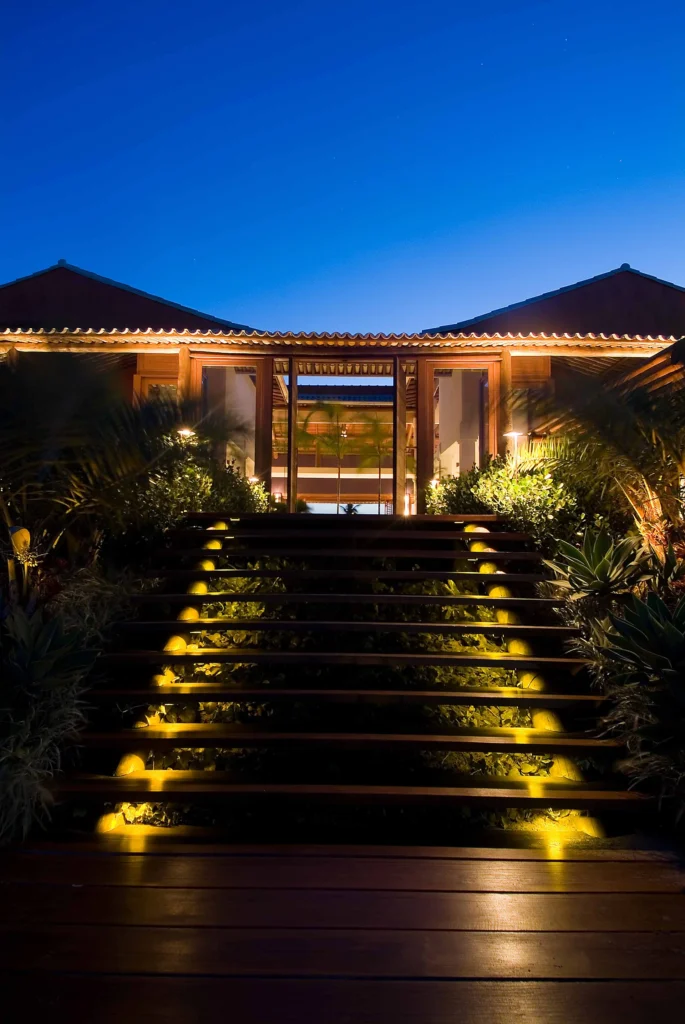 O grande destaque do projeto, além da piscina, é o jardim central, que organiza a casa e conecta toda a área íntima à natureza ao redor. A ventilação cruzada, sempre uma premissa nos projetos de David Bastos, garante conforto térmico e integração constante com o exterior. O deck em madeira e a escada de acesso, solução natural para o desnível acentuado característico de Trancoso, reforçam o caráter acolhedor e convidativo da casa, em perfeita sintonia com o ambiente.