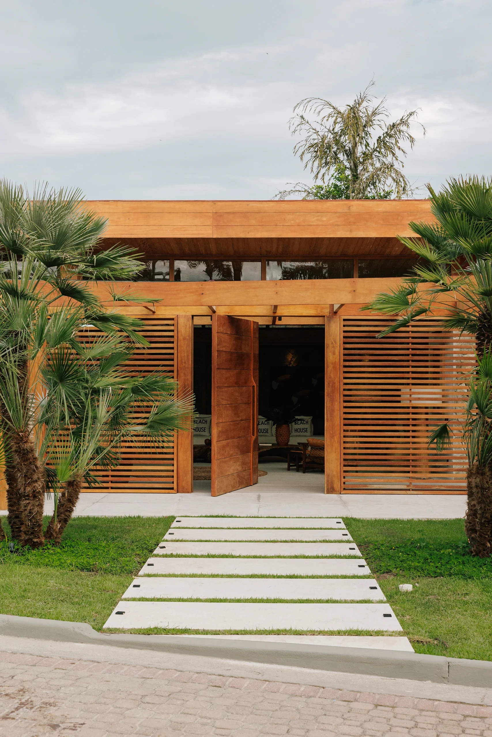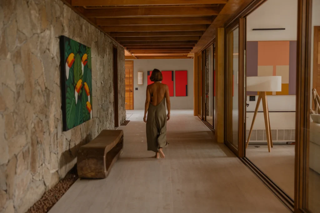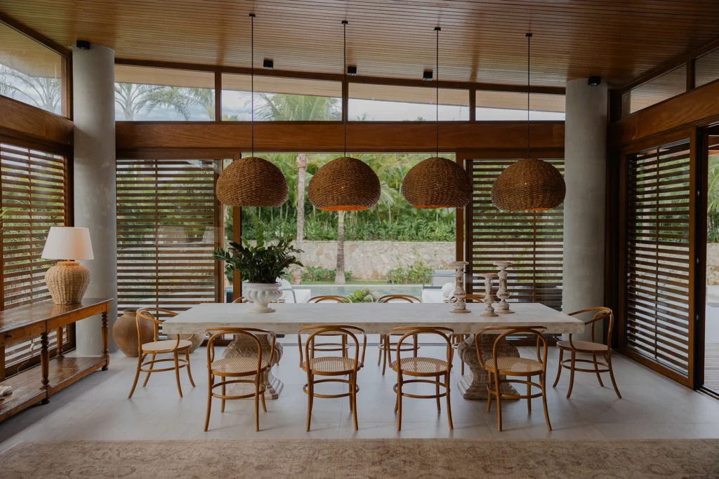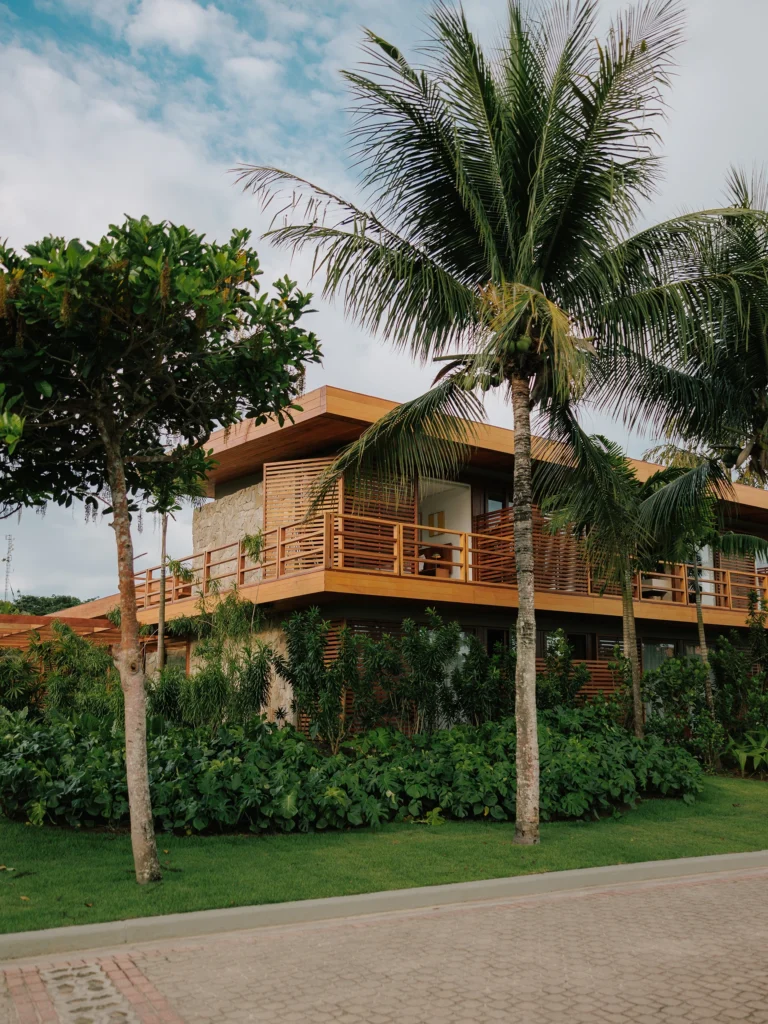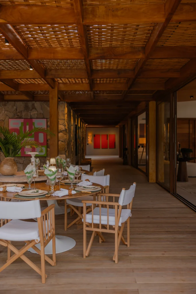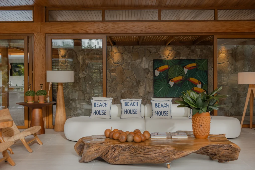 A estrutura integralmente em madeira define o caráter da casa e estabelece um diálogo direto com o entorno natural, elemento essencial na arquitetura de Trancoso. Grandes aberturas favorecem a entrada abundante de luz natural, reforçando a sensação de leveza dos espaços e a conexão constante entre interior e exterior.