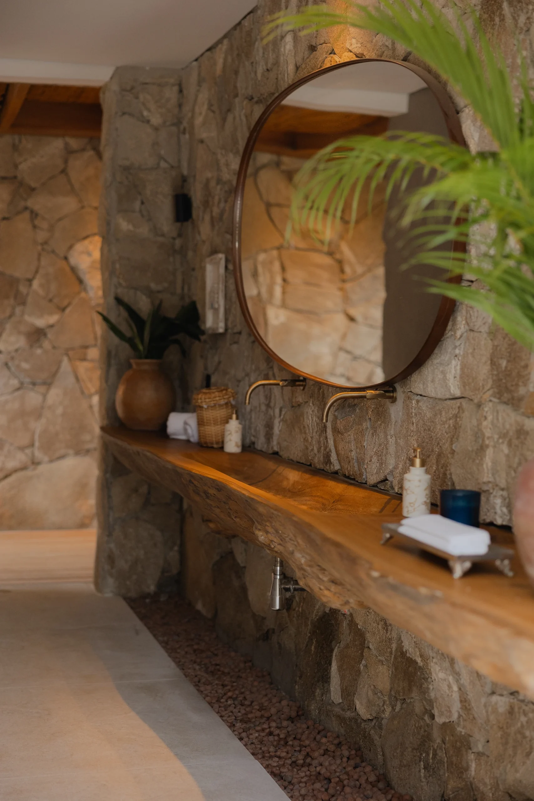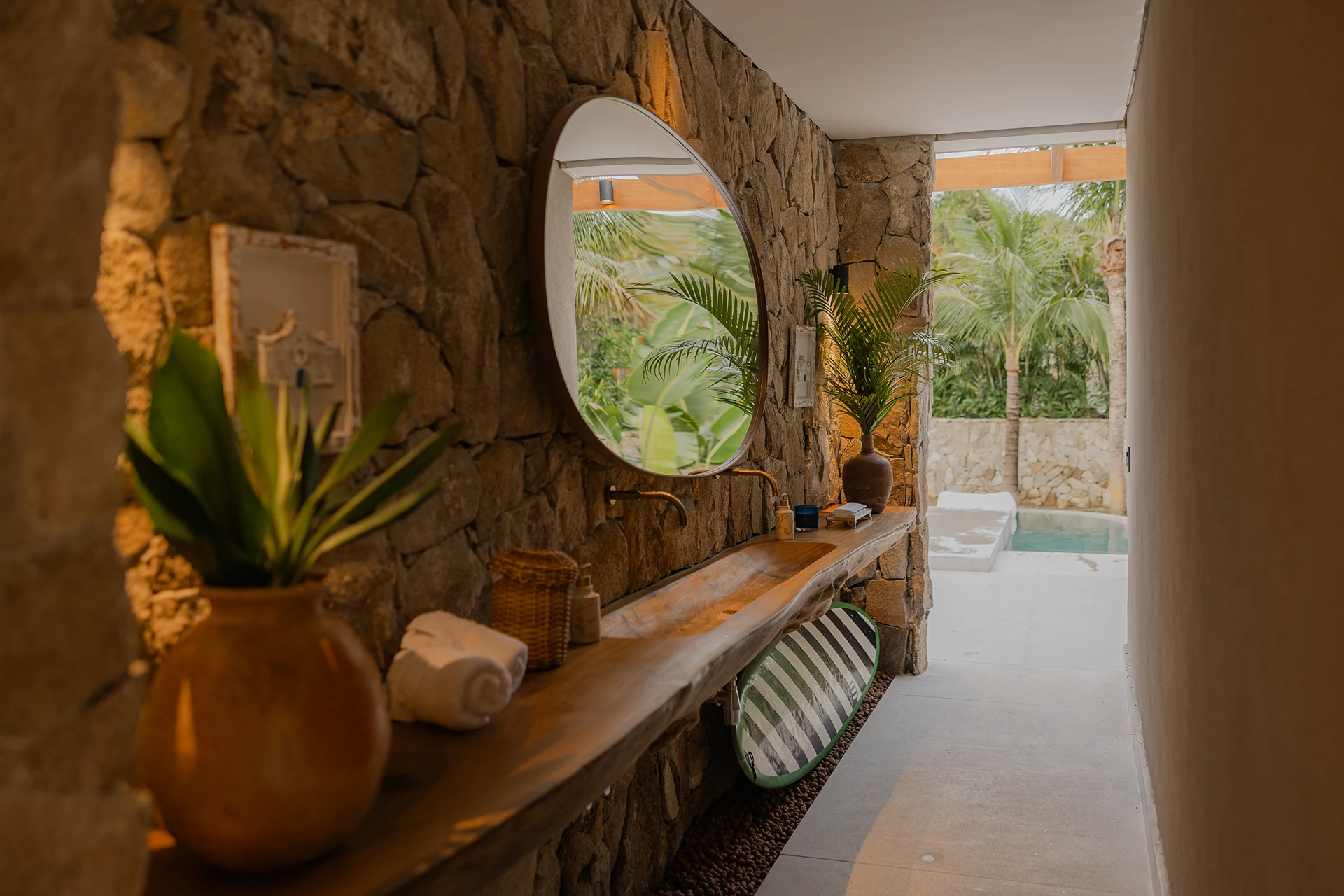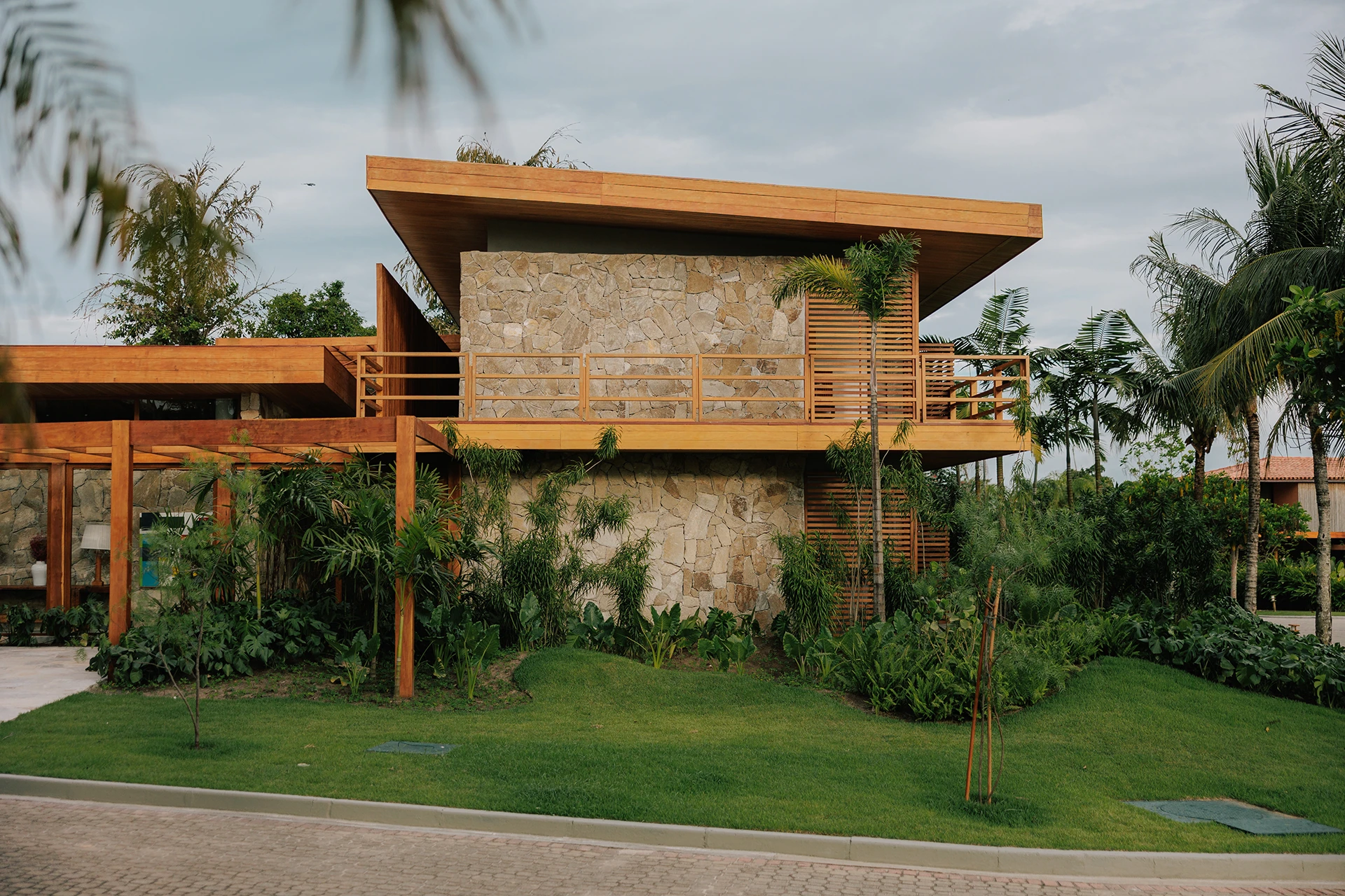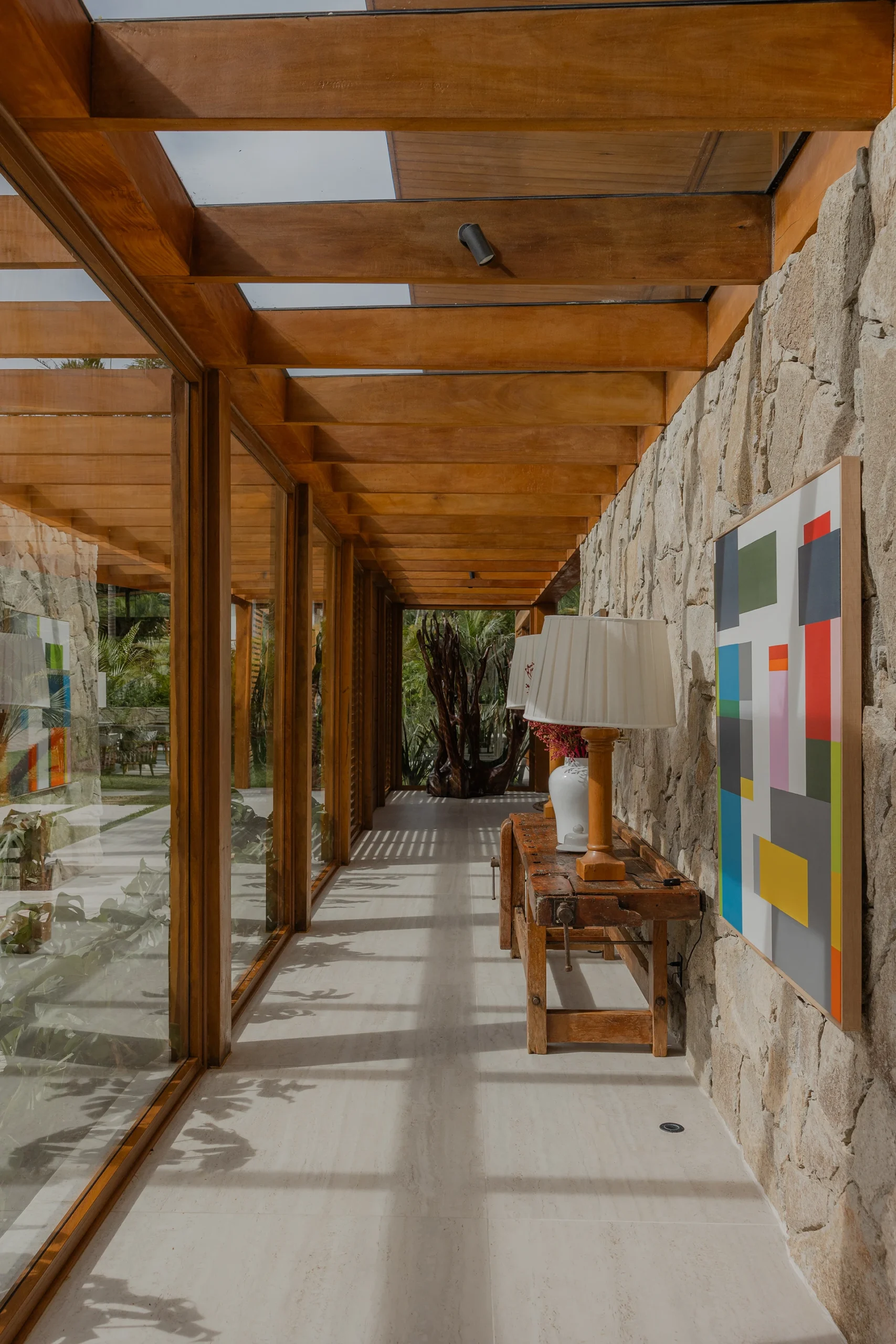 A estrutura integralmente em madeira define o caráter da casa e estabelece um diálogo direto com o entorno natural, elemento essencial na arquitetura de Trancoso. Grandes aberturas favorecem a entrada abundante de luz natural, reforçando a sensação de leveza dos espaços e a conexão constante entre interior e exterior.