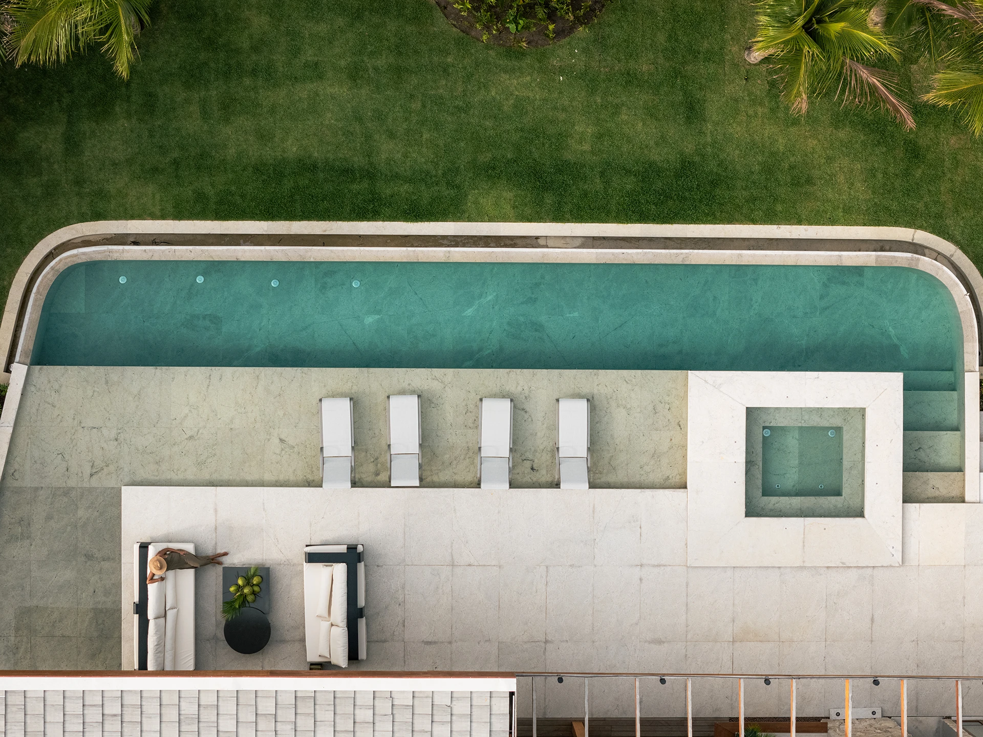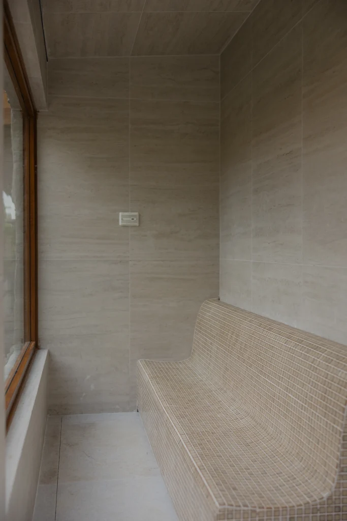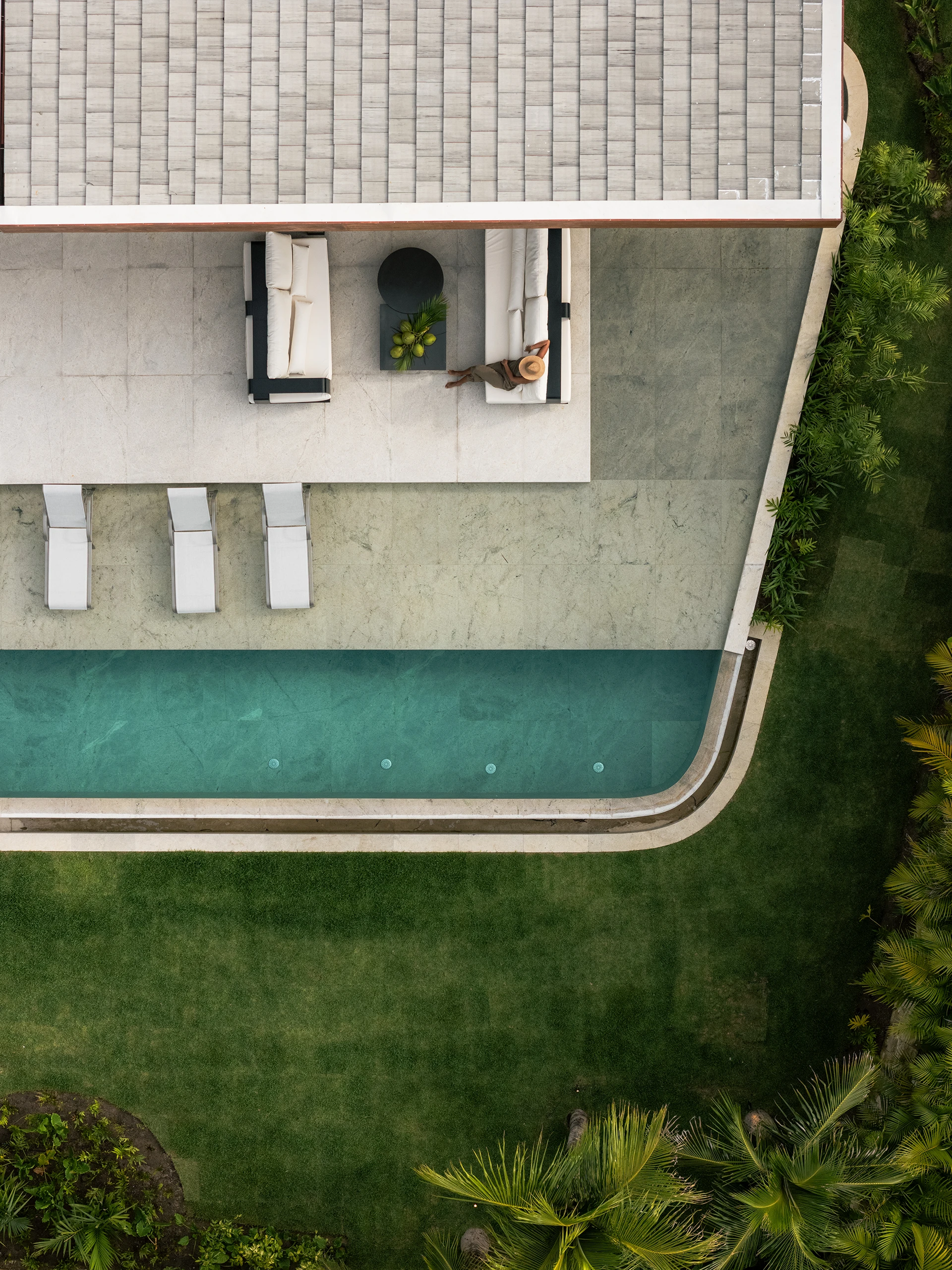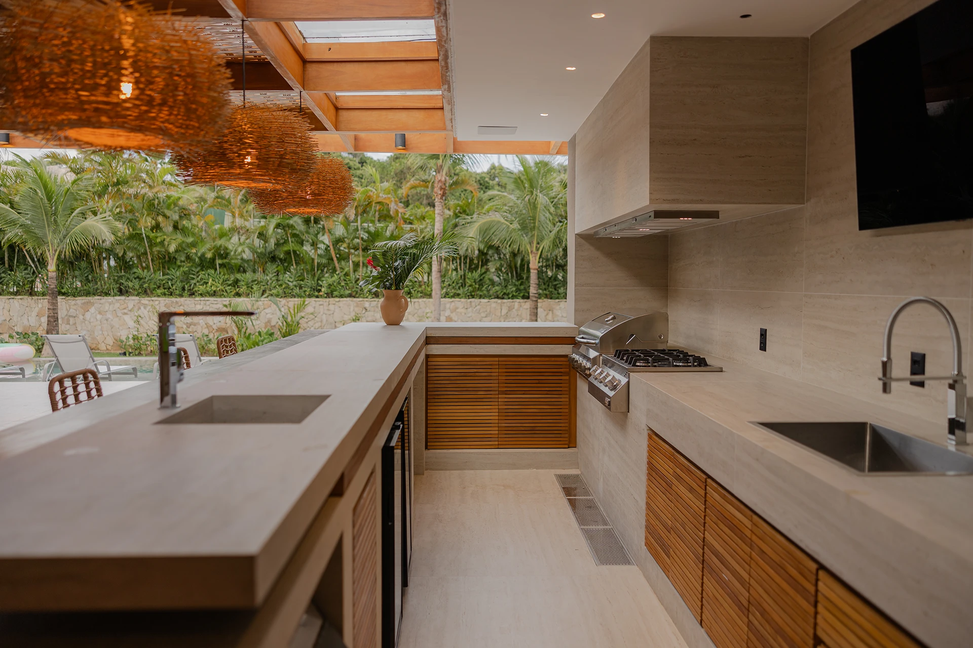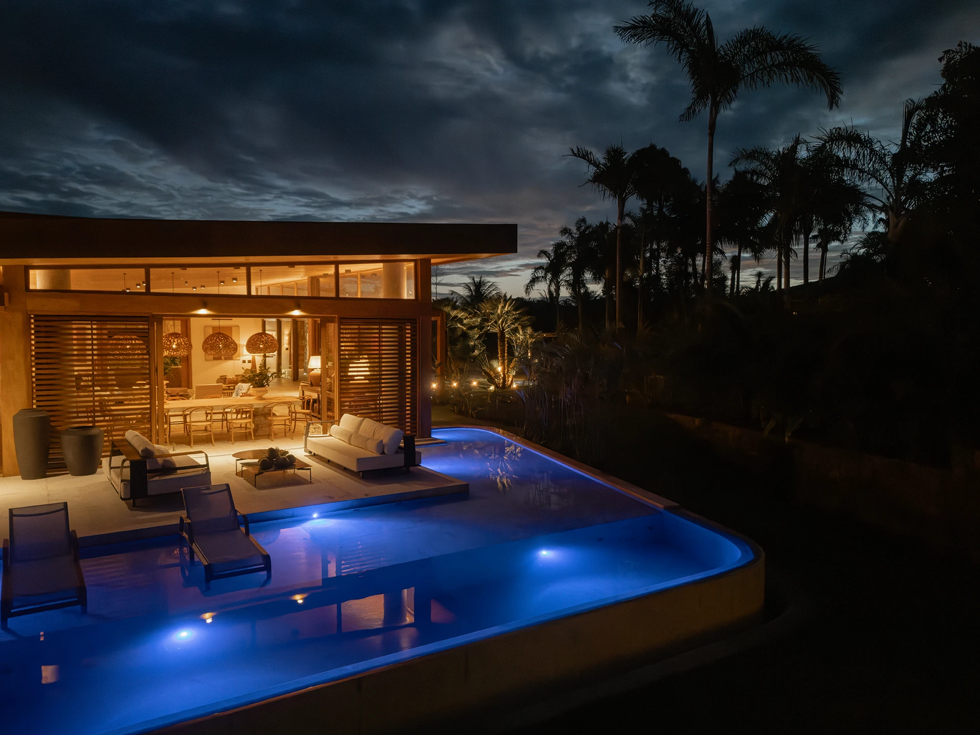 A área de lazer é um dos principais destaques do projeto. A piscina com borda infinita se projeta em direção à paisagem, criando continuidade visual e tornando-se protagonista do conjunto. Integrada a ela, a área gourmet foi pensada de forma coerente com o uso externo, oferecendo conforto e funcionalidade sem perder a harmonia com os materiais e a linguagem arquitetônica da casa.
