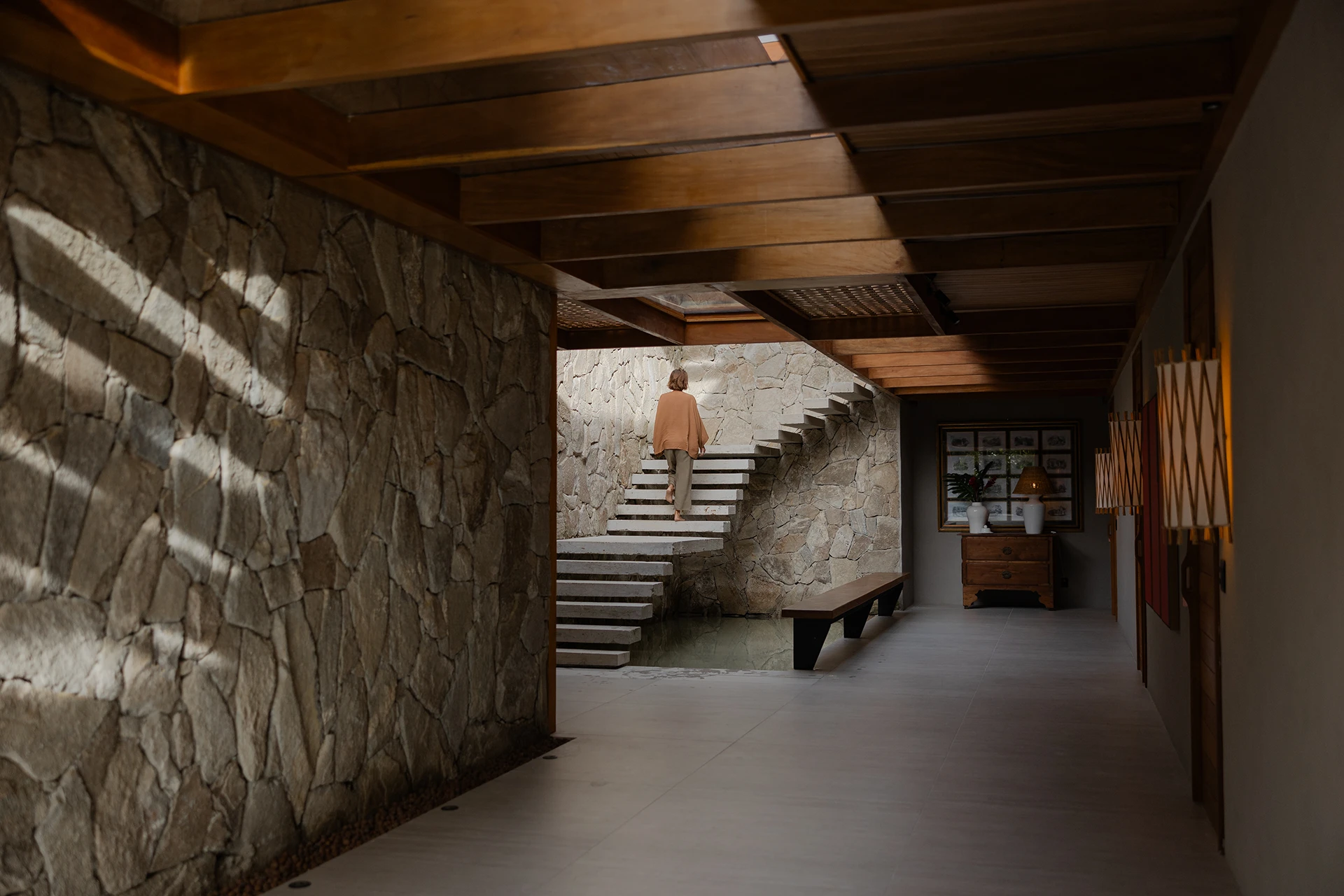 No interior, a escada assume papel central na composição dos espaços. Com degraus em concreto aparente, o elemento se destaca pelo contraste sutil com a estrutura de madeira, funcionando quase como uma peça escultórica. Em alguns planos verticais, o revestimento em pedra Moledo acrescenta textura e densidade ao projeto, equilibrando a leveza da madeira e reforçando o caráter natural da residência.