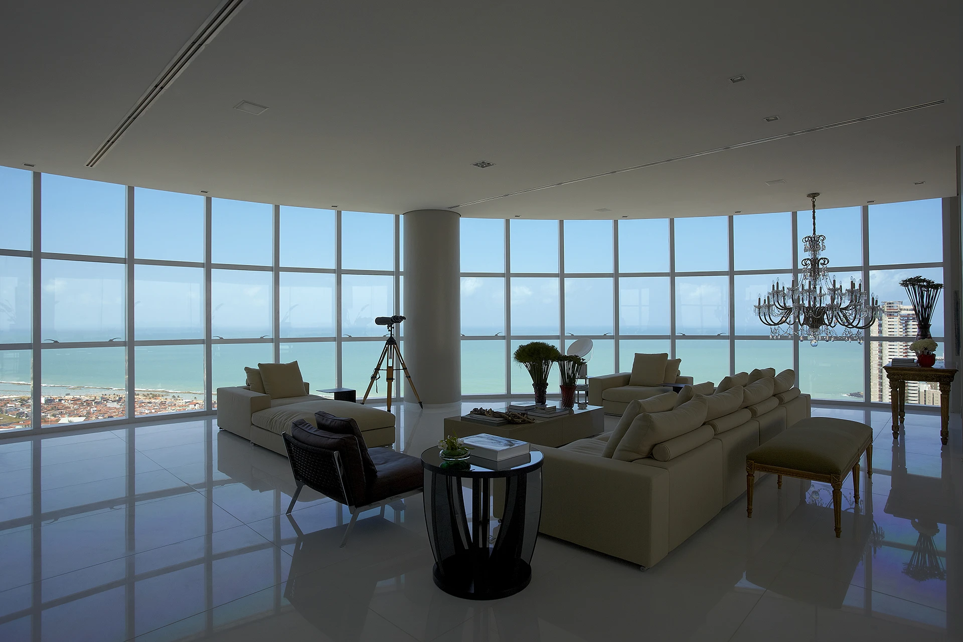 No topo do edifício, este triplex revela vistas pouco convencionais da Cidade do Sol, como Natal é conhecida. O projeto arquitetônico soube potencializar esse privilégio ao transformar a configuração original do imóvel. A família, que dispunha de quatro pavimentos consecutivos, optou por suprimir um deles, conquistando mais de três metros de pé-direito — uma condição rara em apartamentos novos — e ampliando a sensação de espaço e luminosidade.