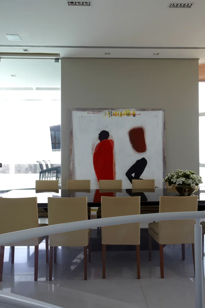 Sem excessos decorativos, os ambientes privilegiam a fluidez da circulação e permitem que o olhar se detenha nos detalhes e na qualidade das peças de linhagem nobre. A mesa de jantar para doze lugares torna-se o ponto de encontro da família, reunindo pais e cinco filhos em momentos de convivência e celebração.