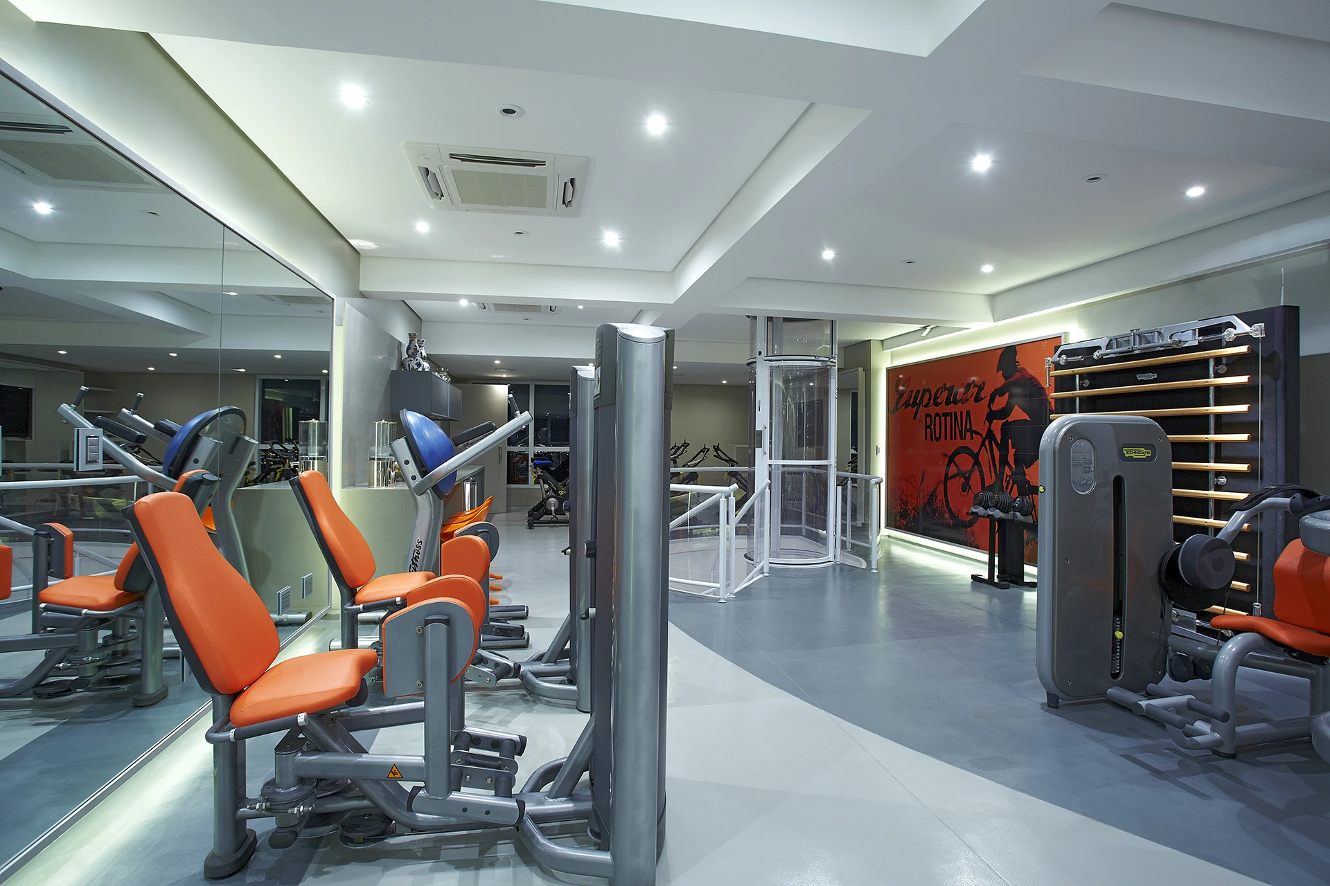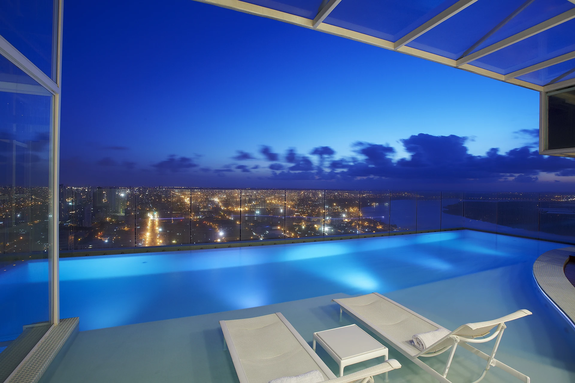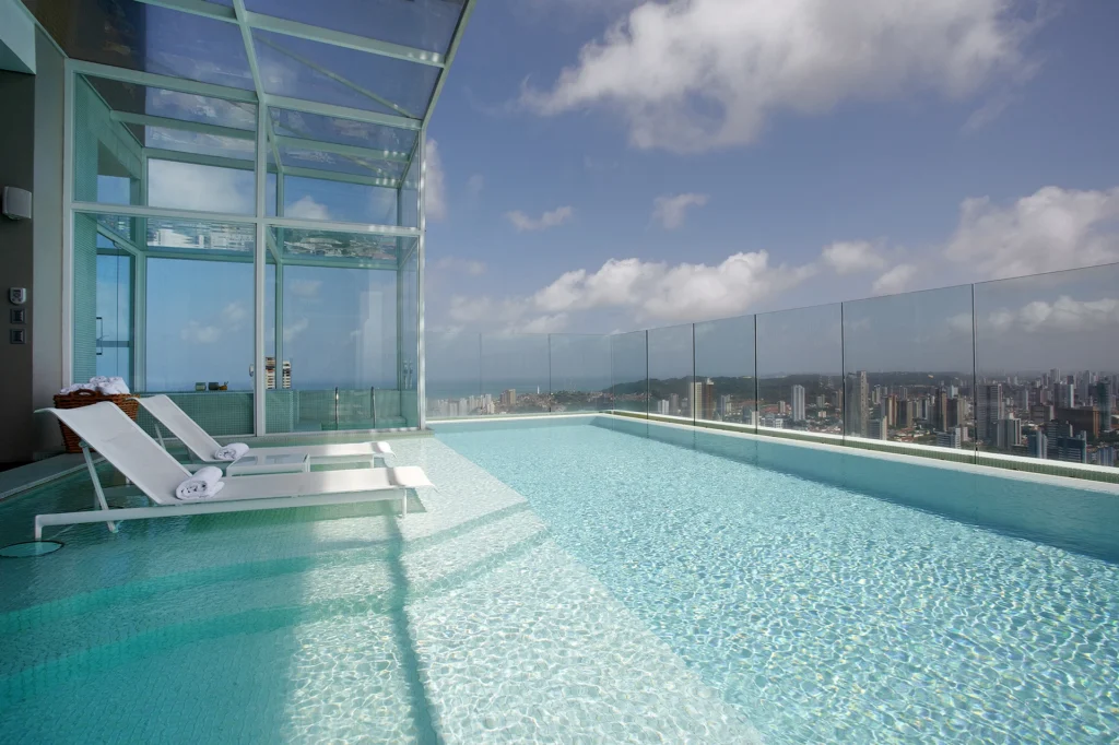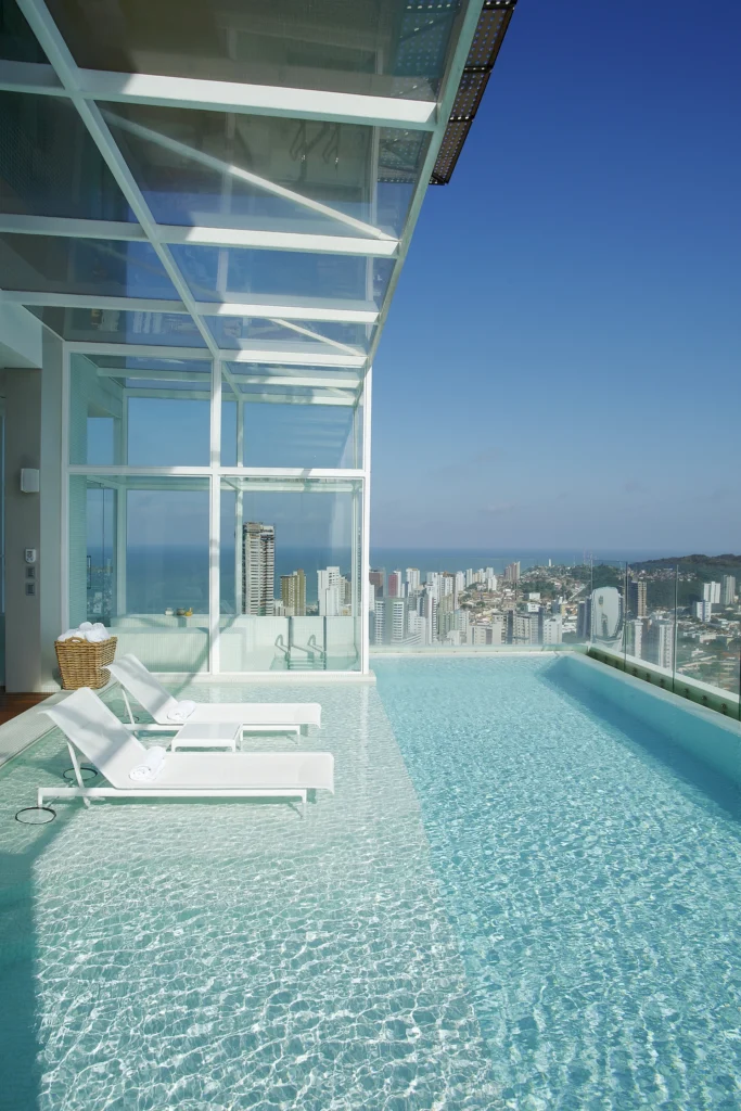 O pavimento superior abriga os espaços dedicados ao lazer e ao bem-estar, como a academia e a área de massagens, fechadas por estrutura de PVC e vidro, mantendo a leveza visual. Esses ambientes se articulam com a piscina localizada no nível intermediário, cuja borda se estende até o limite do edifício. O guarda-corpo translúcido reforça a sensação de continuidade, fazendo com que a água pareça se projetar em direção ao horizonte. As chaises dispostas ao sol completam o cenário, convidando a pausas despreocupadas e a um brinde à liberdade.