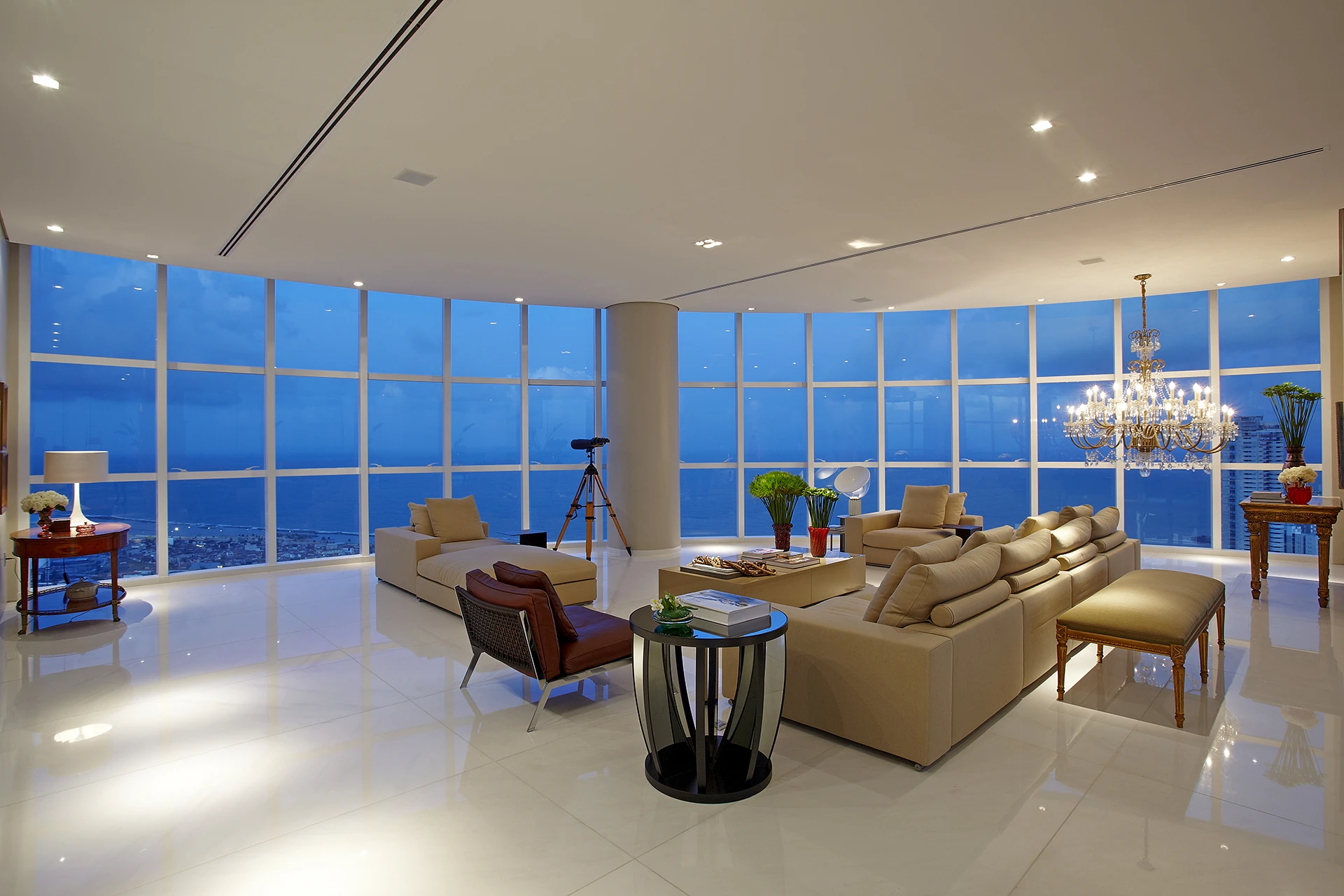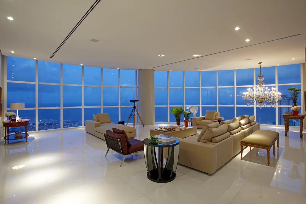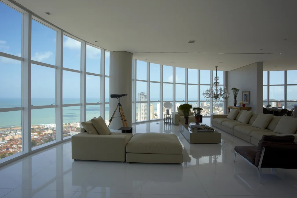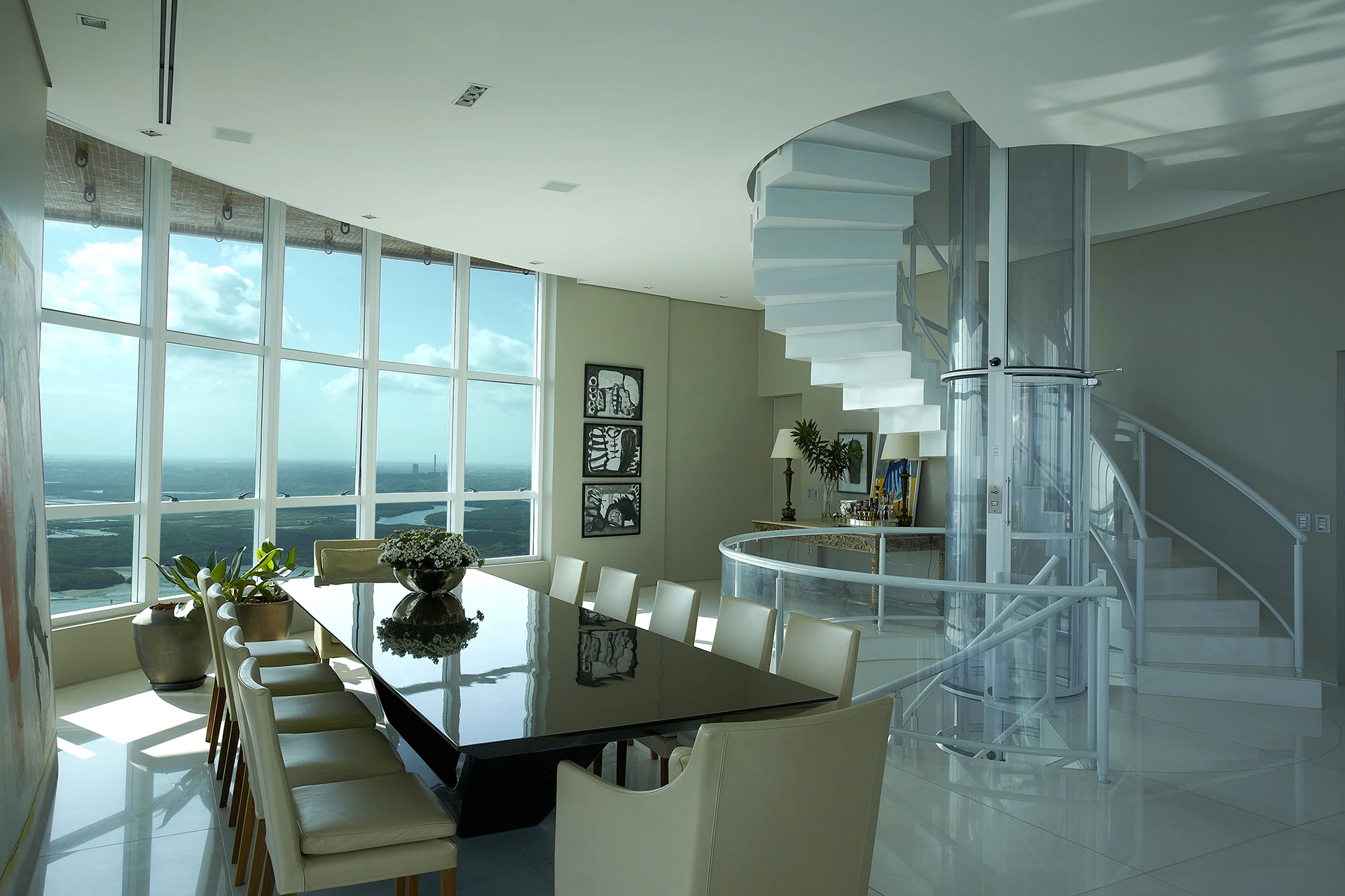 A altura generosa, somada ao perímetro quase integral de fachadas envidraçadas, cria um impacto visual marcante e estabelece uma relação direta entre interior e paisagem. No segundo pavimento, onde se localiza a área social, o piso inteiramente revestido em mármore serve de base para um equilíbrio preciso entre mobiliário de linhas modernas e composição simétrica e peças de caráter nostálgico, como elementos em cristal inspirados no estilo Luís XV.