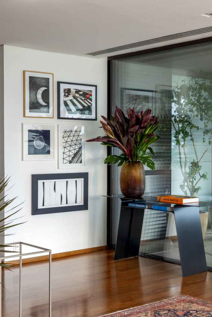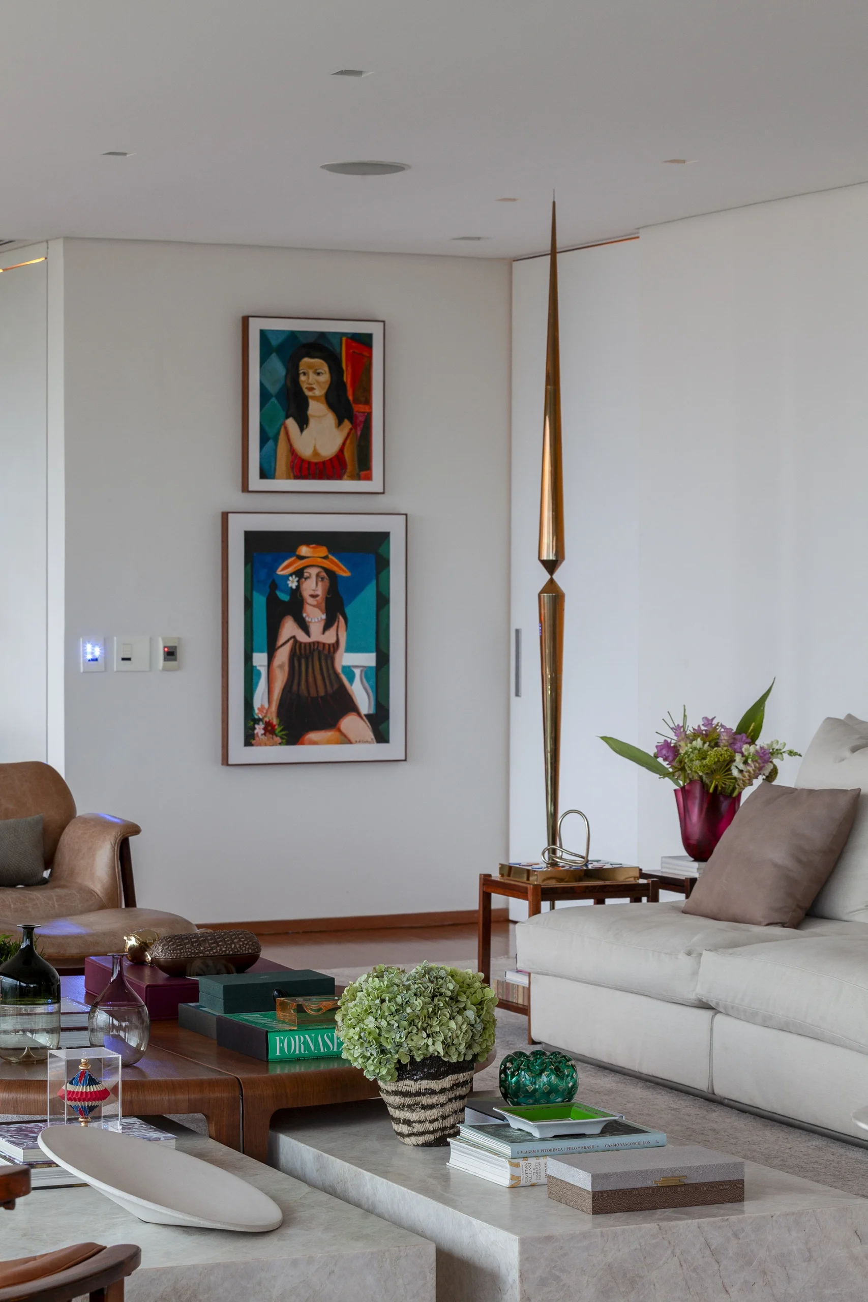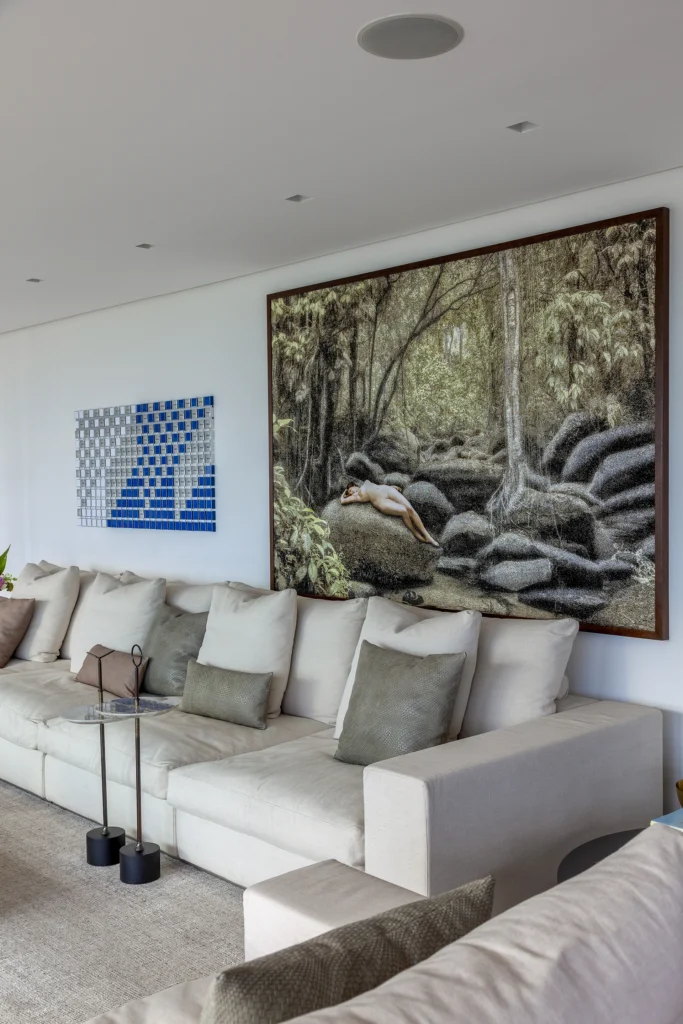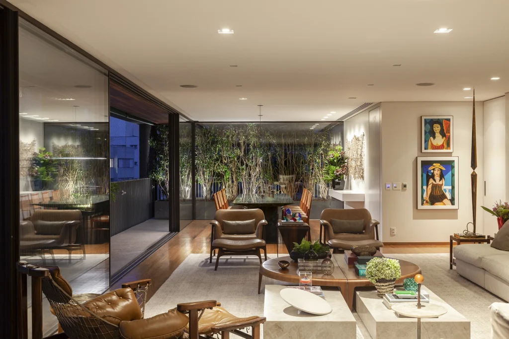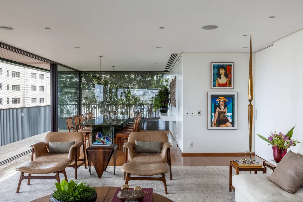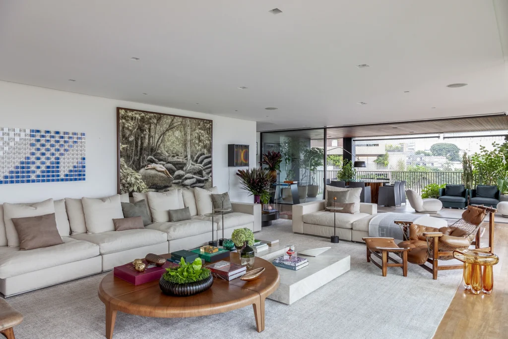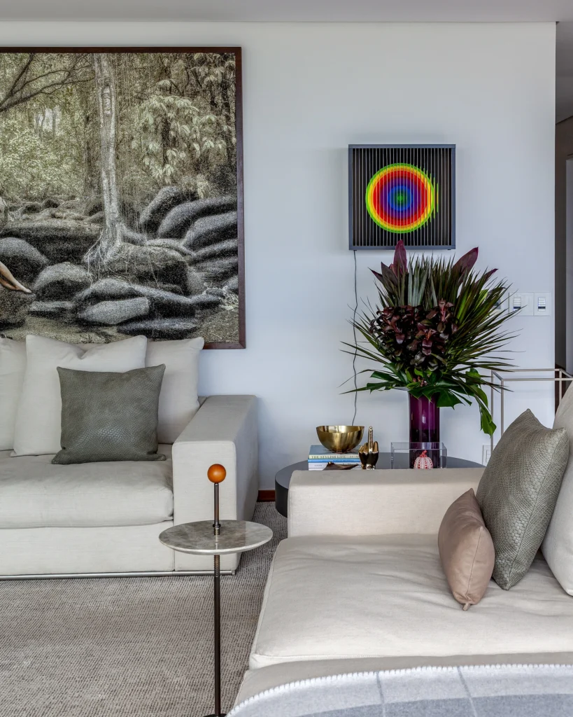O layout, riscado pessoalmente por David Bastos, priorizou peças icônicas que unem conforto familiar e sofisticação. No living, o sofá Flexform e a mesa de centro Giorgetti estabelecem um diálogo contemporâneo com as poltronas Gubi, comercializadfos no Brasil pela Casual Móveis. O projeto também celebra a história dos moradores ao integrar a poltrona Jangada, peça do acervo da cliente, à nova composição.