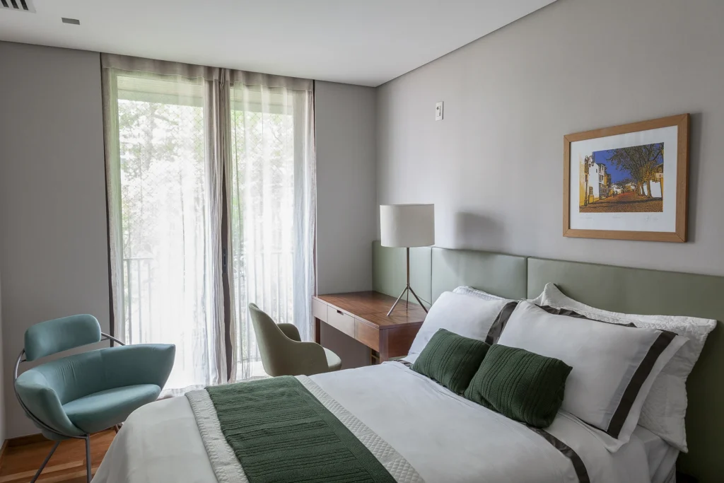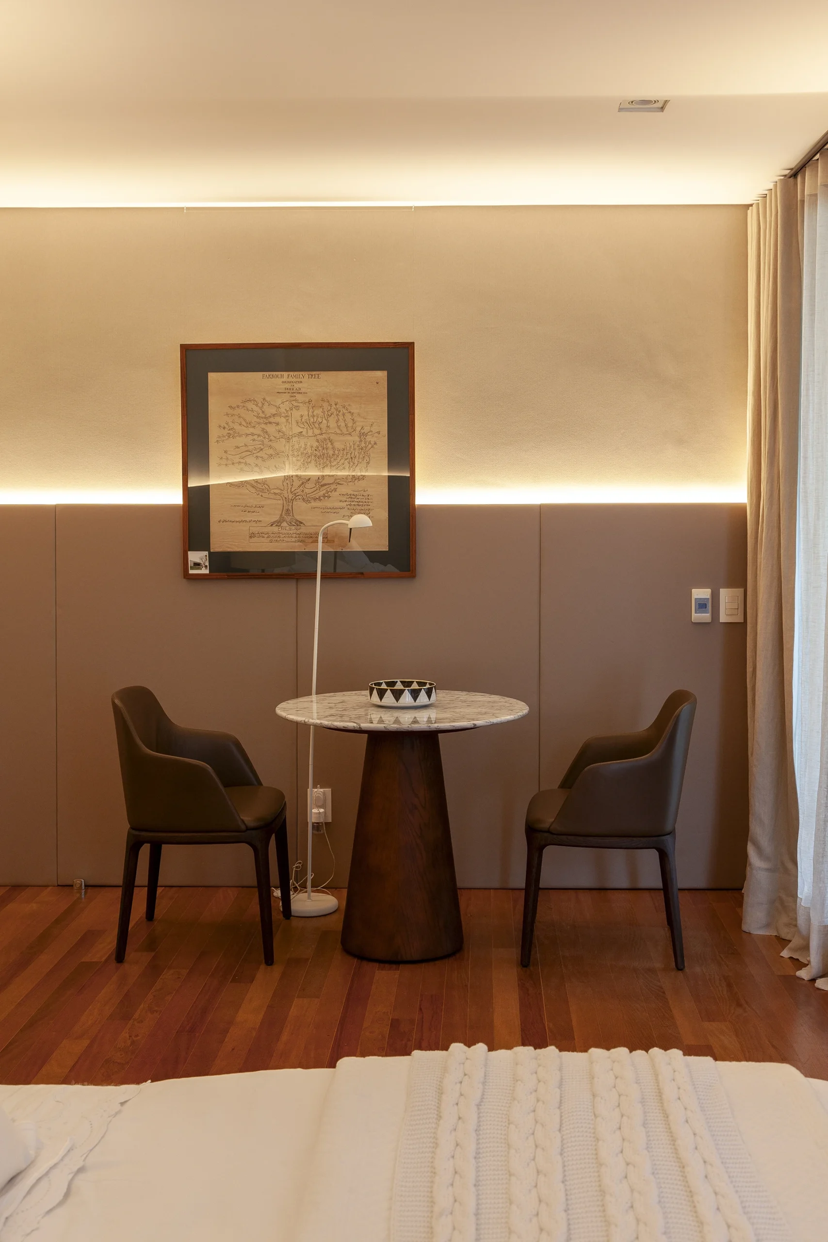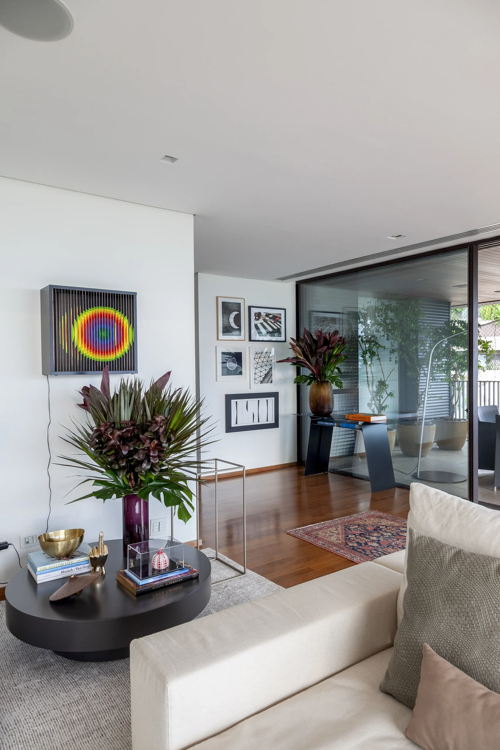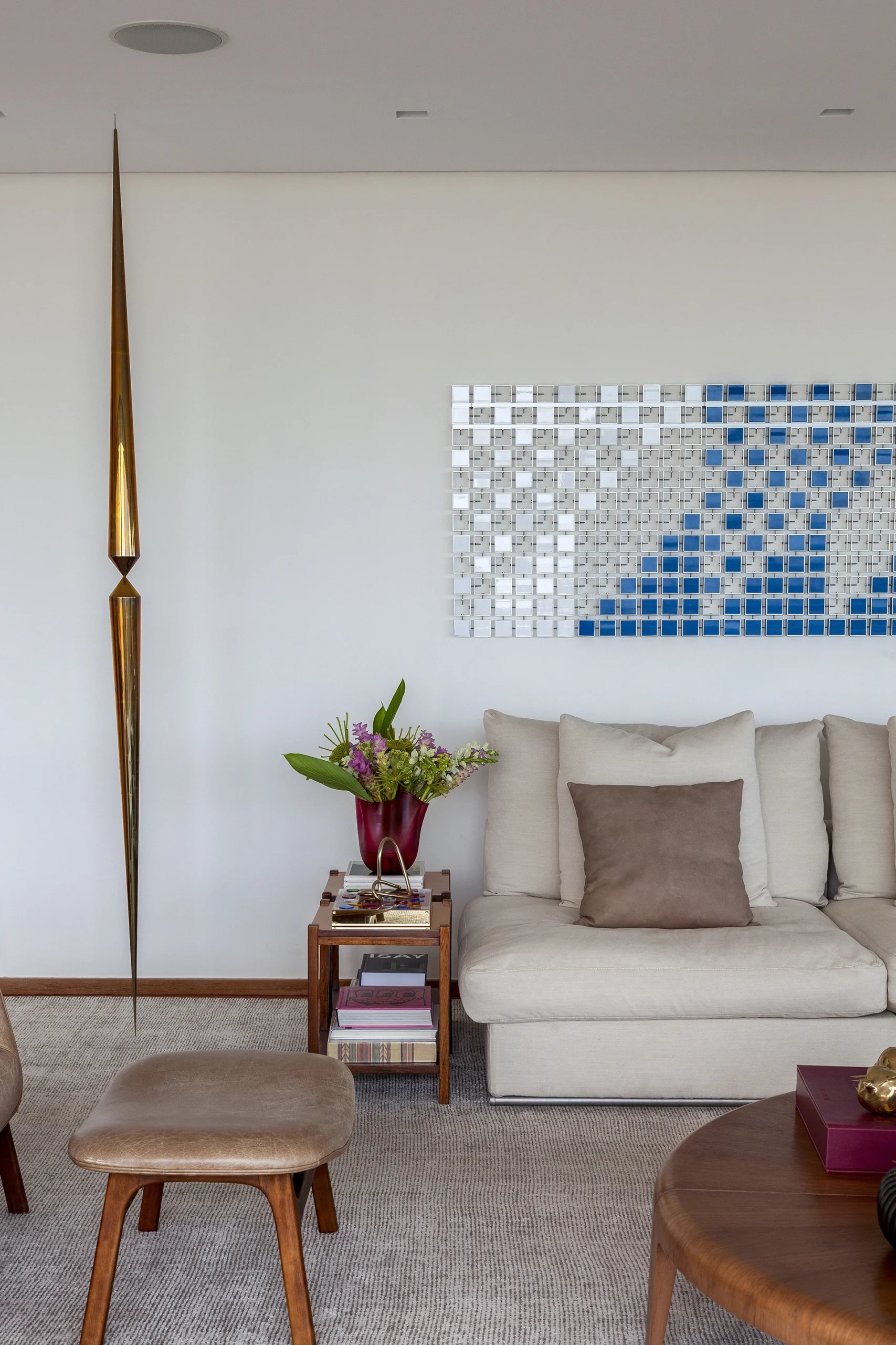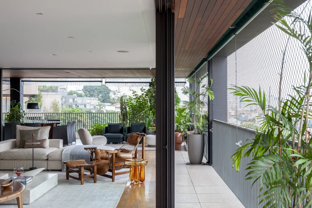 O layout, riscado pessoalmente por David Bastos, priorizou peças icônicas que unem conforto familiar e sofisticação. No living, o sofá Flexform e a mesa de centro Giorgetti estabelecem um diálogo contemporâneo com as poltronas Gubi, comercializadfos no Brasil pela Casual Móveis. O projeto também celebra a história dos moradores ao integrar a poltrona Jangada, peça do acervo da cliente, à nova composição.