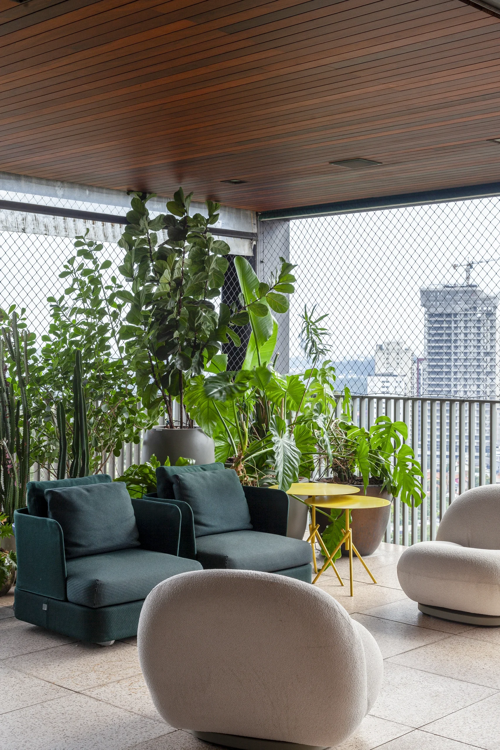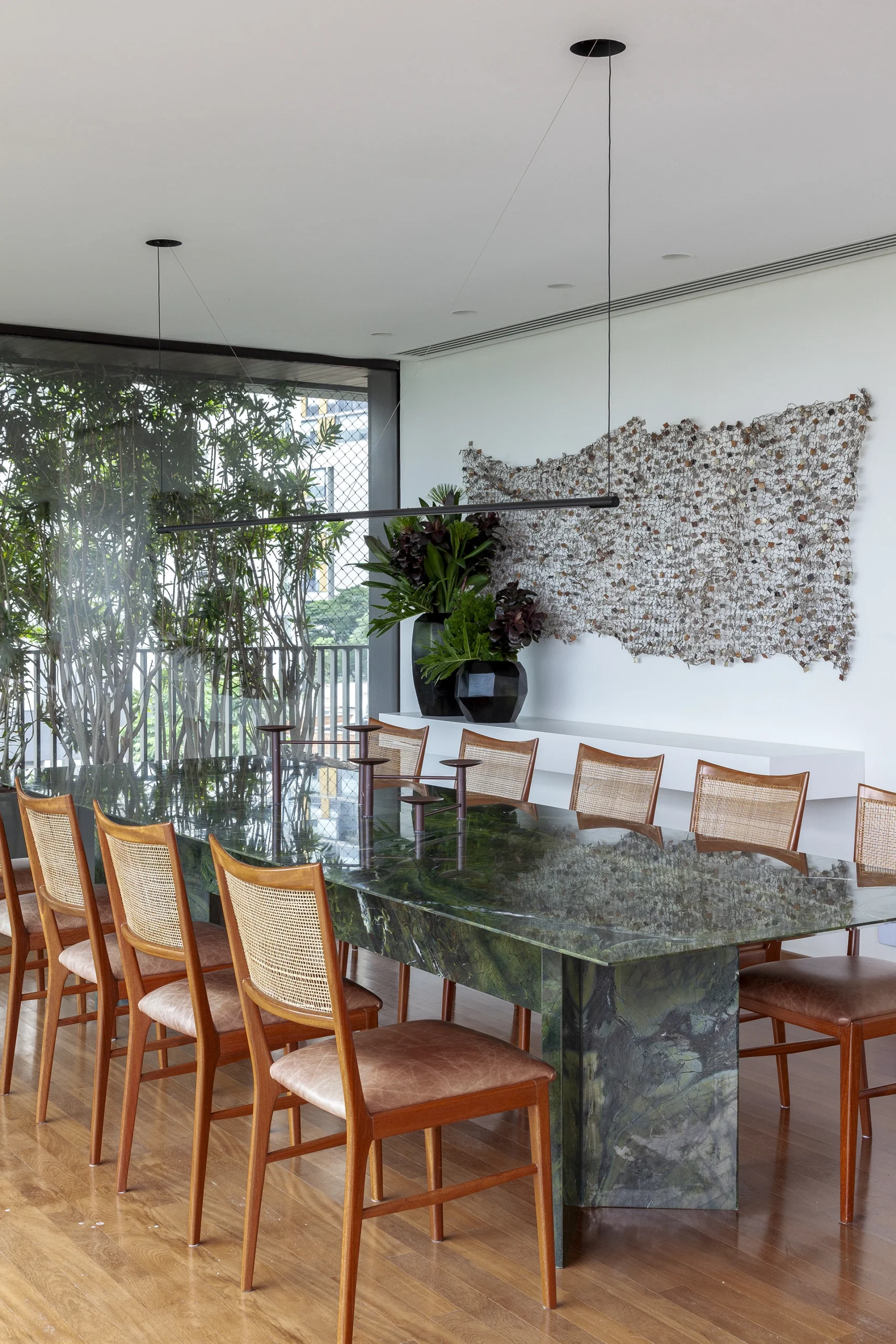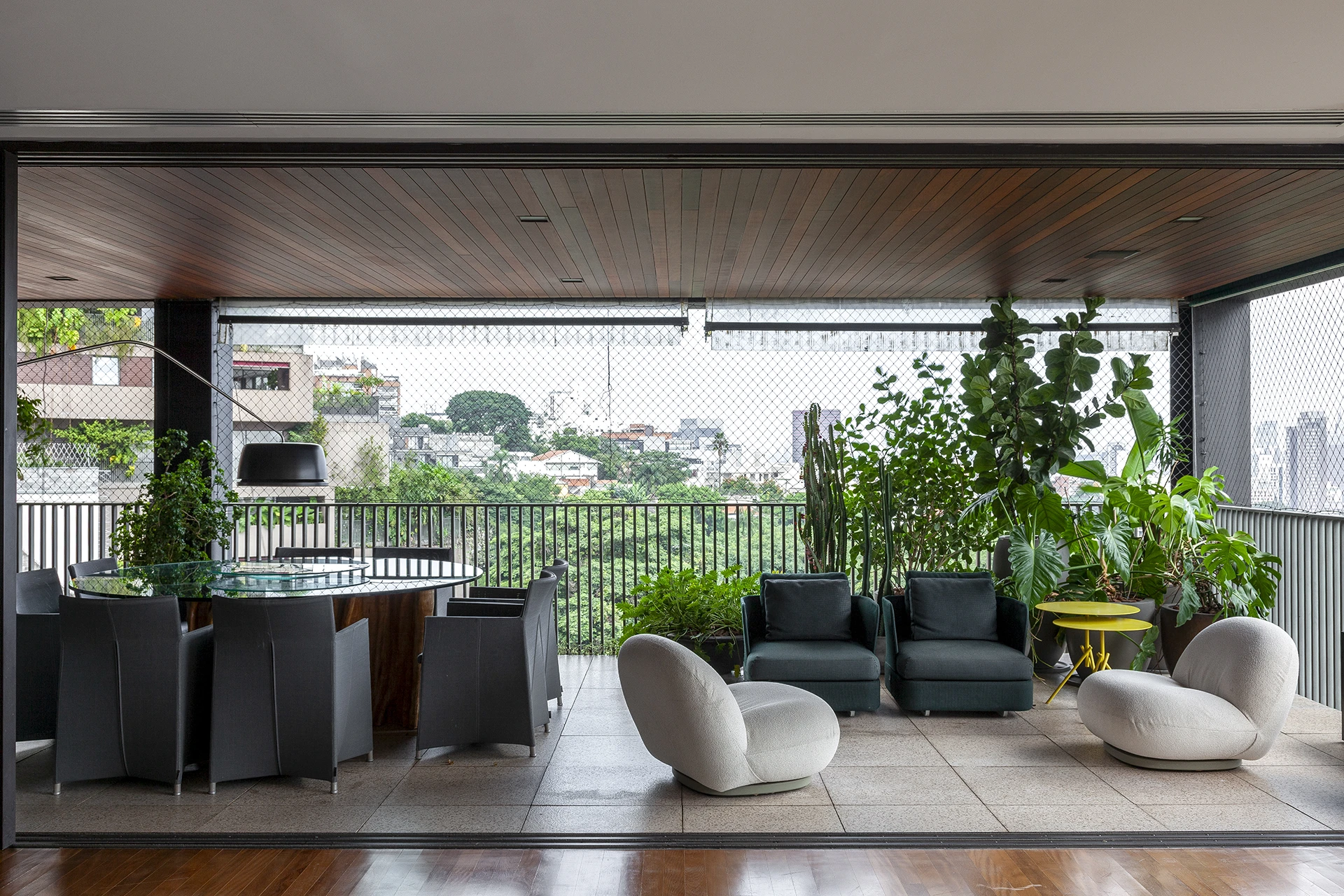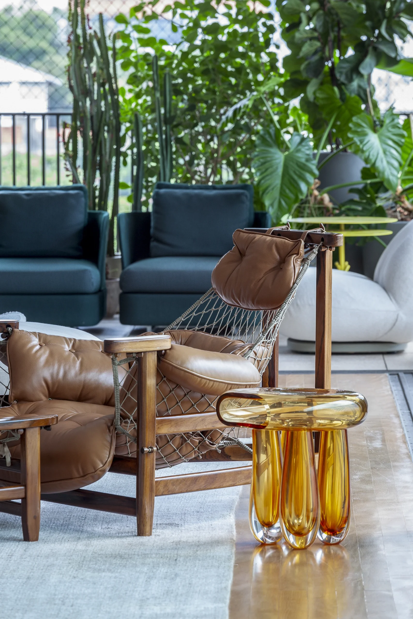 A exclusividade aparece no detalhe: a mesa de jantar foi desenhada por David Bastos e produzida em pedra Vitória Régia da Brasigran, criando um ponto focal escultural sobre o tapete Phenicia. Para a área externa, a resistência e o design orgânico das marcas Cane-line e Paola Lenti garantem o lazer da família com máxima elegância.