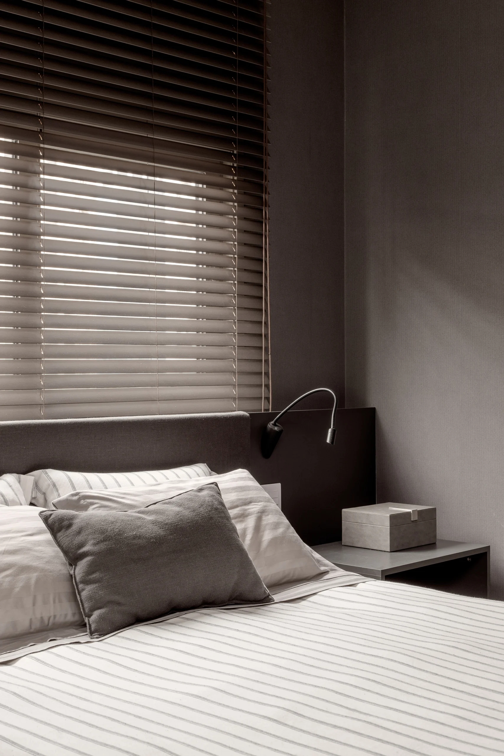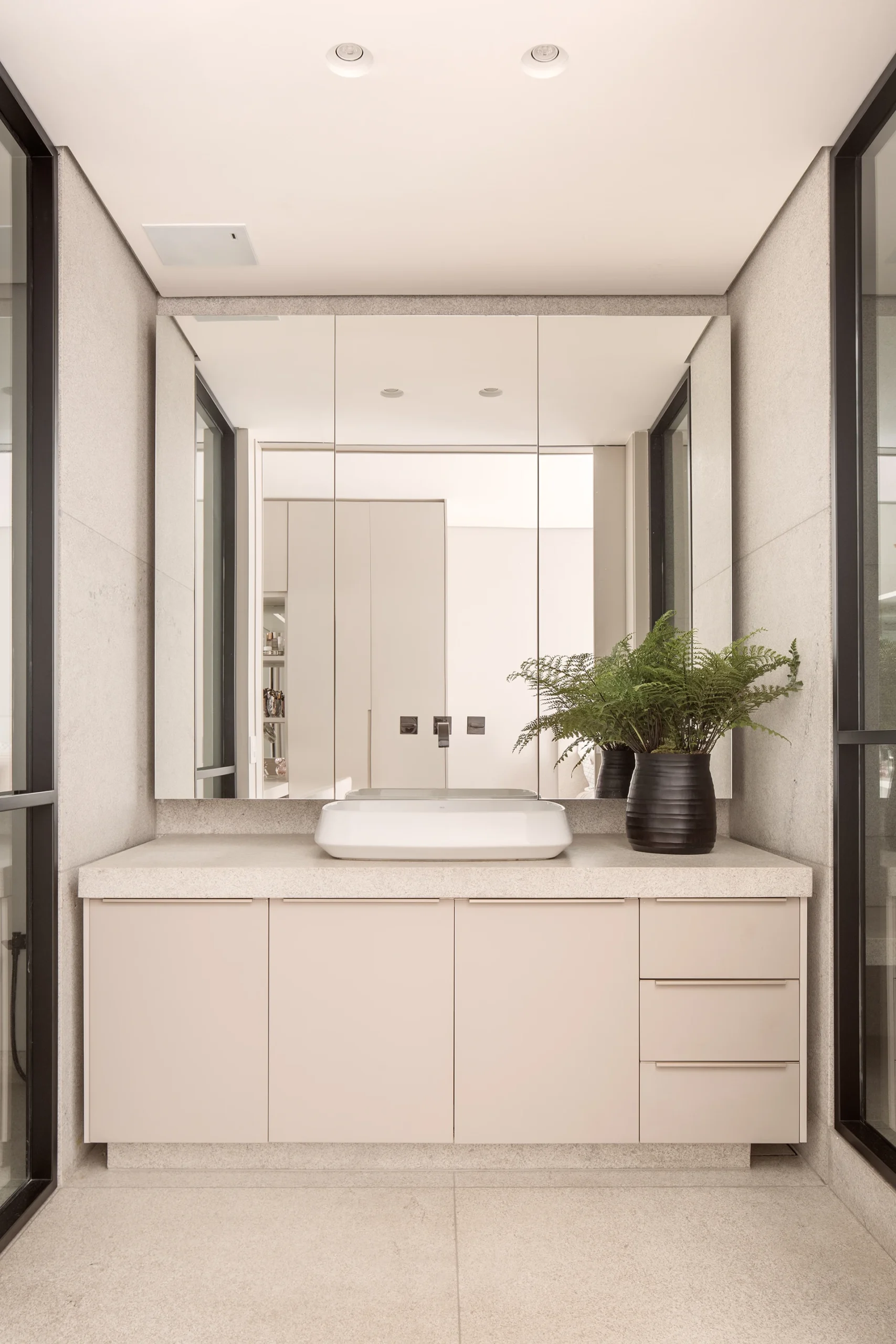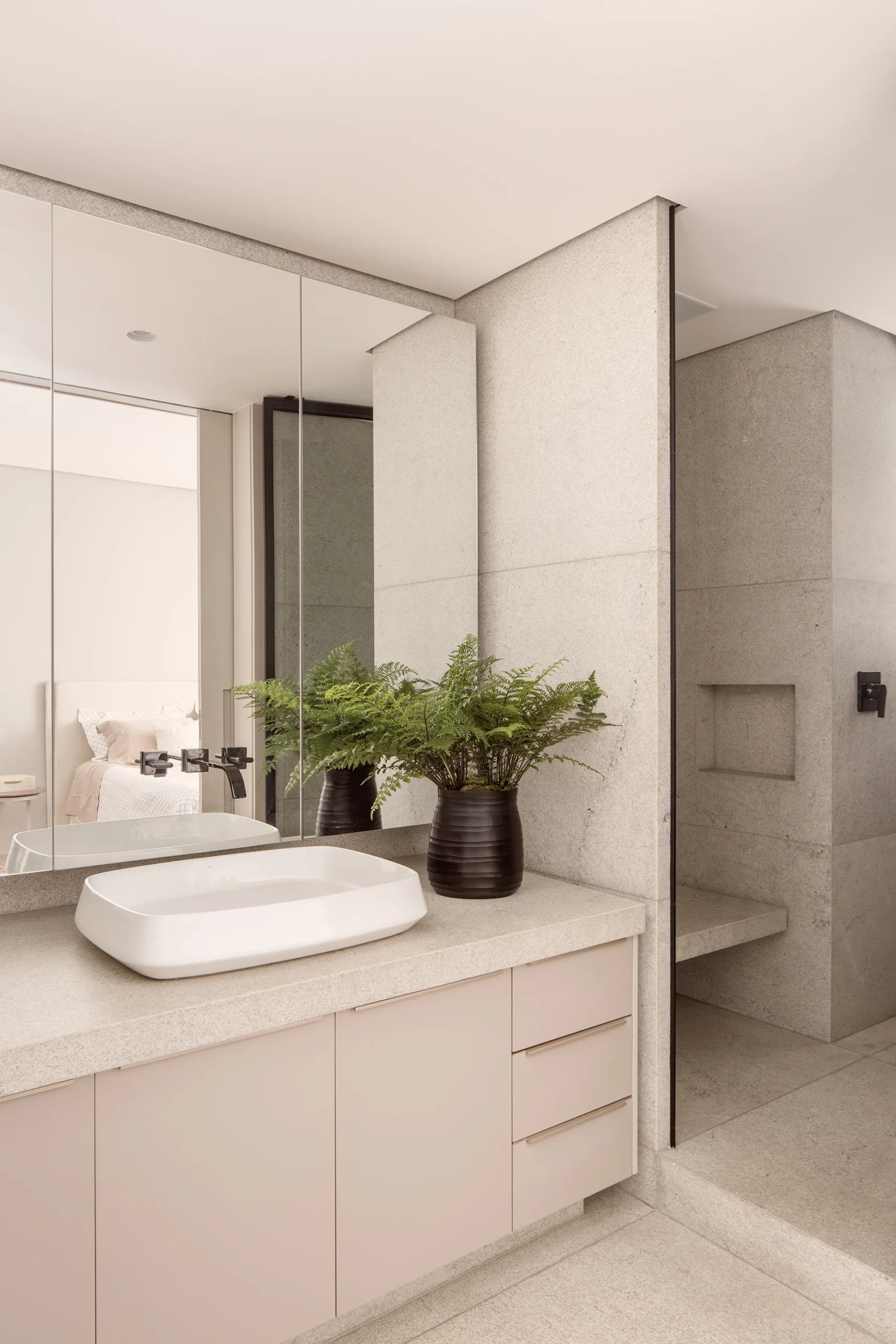 O conceito do projeto parte de uma atmosfera contemporânea, leve e acolhedora, destacada por uma paleta neutra em tons de cinza e bege claro, reforçando suavidade e elegância. Somente a suíte do filho recebeu uma composição mais sóbria, de caráter masculino, com materiais uniformes em tons fechados.