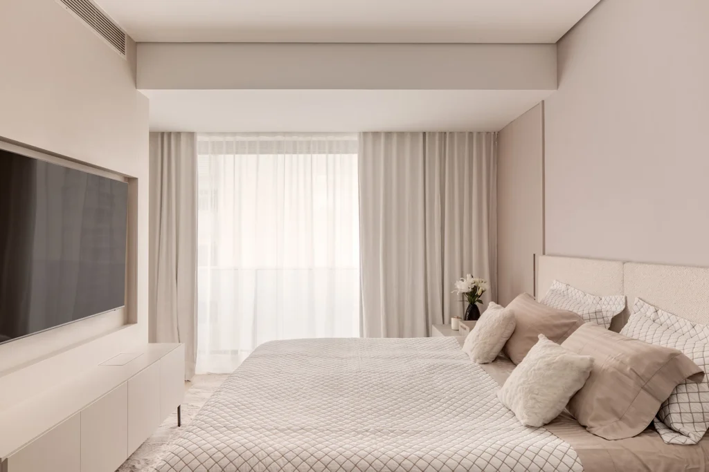 A suíte master segue o mesmo caminho de elegância e serenidade: tecido Entreposto na cabeceira, enxoval, pufe e almofadas, que se harmonizam com as cortinas em JRJ, reforçando o cuidado entre texturas e tonalidades. Na suíte do filho, o uso contínuo de materiais — da cabeceira ao papel de parede e marcenaria — garante unidade e sobriedade.