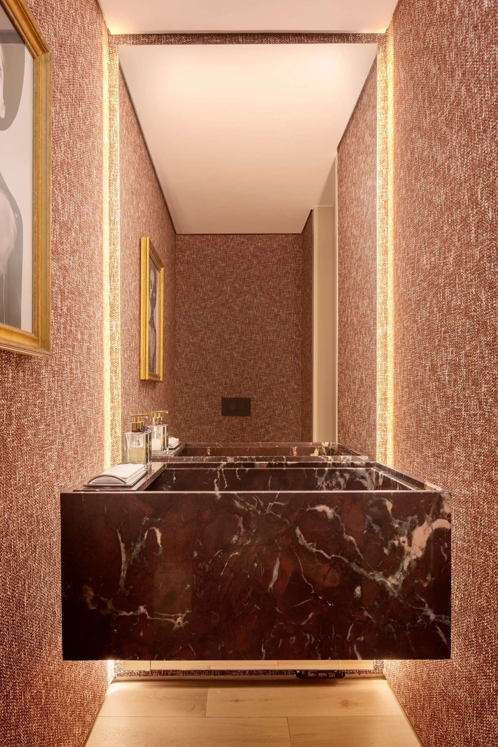 O lavabo é um dos ambientes mais poéticos da residência. Recebeu papel de parede Quaker e cuba esculpida em Quartzito Rosso Fiorentino polido, resultando em um espaço de forte presença visual.