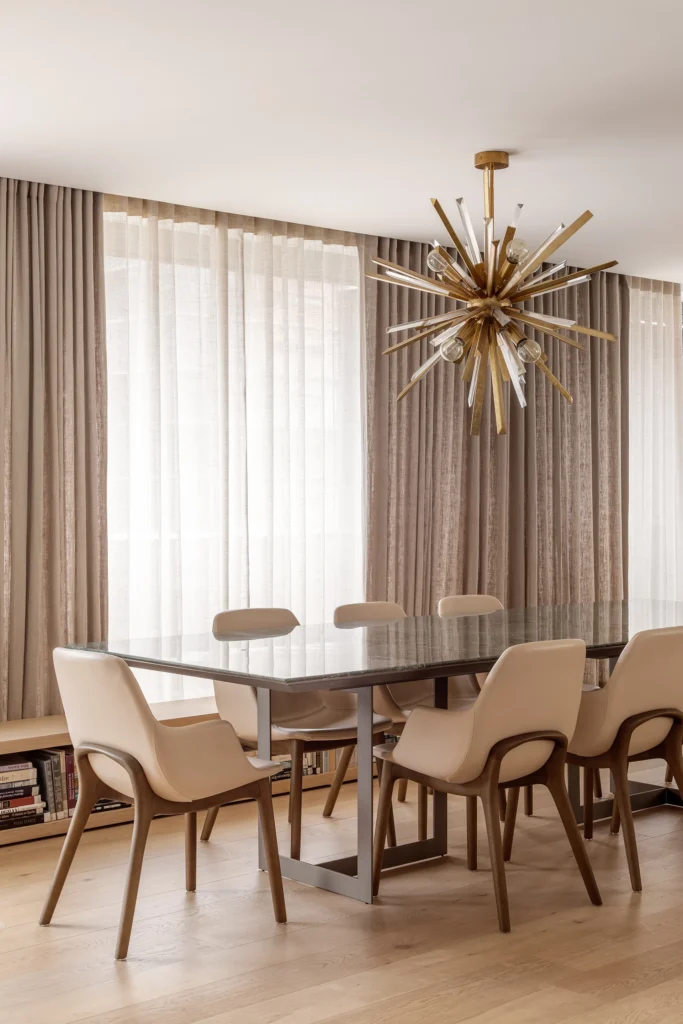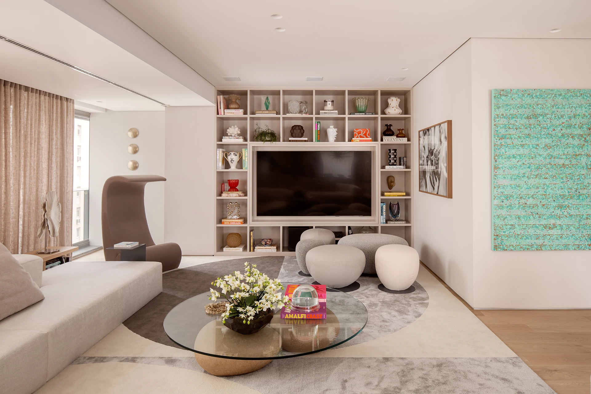 A curadoria dos móveis prezou por estofamentos em linho natural, peças de desenho limpo e cores claras. O tapete orgânico, a estante simétrica, as obras de arte de acervo da cliente e a vista ampla compõem uma base sofisticada com pontos estratégicos de destaque. Na sala de jantar, a mesa da Breton em mármore Verde Guatemala introduz vivacidade ao conjunto, quebrando suavemente a neutralidade do projeto.