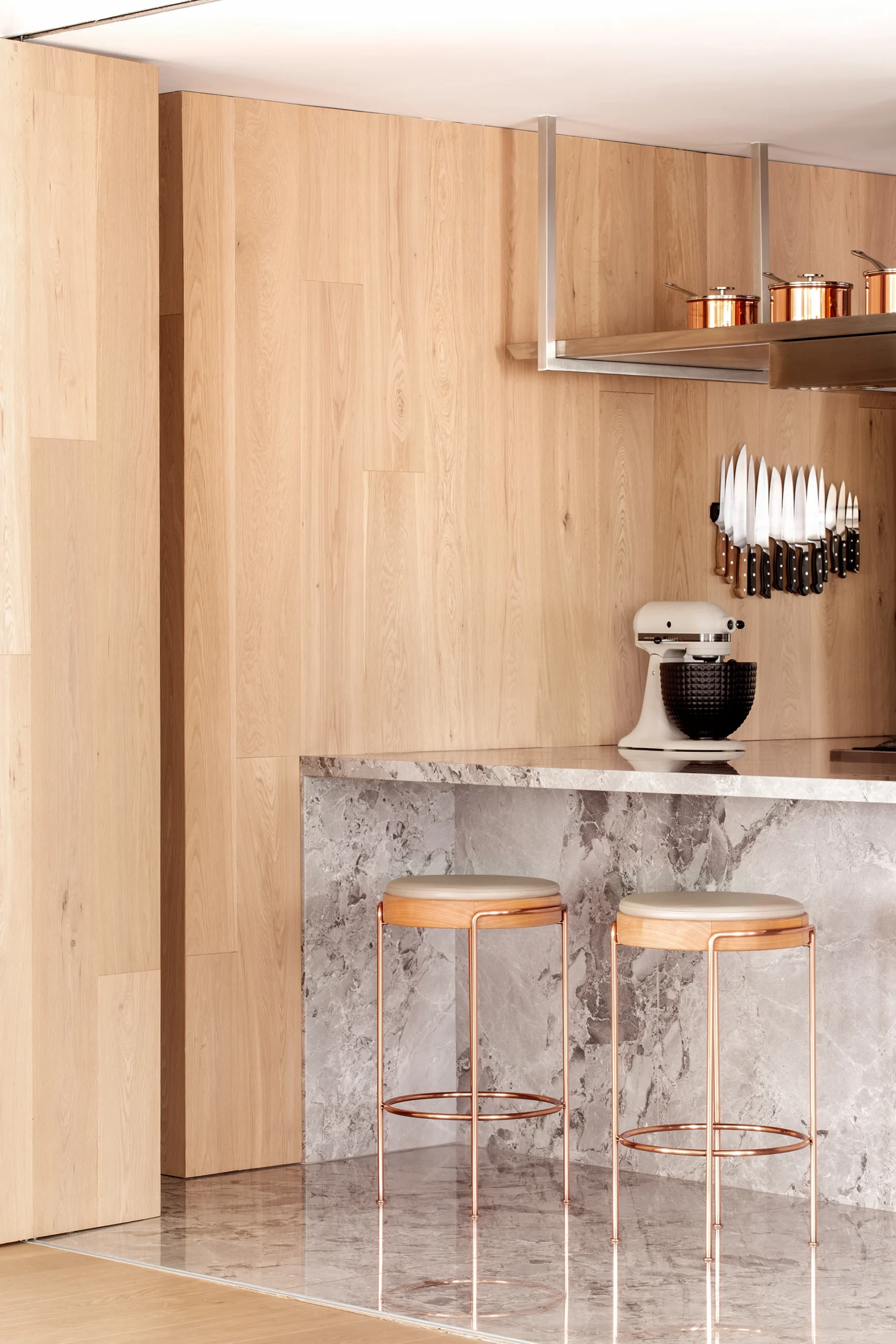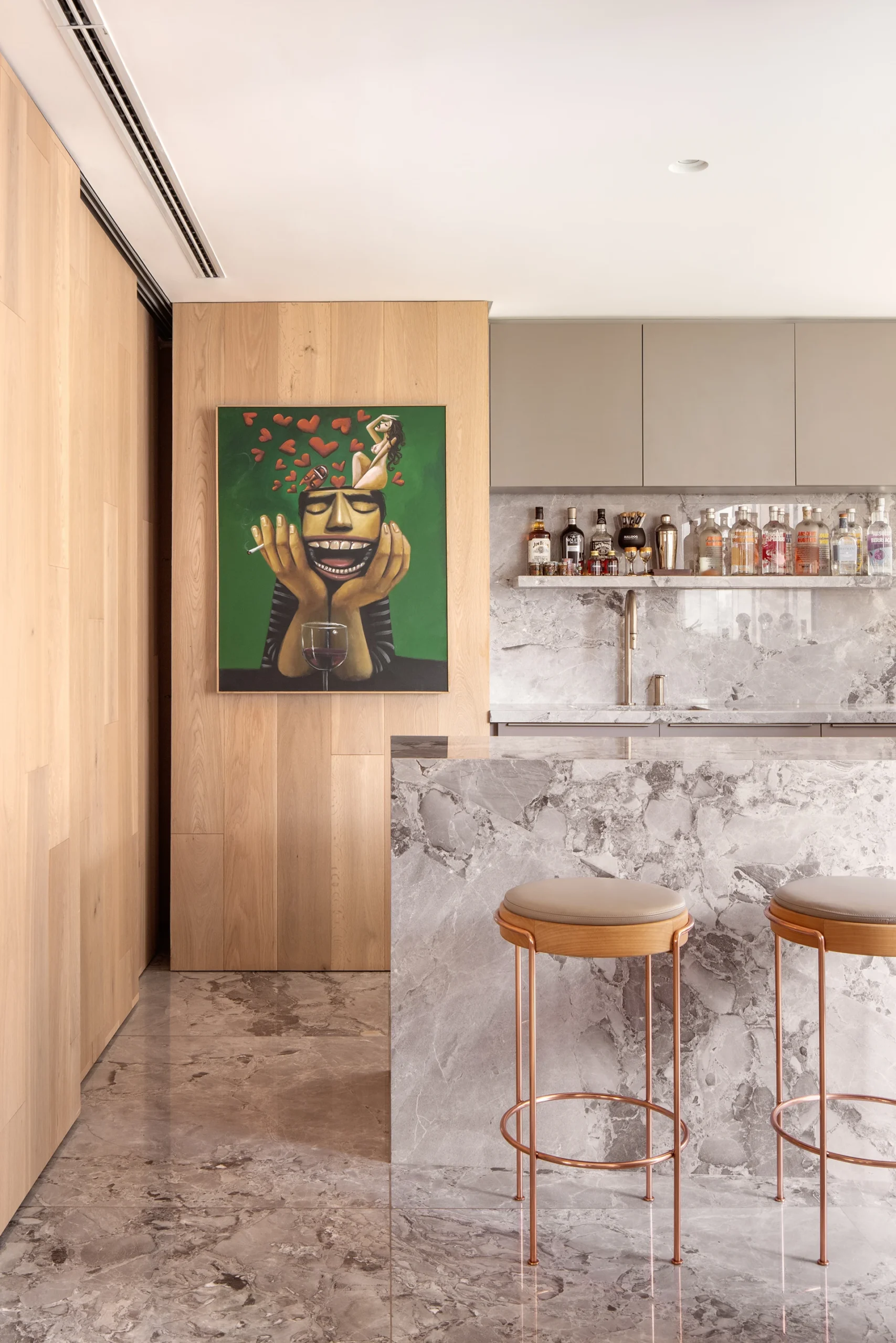 Na materialidade, o living foi revestido com piso em carvalho Parket, que sobe parcialmente pelas paredes, criando continuidade visual. Já a cozinha e o gourmet receberam quartzito Raffaello da Galleria della Pietra — um material escolhido tanto pela resistência quanto pelo impacto estético, especialmente na ilha orgânica que se torna protagonista do ambiente.