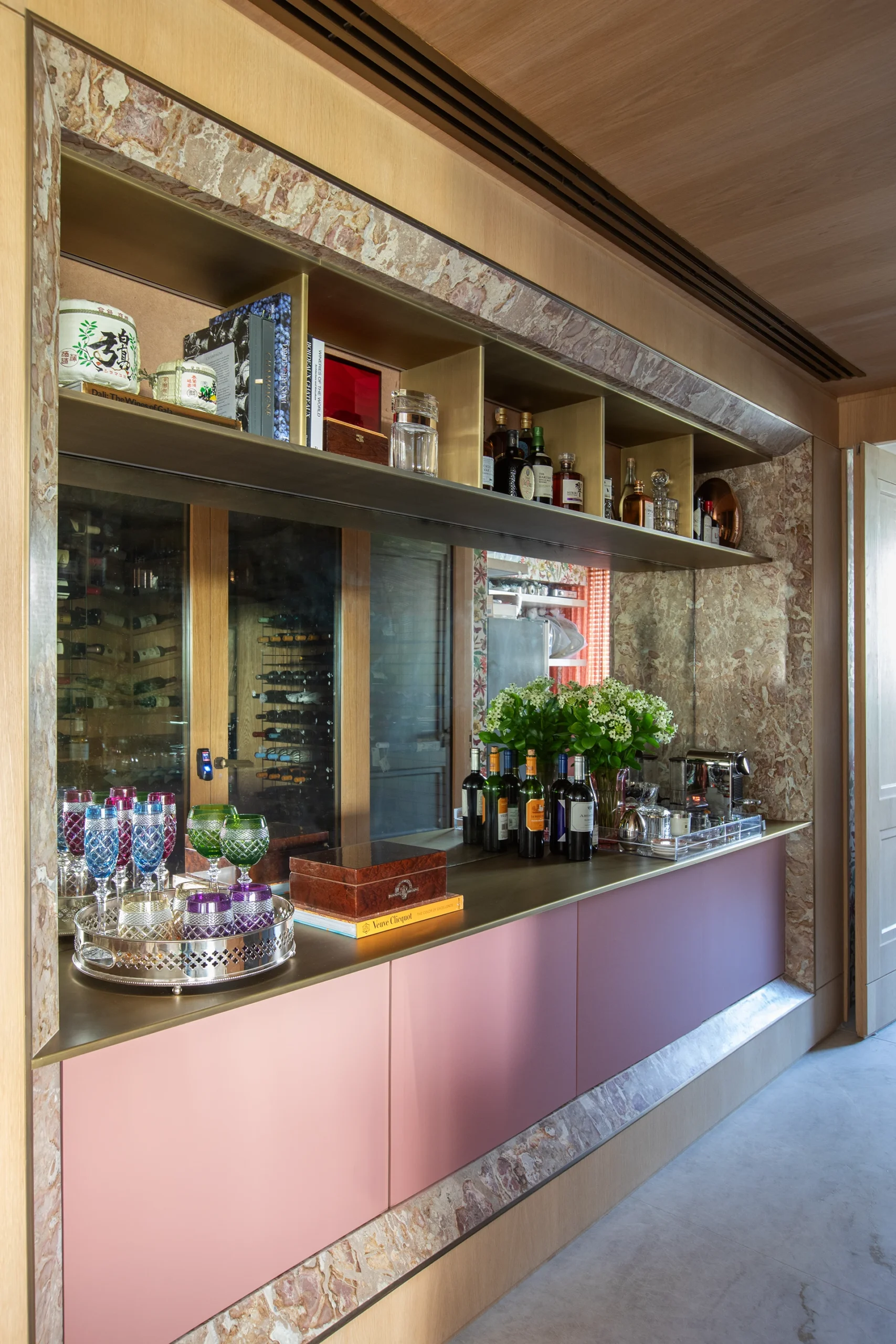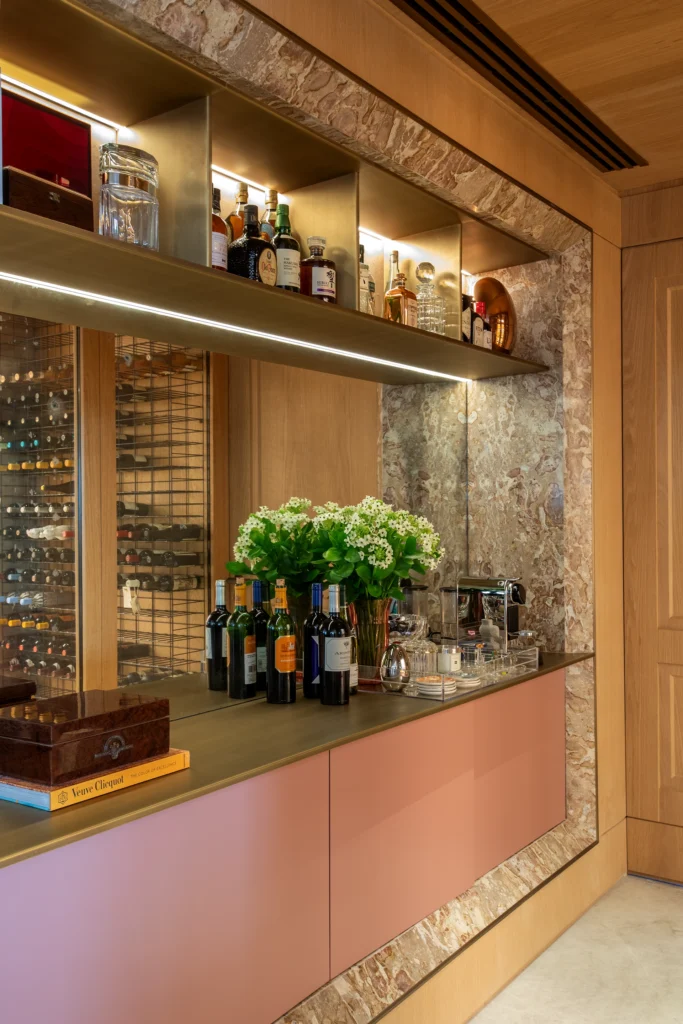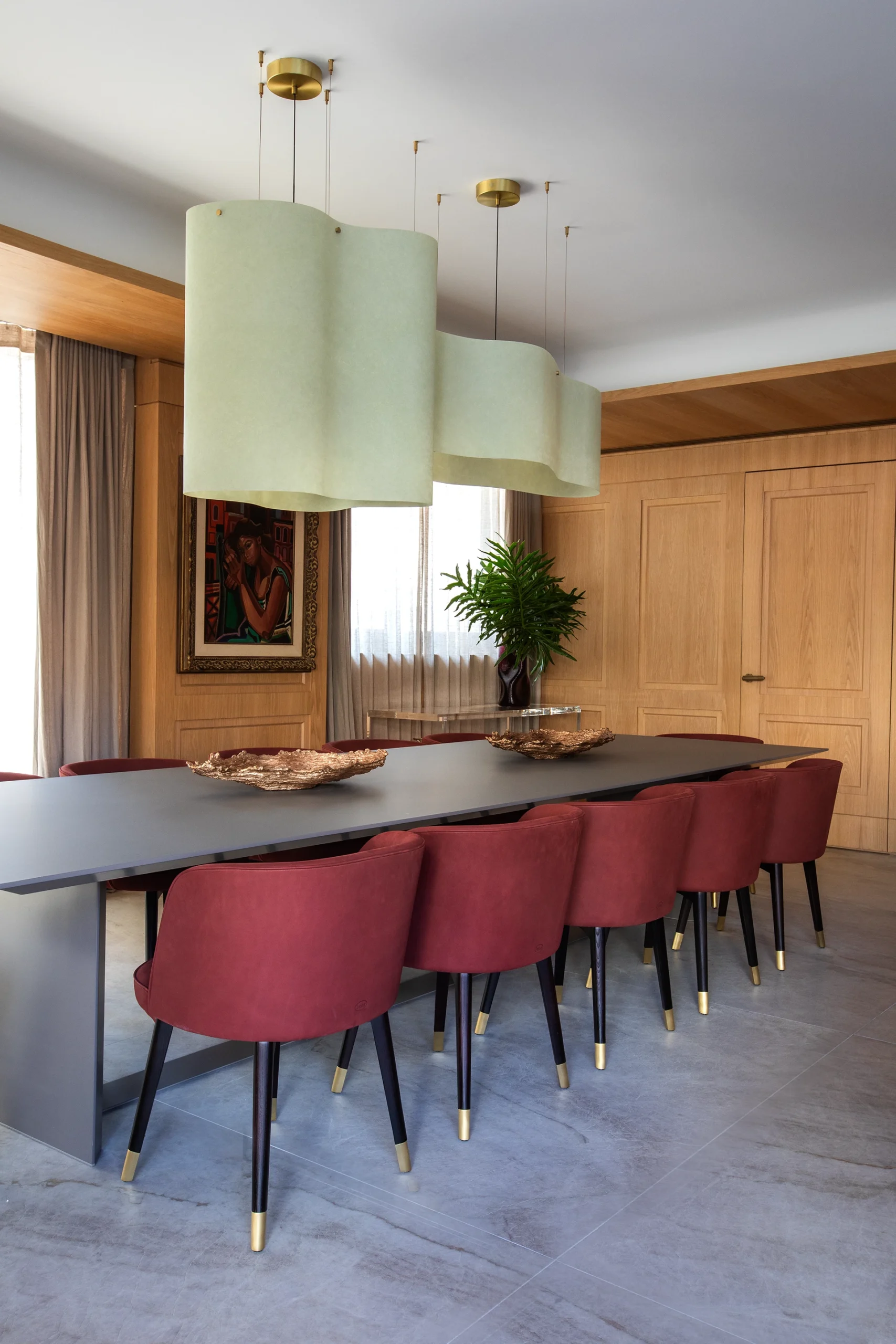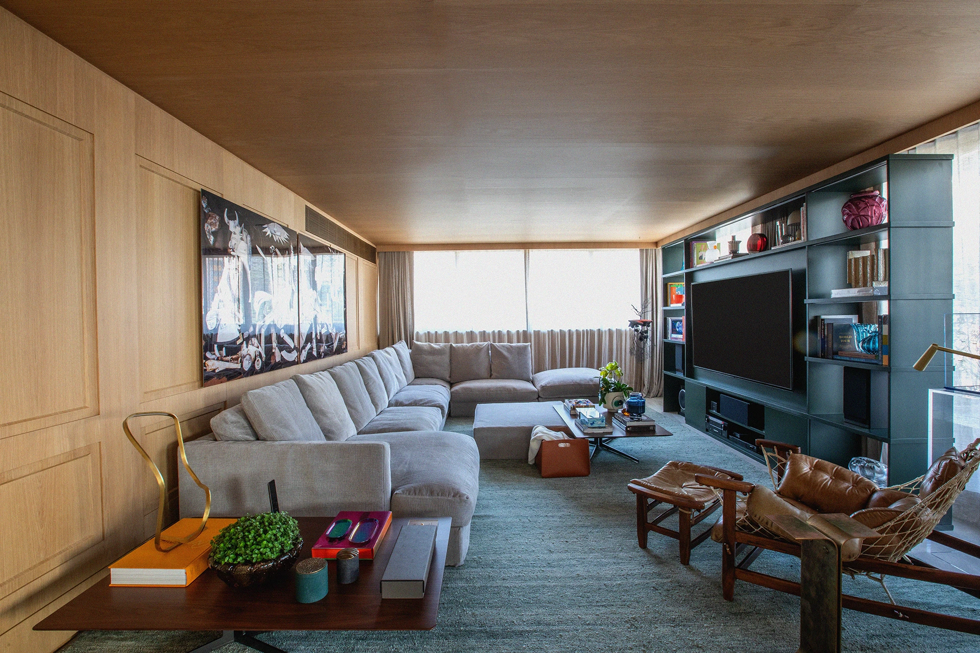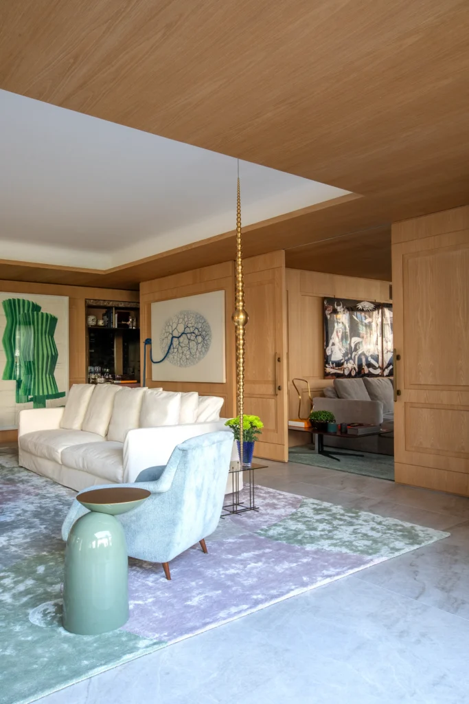 O conceito do projeto explora a generosidade dos espaços para criar ambientes confortáveis e funcionais, mantendo uma atmosfera leve mesmo com o uso marcante de cores e painéis com boiseries. A marcenaria desenhada pelo escritório, executada em lâmina de carvalho europeu, contribui para aquecer os ambientes e estabelecer uma base neutra para a curadoria de mobiliário e obras de arte.