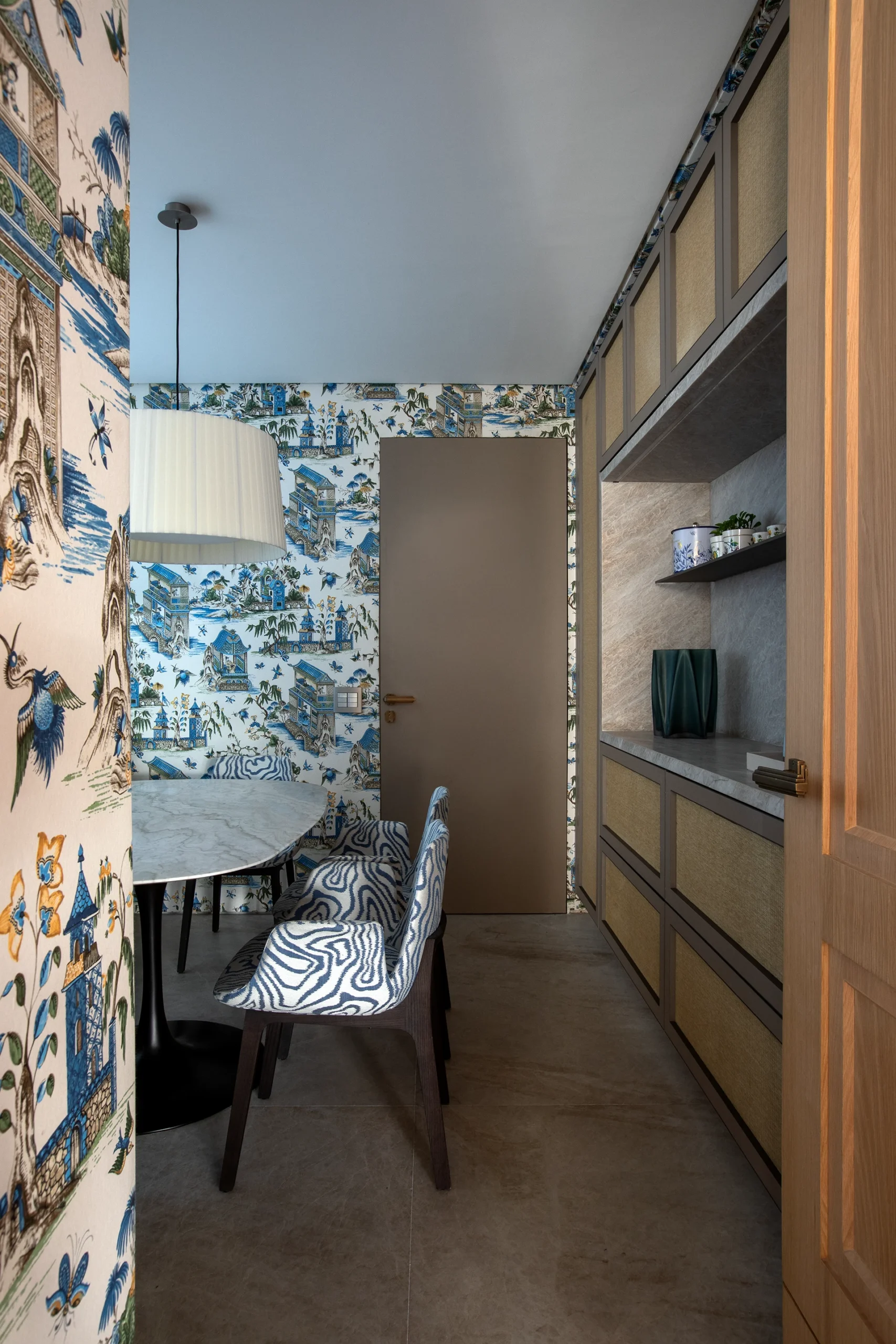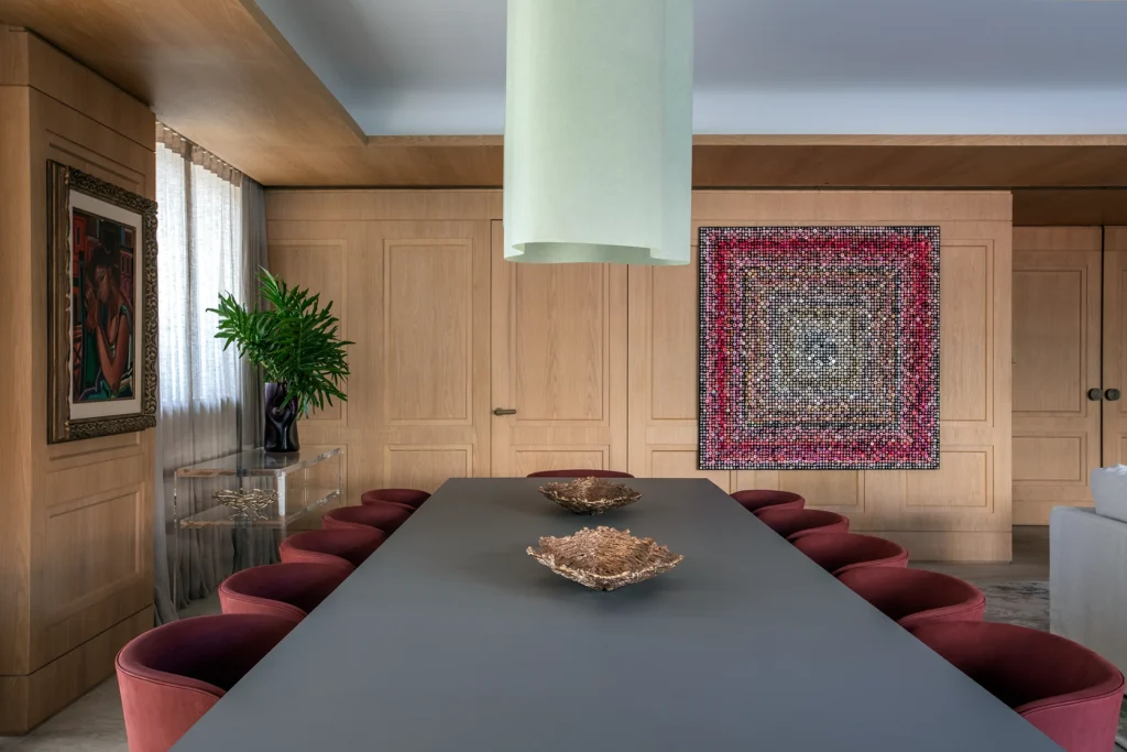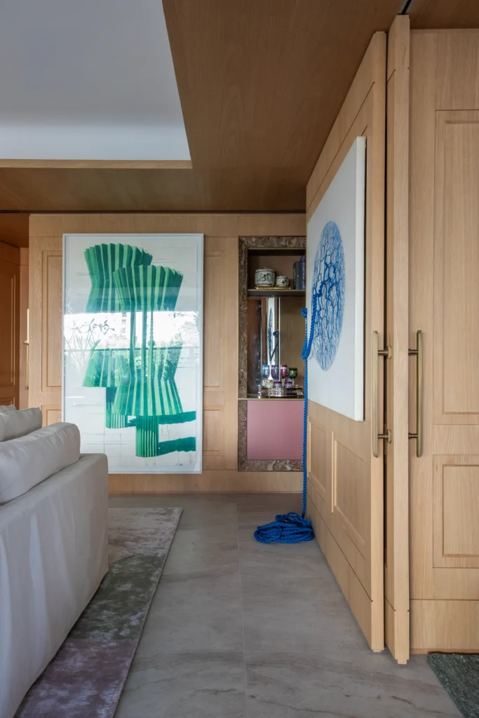 A arte tem papel central no projeto. A família é colecionadora e o apartamento abriga obras de artistas consagrados como Di Cavalcanti, Janaina Mello Landini, Alexandre Arrechea e José Patrício, cuidadosamente inseridas de forma proporcional aos espaços e ao mobiliário.