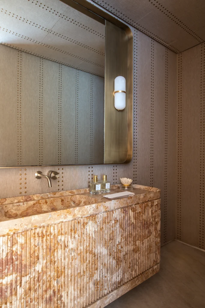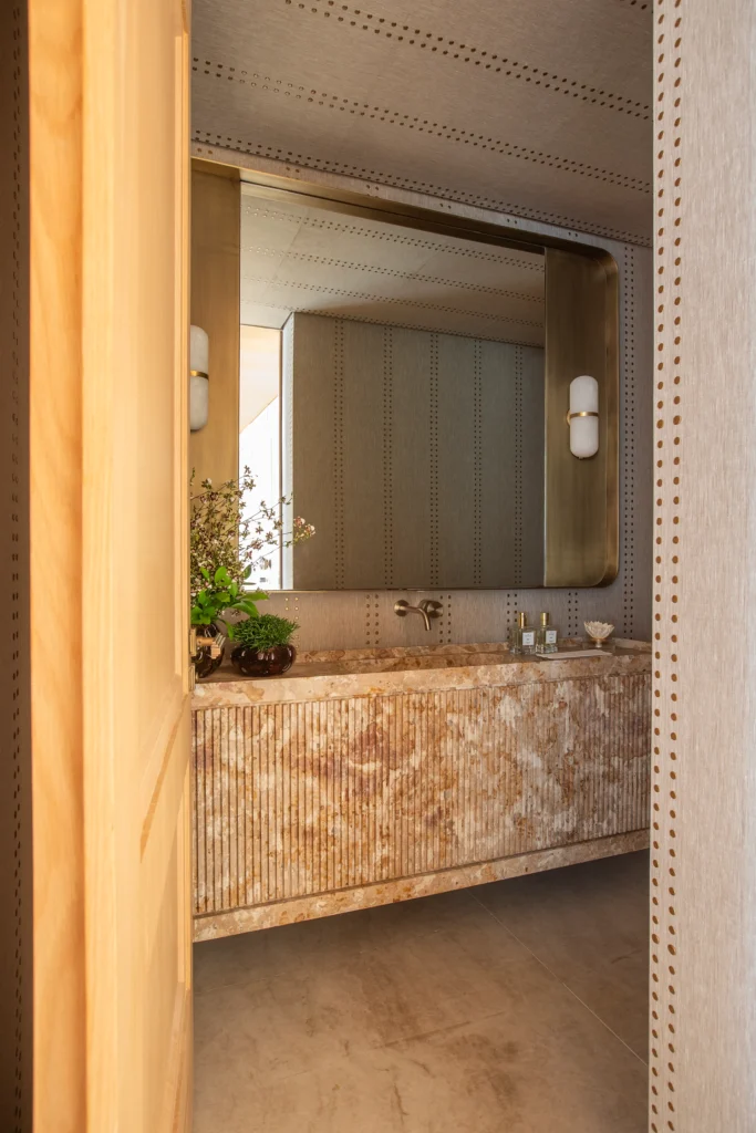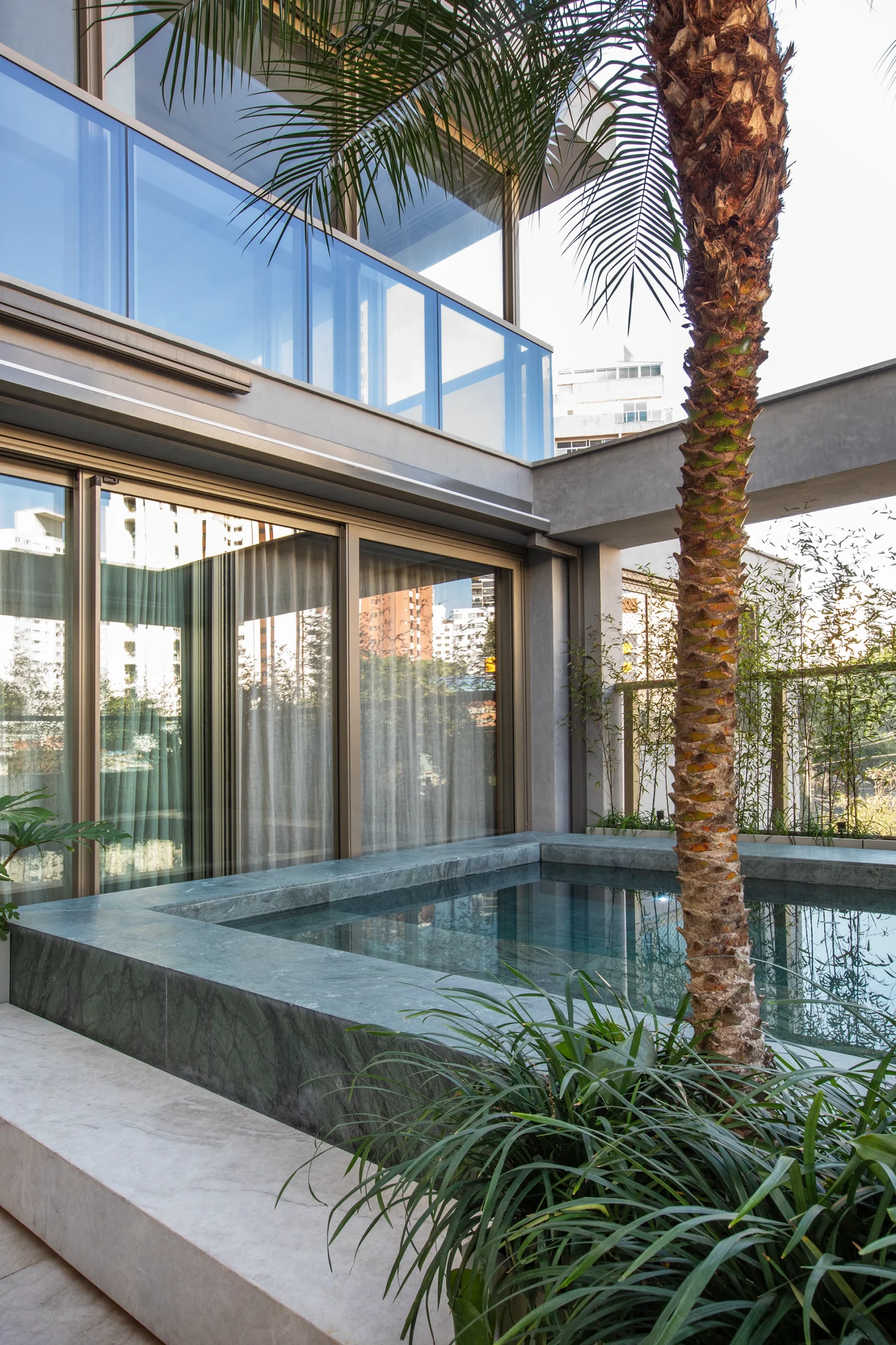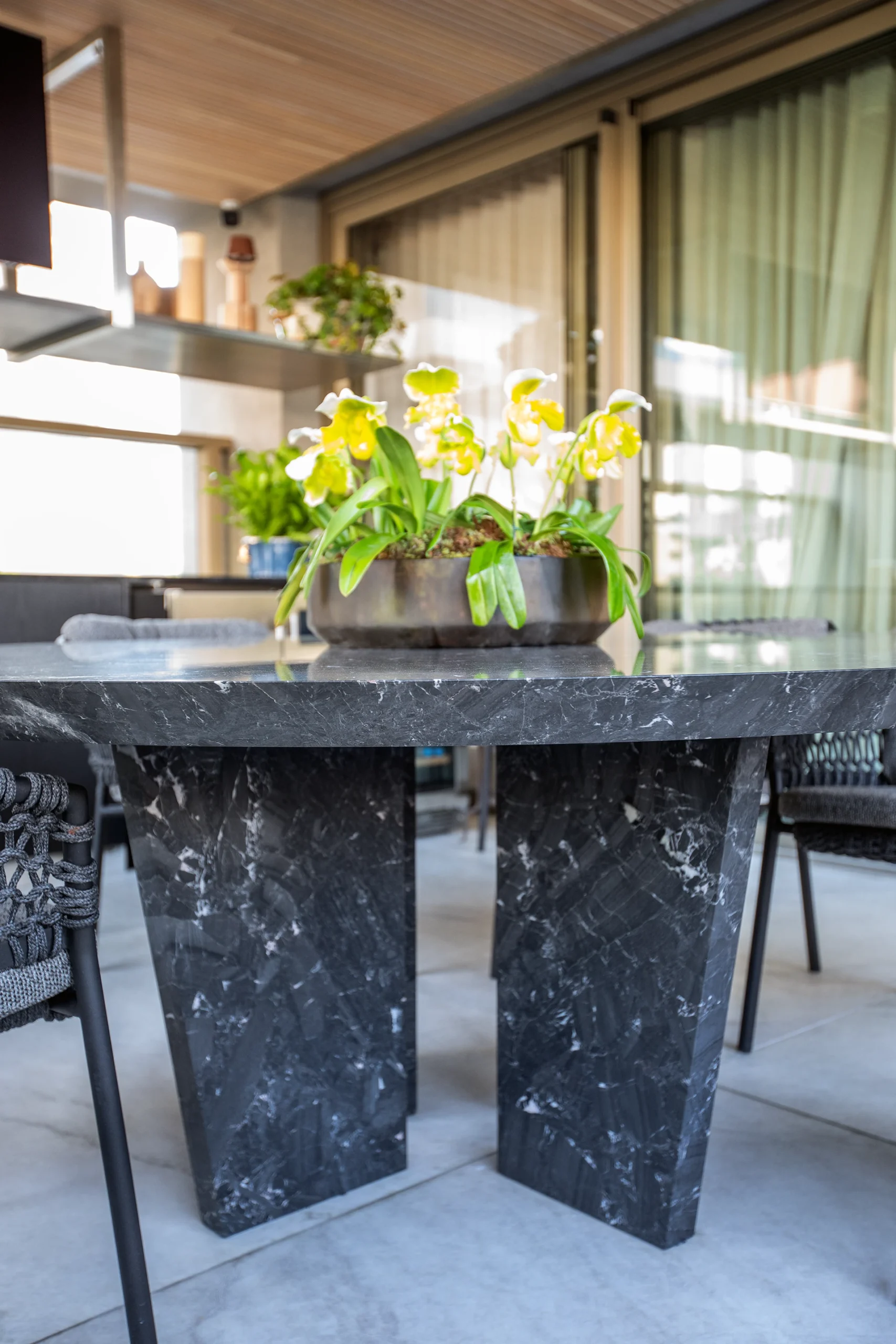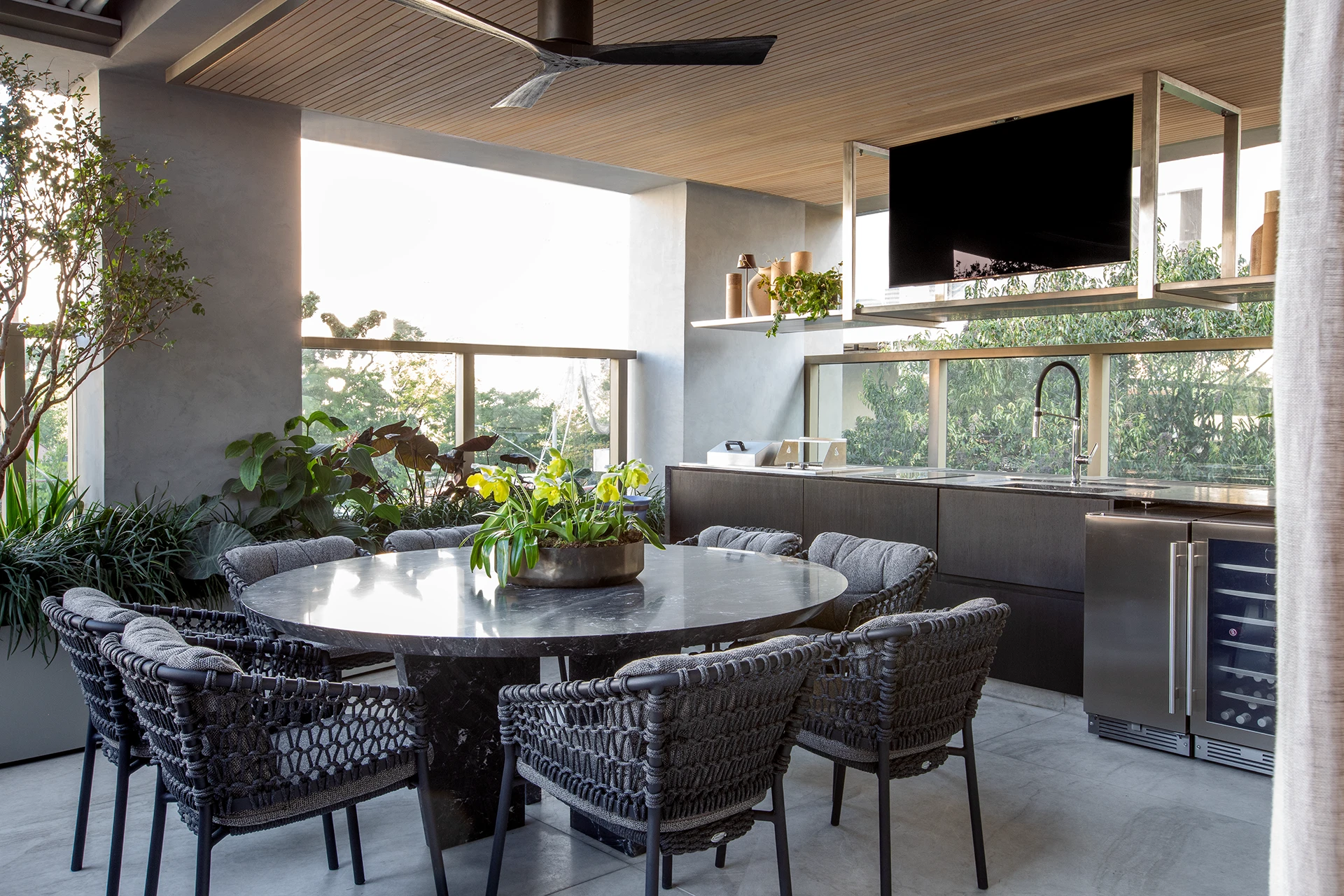 Na área externa, setorizada em piscina, estar e espaço gourmet, destacam-se o mobiliário da Paola Lenti, a cobertura retrátil da Stobag, a integração da piscina com o paisagismo de Mauricio Prada e a mesa de jantar em pedra Pinot Grigio, desenhada pelo escritório. A produção visual ficou a cargo do próprio DB Arquitetos, garantindo coerência entre arquitetura, interiores e paisagismo.