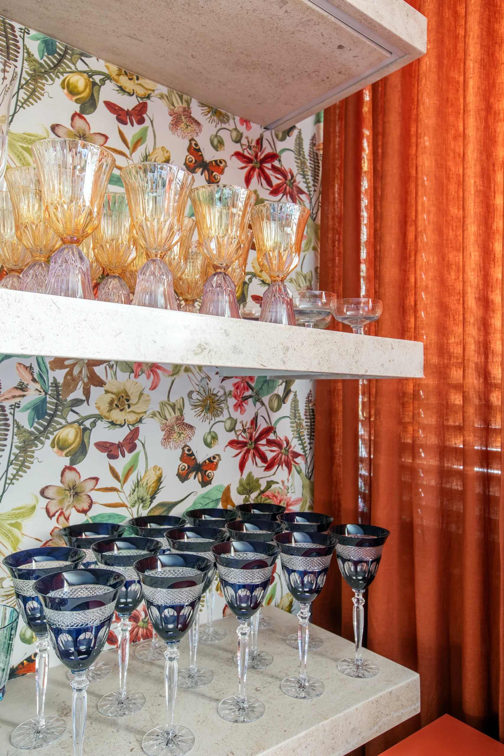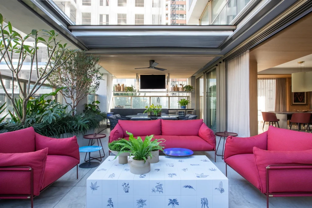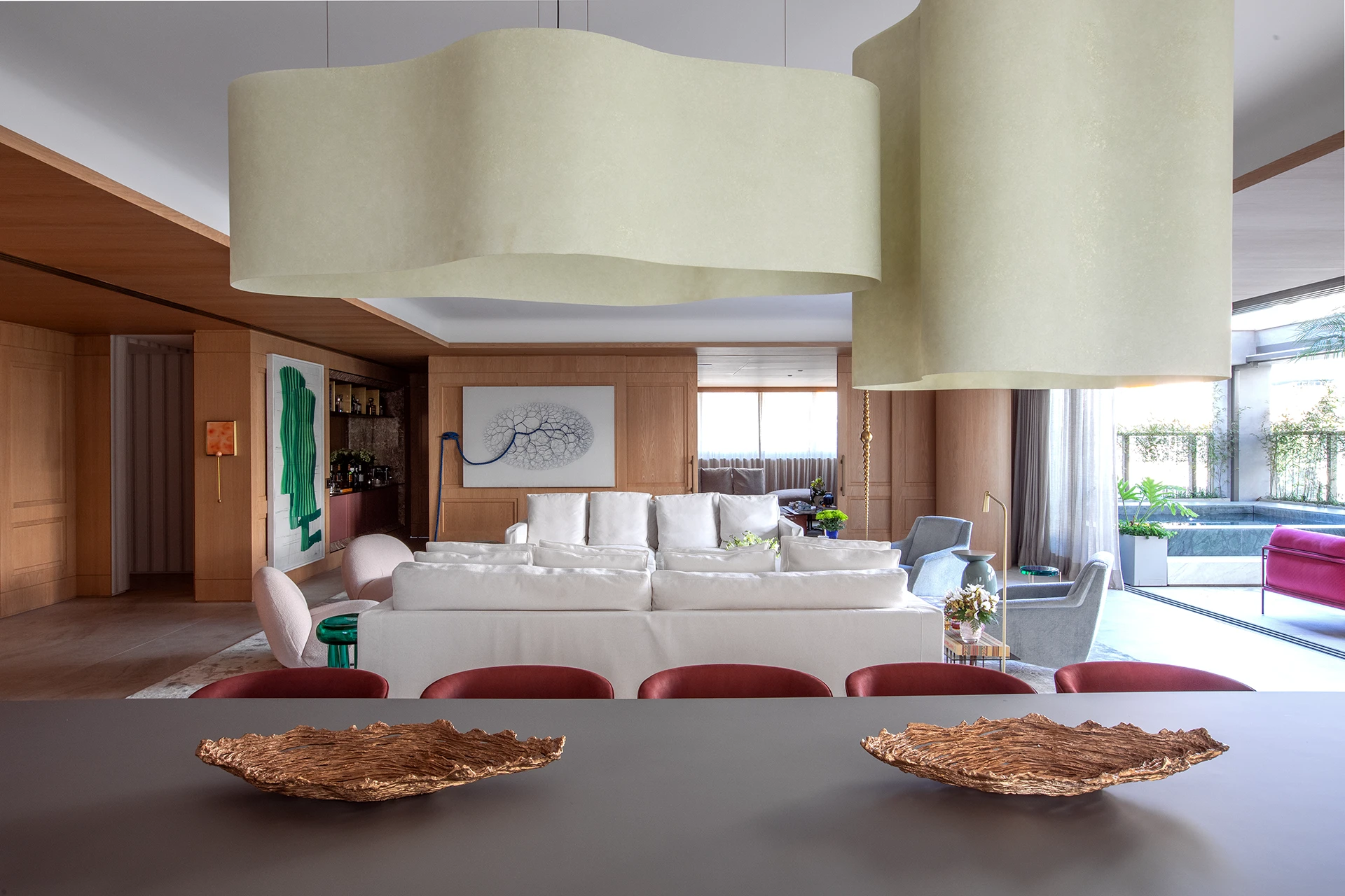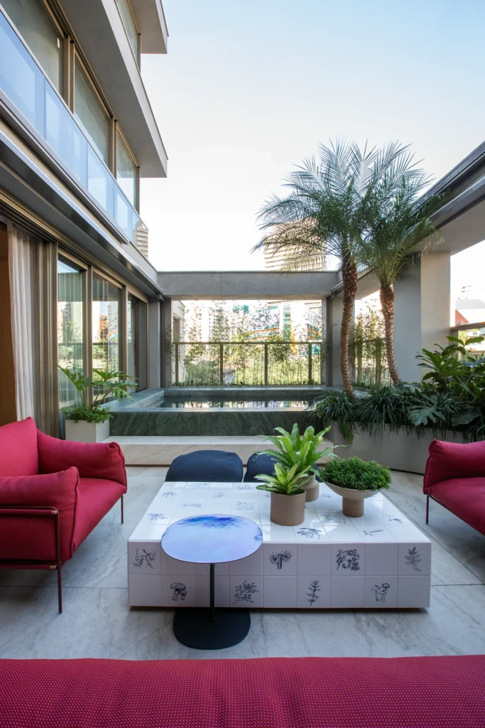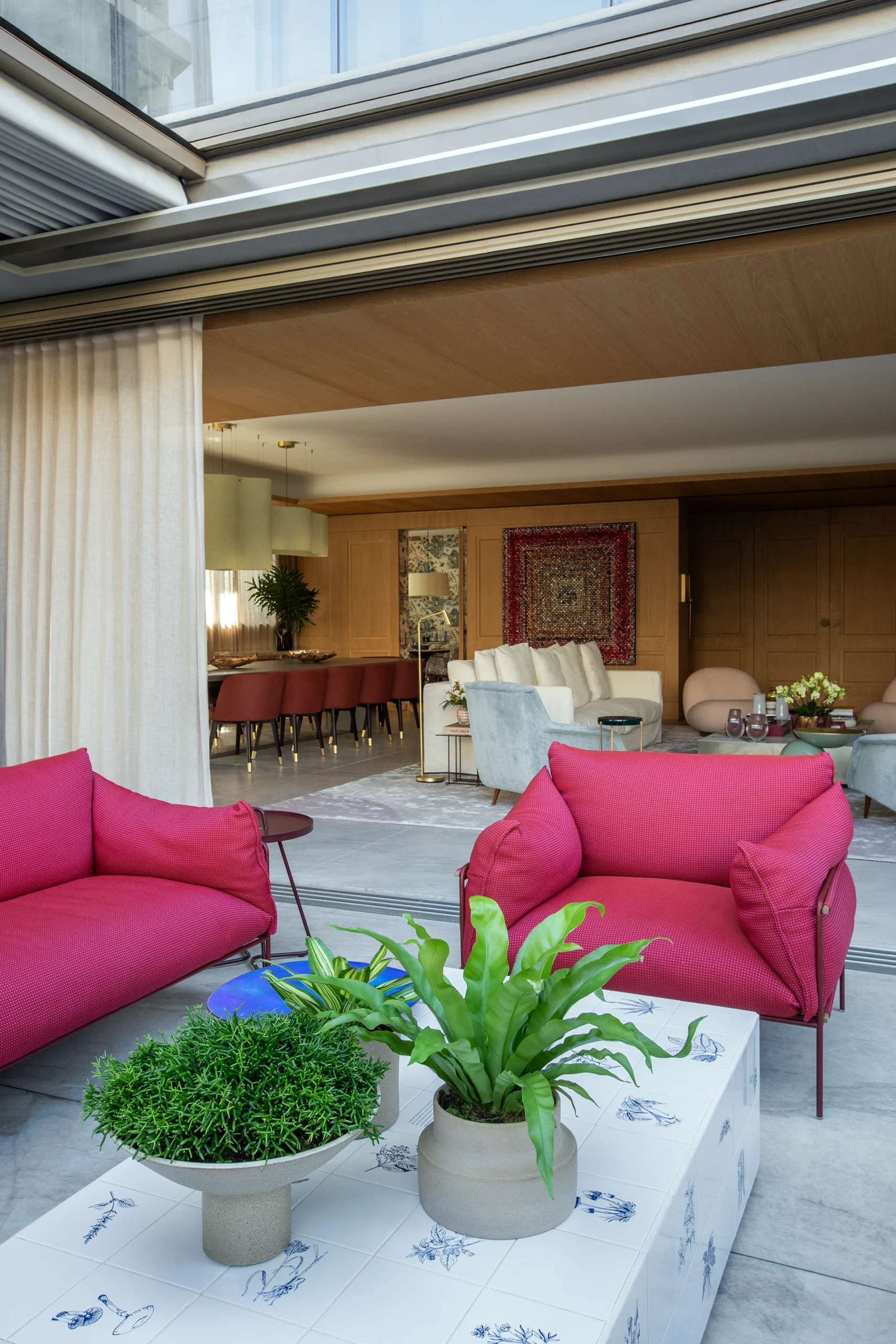 A decoração combina peças novas com itens do acervo dos clientes, como a poltrona Jangada, de Jean Gillon, a mesa de centro Pétala, de Jorge Zalszupin, e parte da coleção de arte da família. A curadoria de mobiliário priorizou o design nacional e internacional, trazendo jovialidade e sofisticação aos ambientes. Entre os destaques estão as cadeiras Colette e os pendentes Nuvola, da Baxter; a mesa de jantar do Estúdio Sette; as poltronas Pacha, da Gubi; mesas laterais Bulle, de Lucas Recchia; peças da Gallotti & Radice e da dupla Draga & Aurel; além do mobiliário externo da Paola Lenti. Um elemento singular é a mesa de centro sob medida, desenvolvida em parceria com o Atelier BK, finalizada com azulejos de Adriana Varejão.