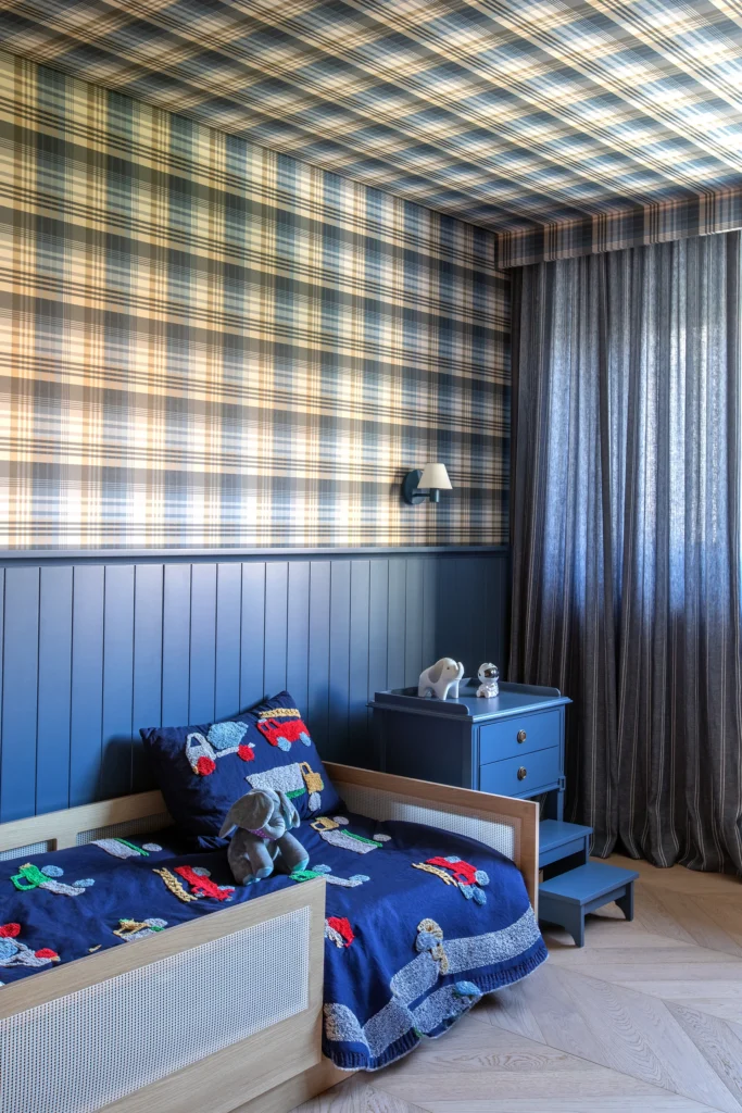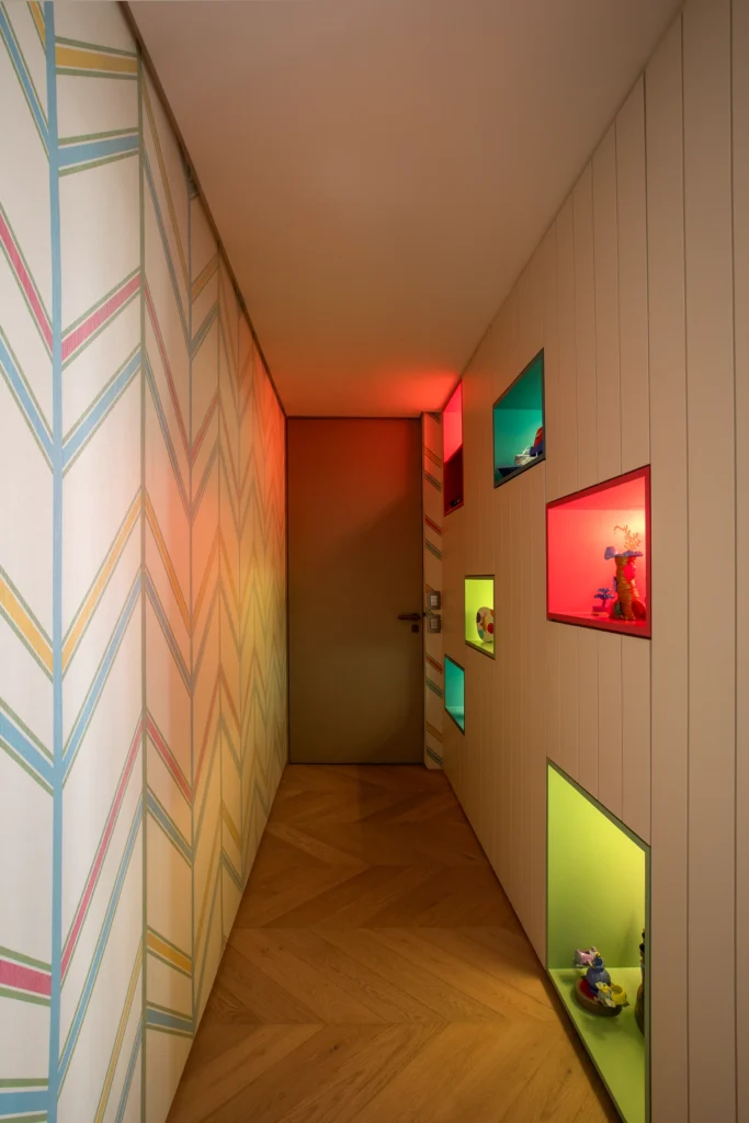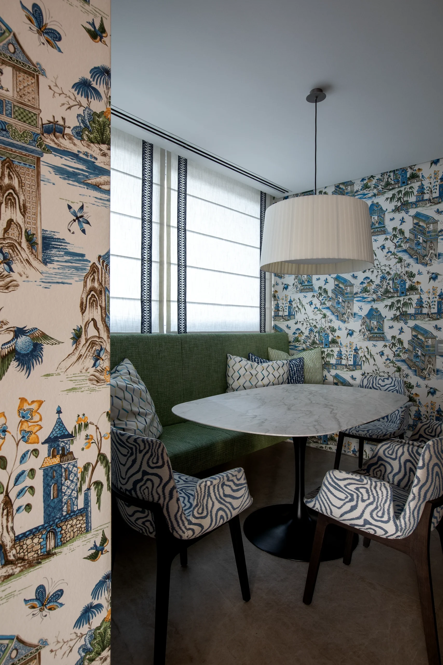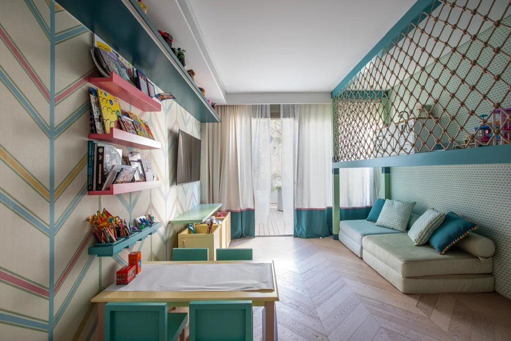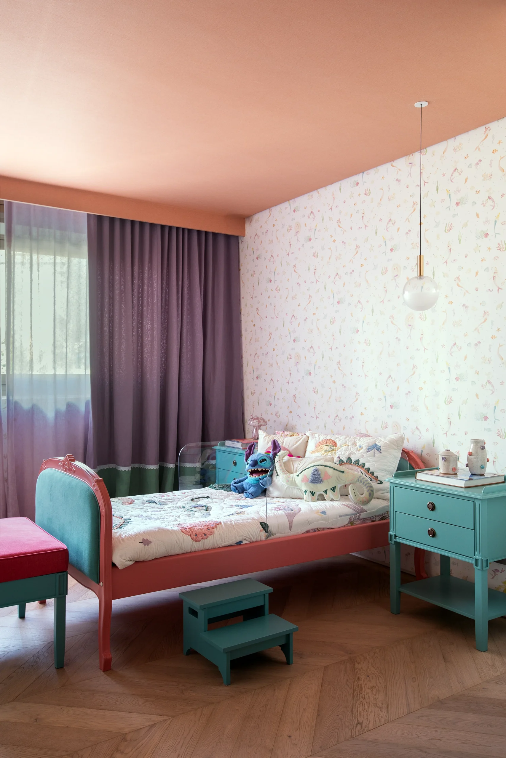A paleta cromática da área social combina vinho, rosa, verde e azul em versões pastéis, transmitindo alegria e frescor sem comprometer a elegância. Nos demais ambientes, cada espaço recebeu uma cor de destaque: verde oliva na suíte master, azul no quarto do filho, rosa antigo/pêssego no quarto da filha, verde claro na brinquedoteca e azul escuro na cozinha. As cortinas em gaze e xale de linho reforçam a leveza visual dos ambientes.