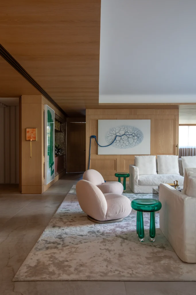 Os materiais de acabamento reforçam a sofisticação discreta do projeto. O piso da sala, cozinha e copa é em quartzito Taj Mahal levigado, enquanto os dormitórios receberam assoalho de carvalho. Na área de estar, um grande tapete de 6,20 x 5,50 m, com estampa orgânica em tons de lilás, verde e off-white, delimita o espaço e acrescenta textura à composição.