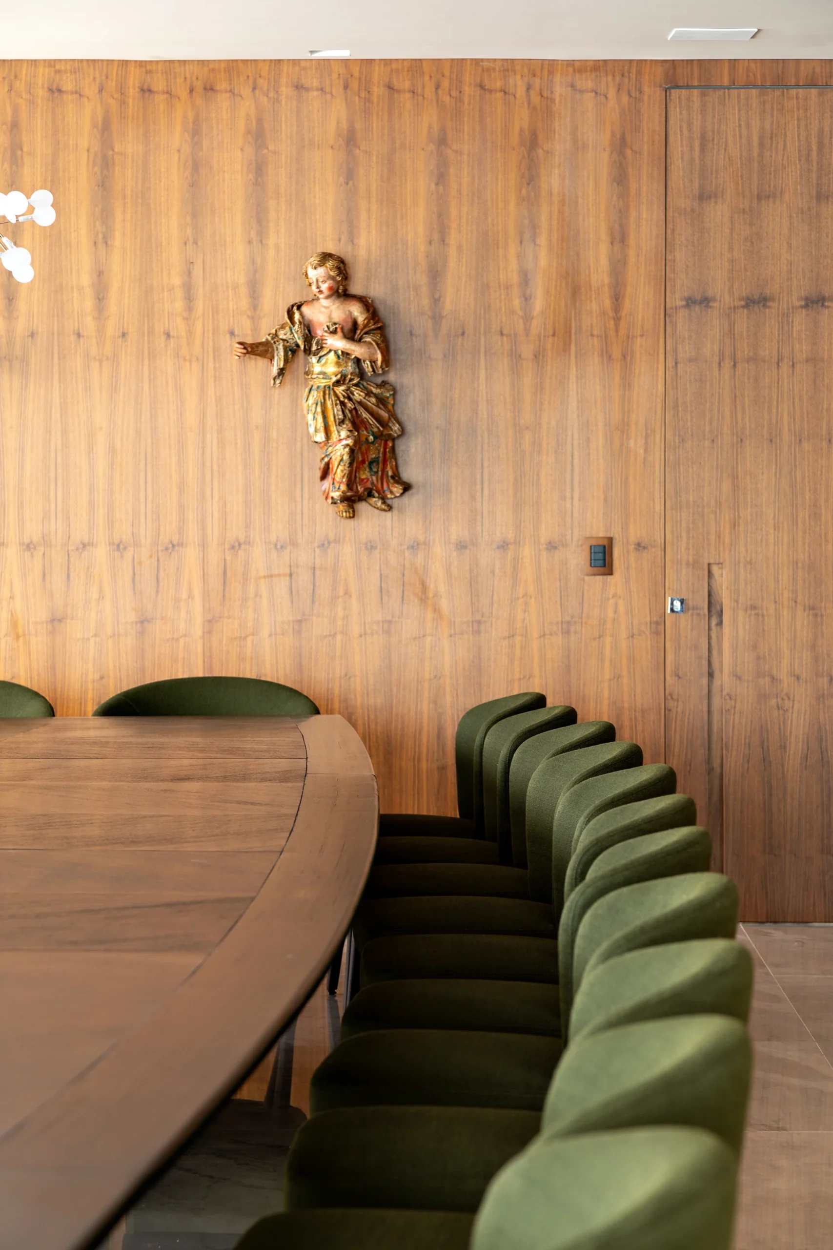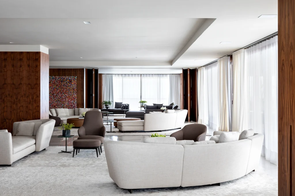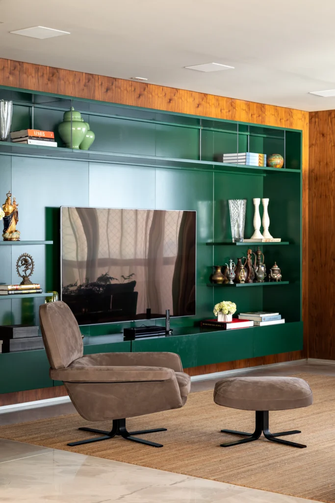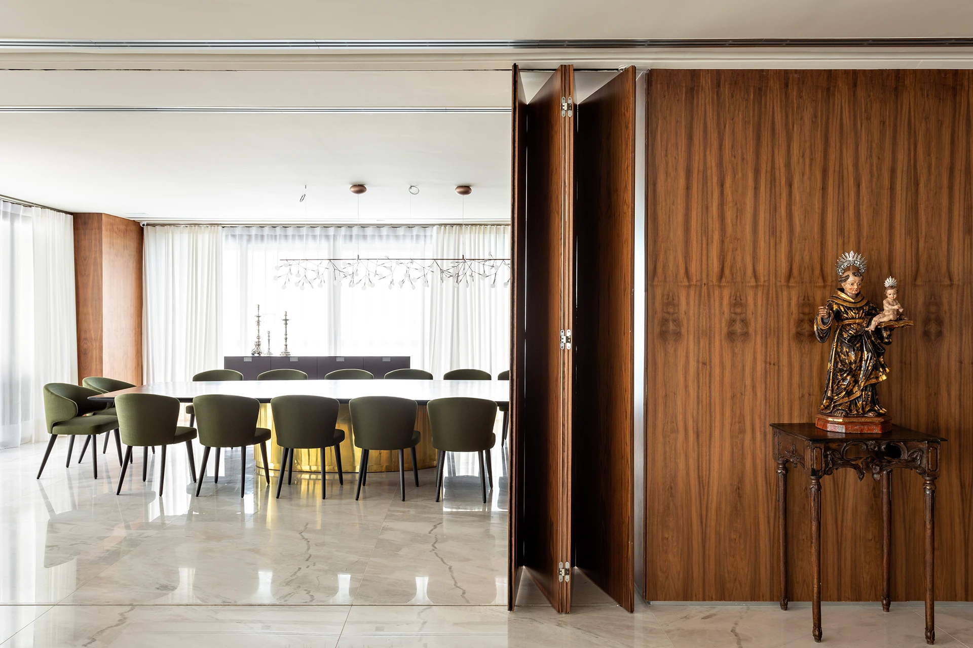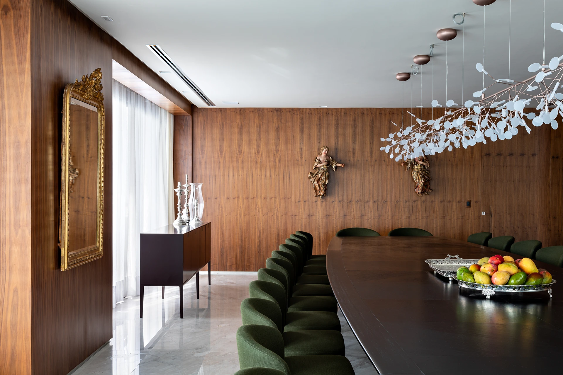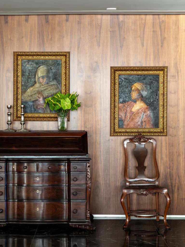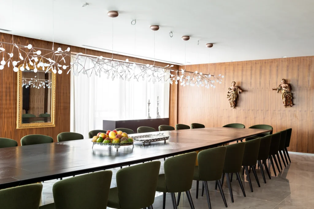 A materialidade reforça o caráter sofisticado da proposta: o mármore Verde Alpi marca a galeria com imponência, enquanto a madeira Nogueira traz unidade e calor aos espaços. Entre os elementos especiais, destaca-se a mesa de jantar para 30 pessoas, criada para acolher encontros e reforçar o espírito generoso do projeto.