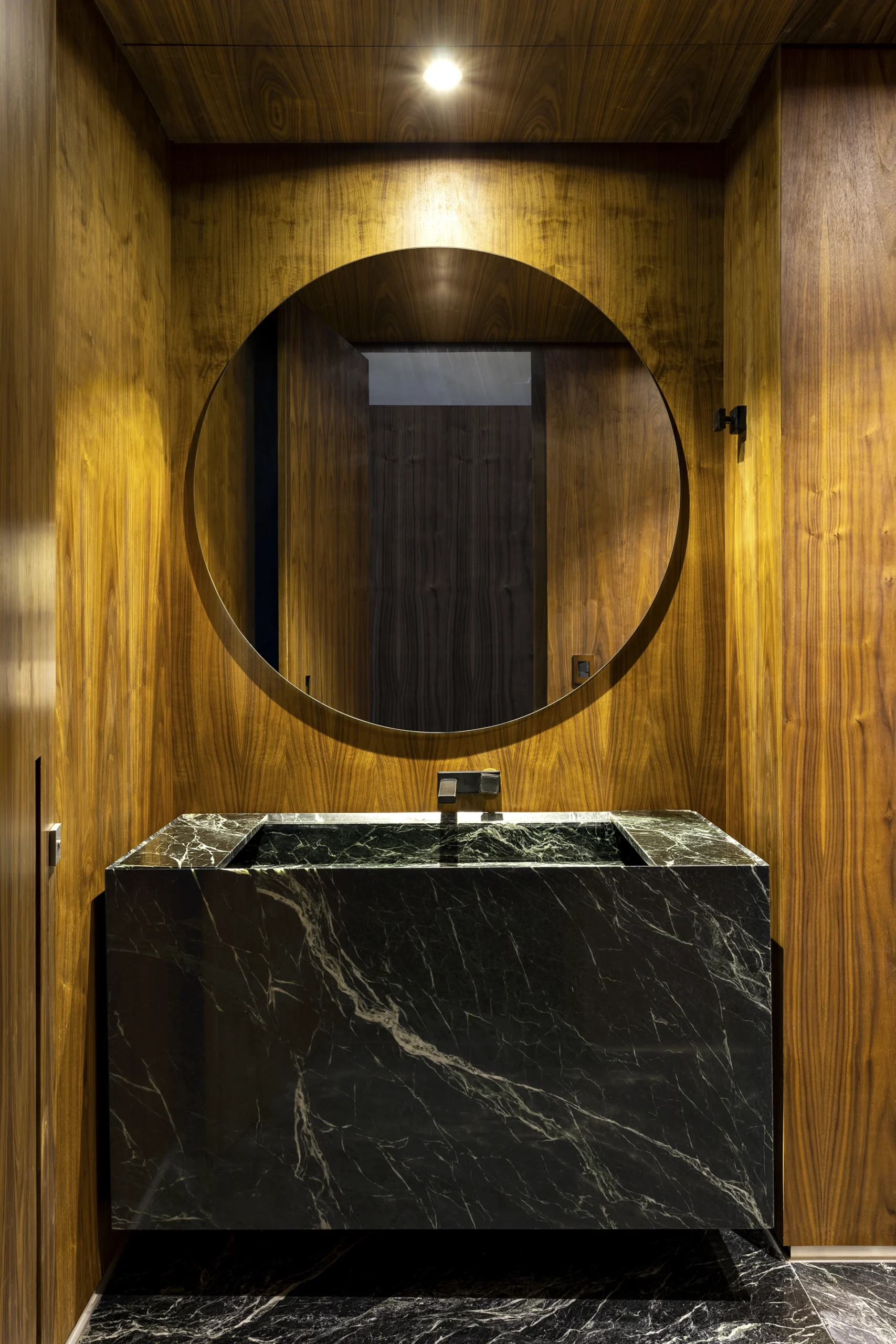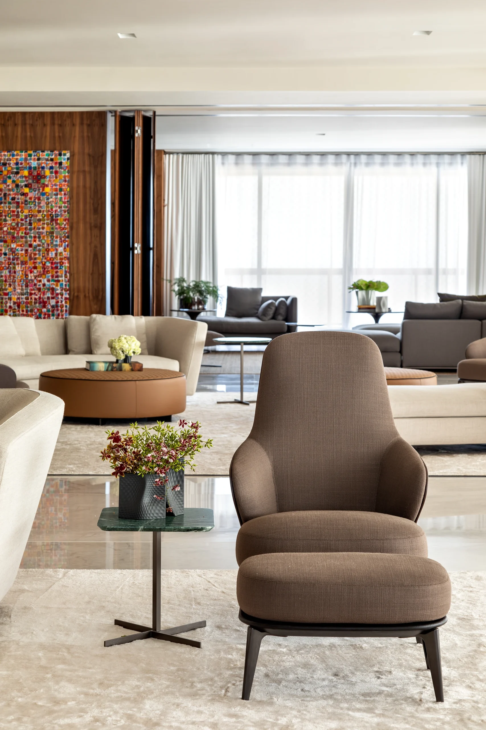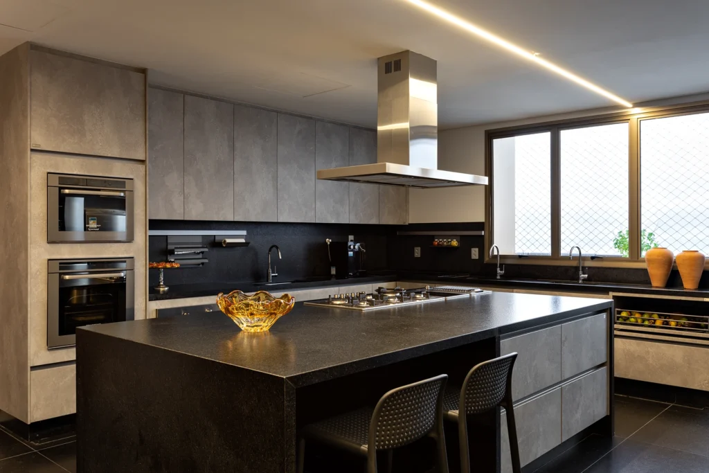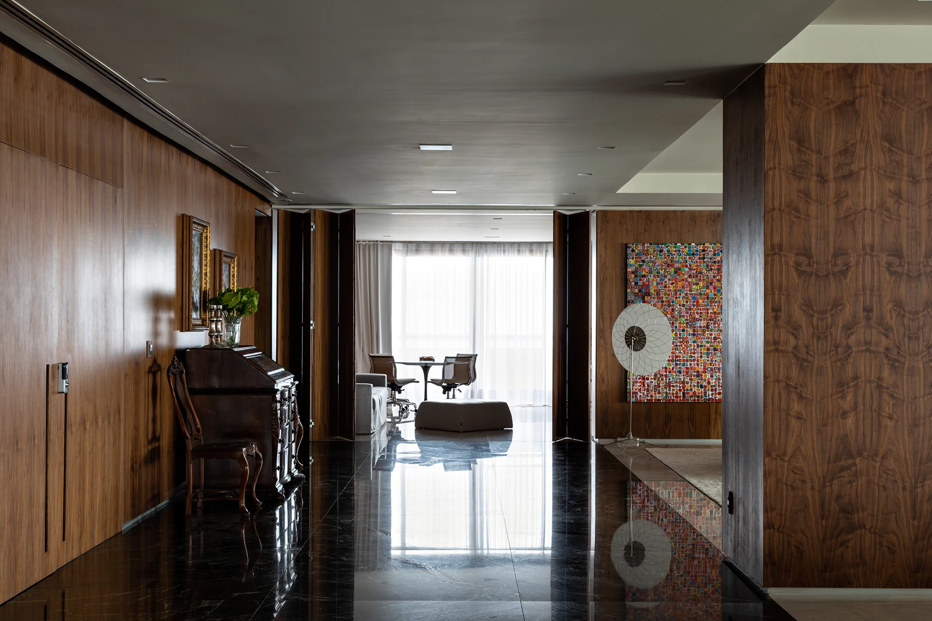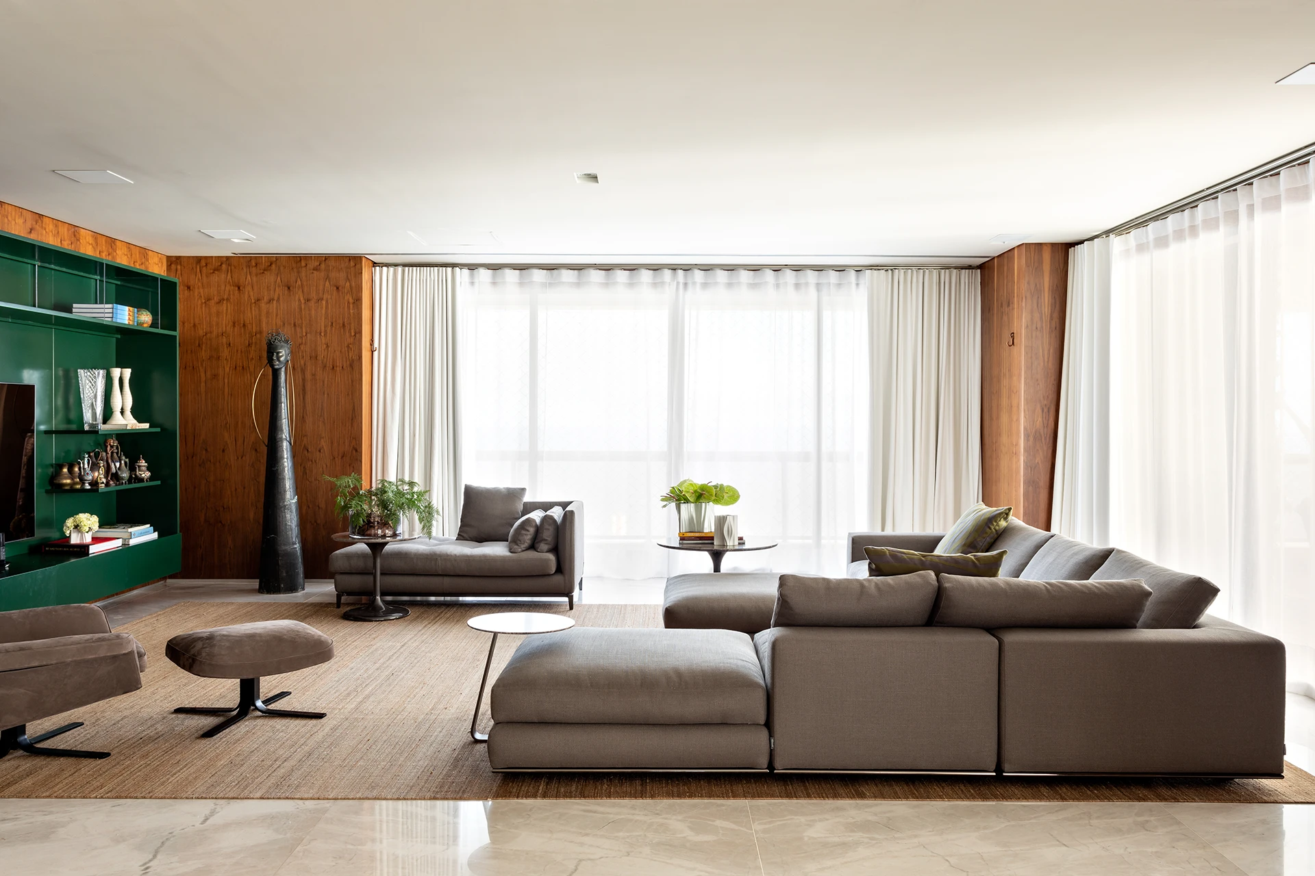 A materialidade reforça o caráter sofisticado da proposta: o mármore Verde Alpi marca a galeria com imponência, enquanto a madeira Nogueira traz unidade e calor aos espaços. Entre os elementos especiais, destaca-se a mesa de jantar para 30 pessoas, criada para acolher encontros e reforçar o espírito generoso do projeto.