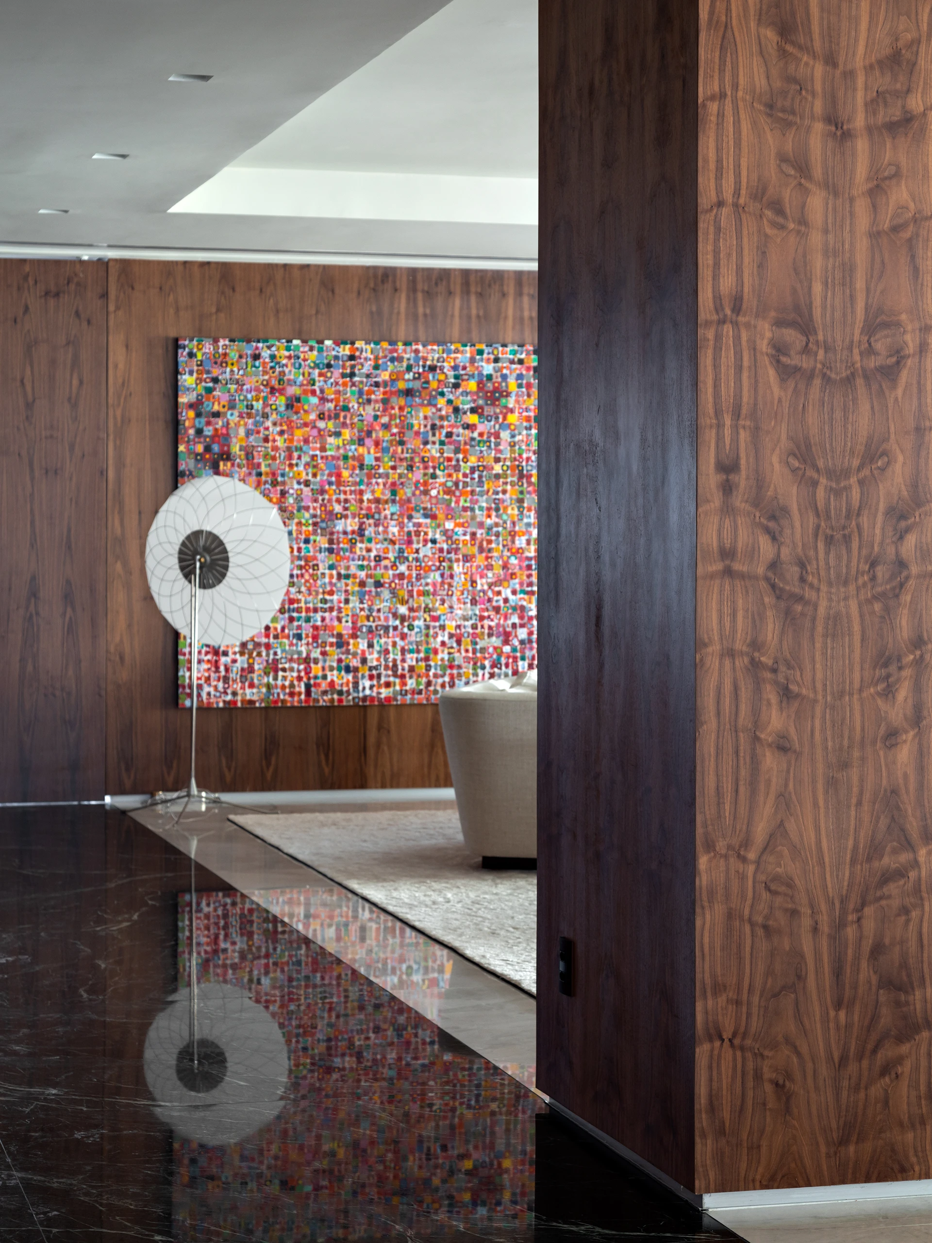 Com referências aos grandes vãos do Palácio da Alvorada, o projeto prioriza fluidez e elegância nas circulações, ampliando espaços e valorizando a continuidade visual. A reforma envolveu a atualização dos sistemas elétrico e hidráulico, além de soluções técnicas cuidadosas — como rebaixos pontuais no forro para acomodar dutos de ar-condicionado sem comprometer o pé-direito dos demais ambientes.