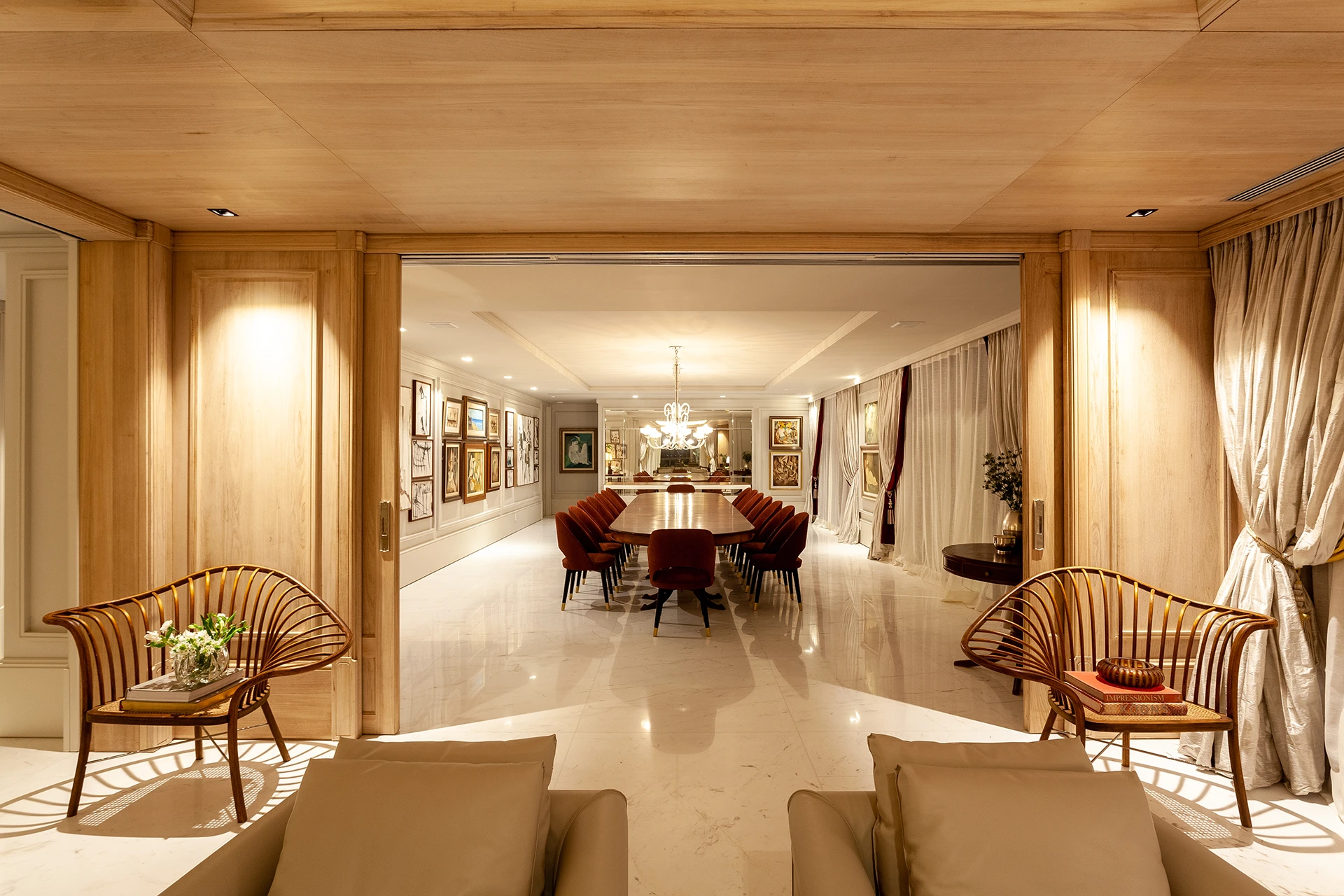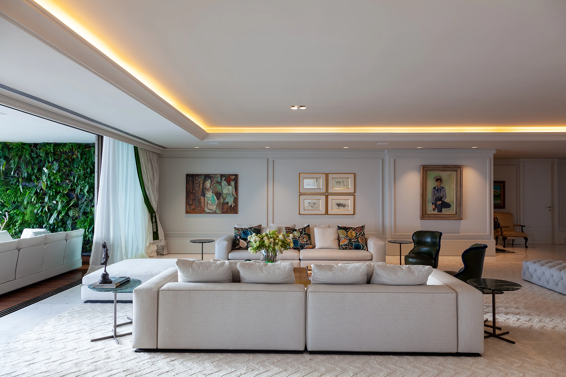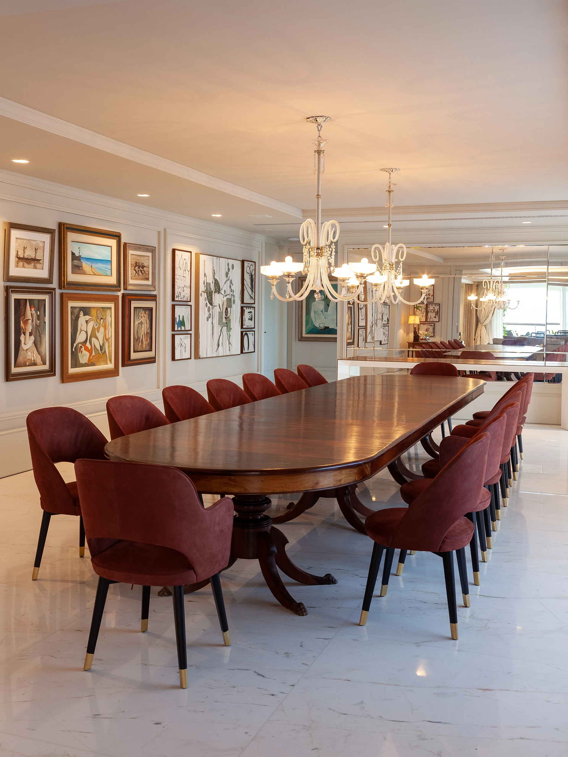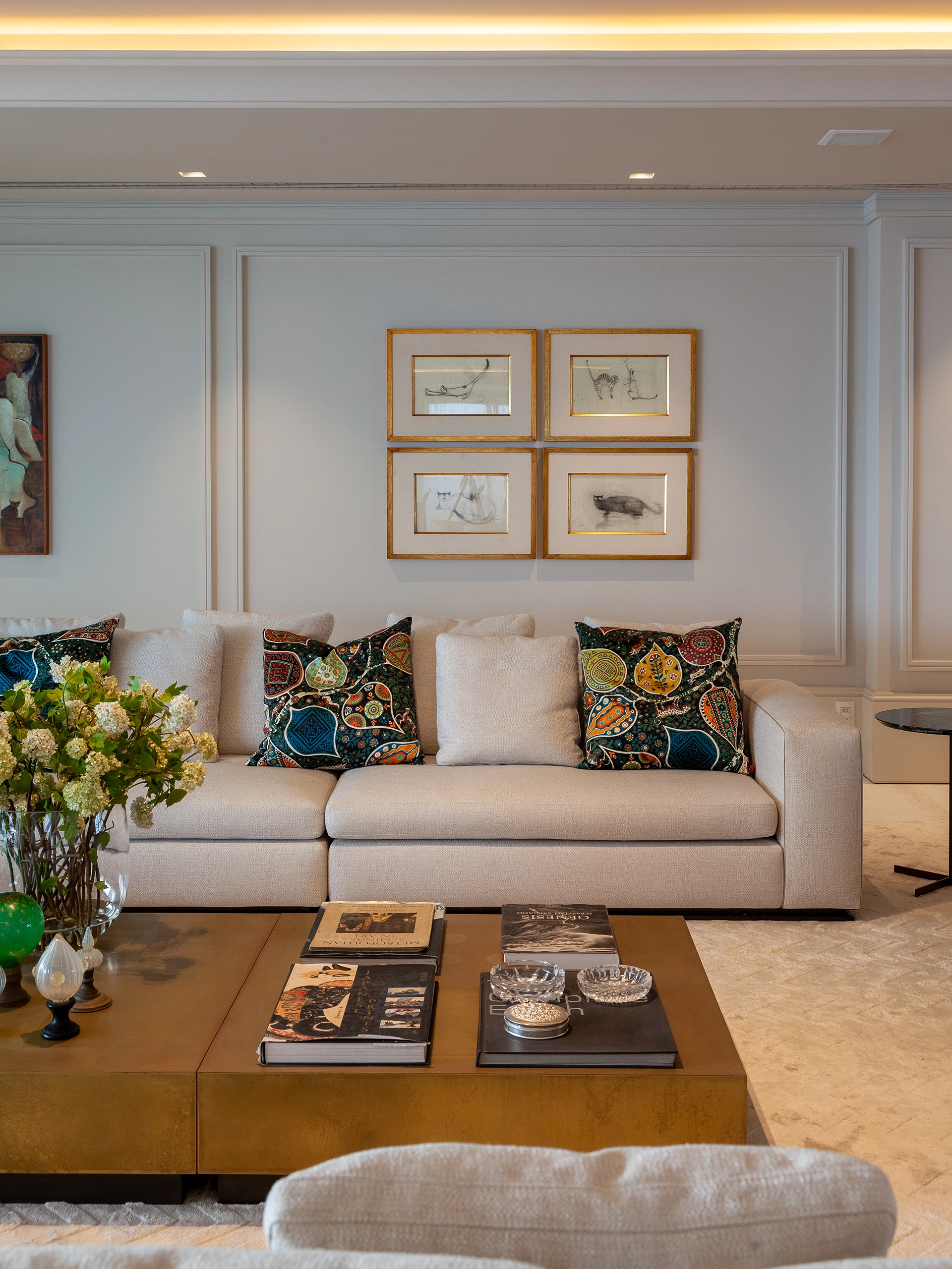 A área social — composta por estar, jantar, home theater e terraços — explora a escala generosa do imóvel e se beneficia da luz natural abundante da Baía de Todos os Santos. O projeto mescla elementos clássicos, como boiseries e proporções tradicionais, a mobiliário contemporâneo e peças trazidas pelo cliente, construindo uma linguagem que combina tradição e atualidade. Tons claros predominam, criando uma base atemporal que acolhe obras de arte, peças assinadas e mobiliário de design.