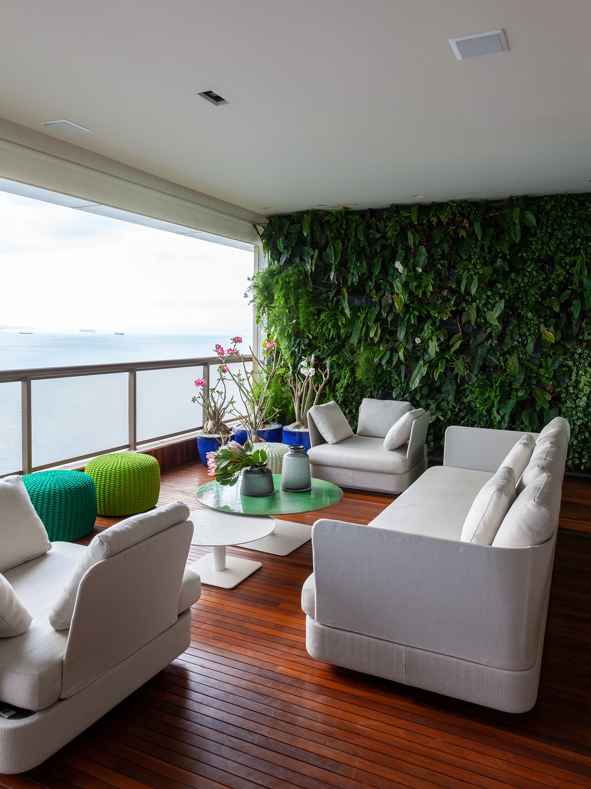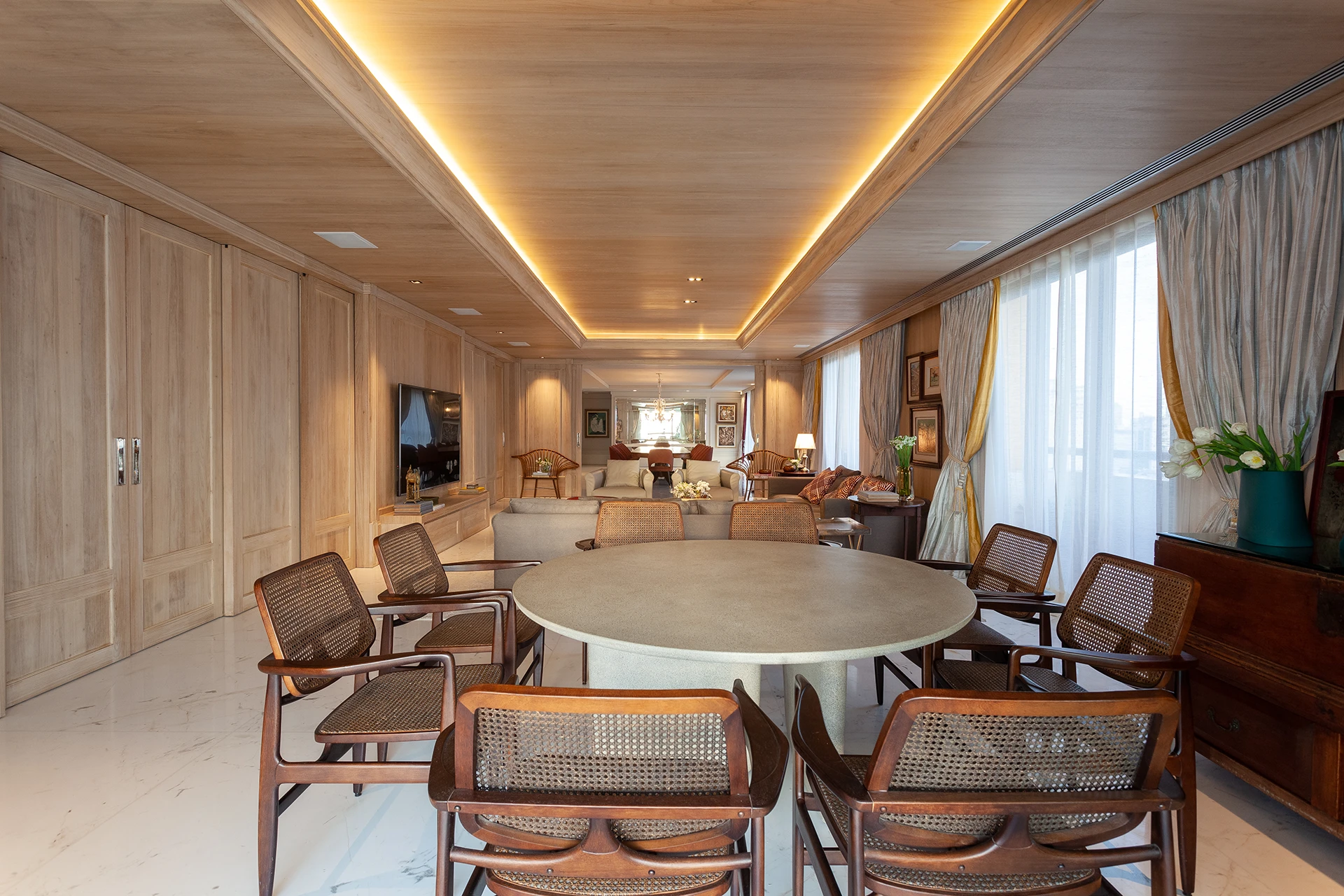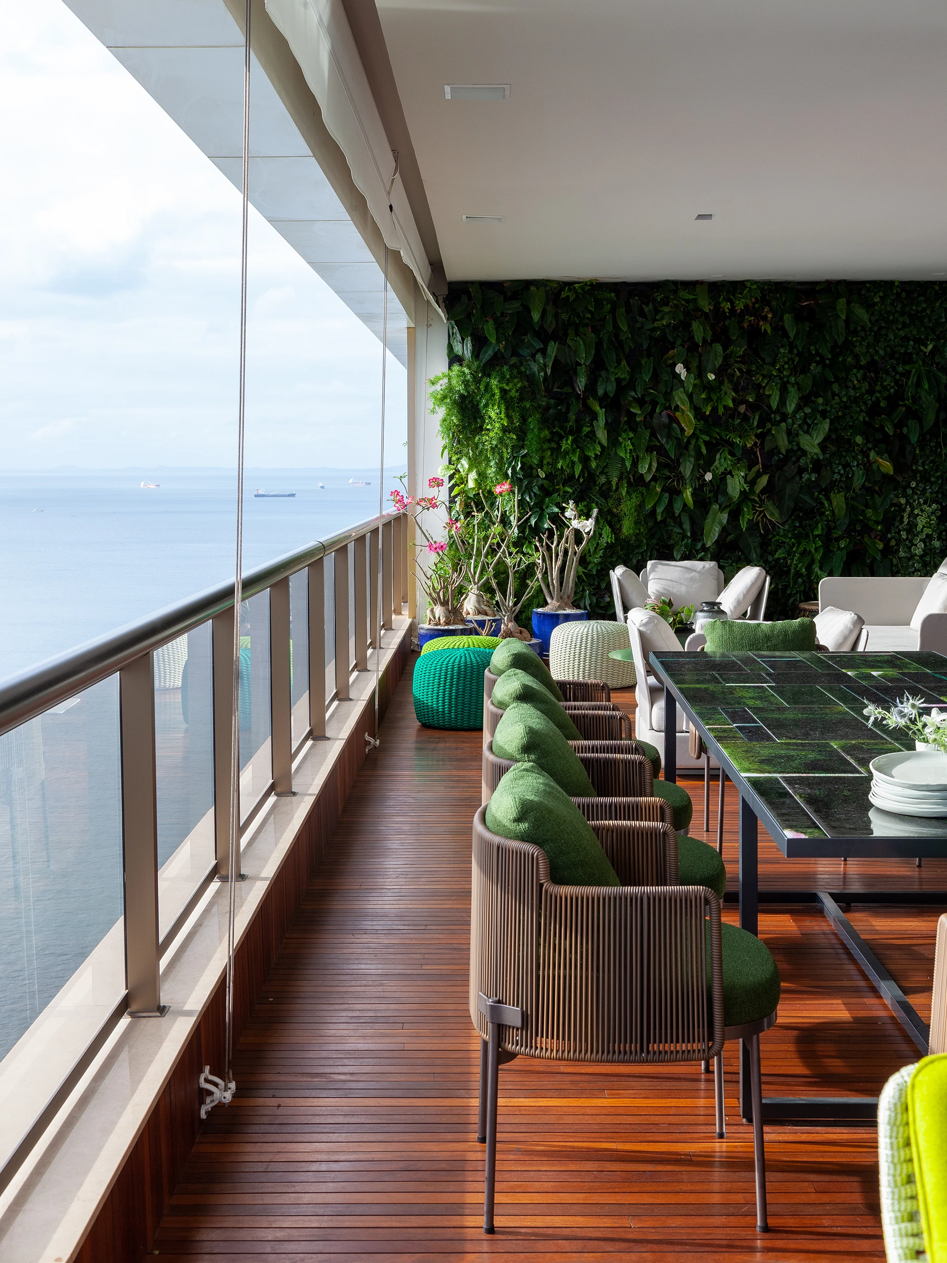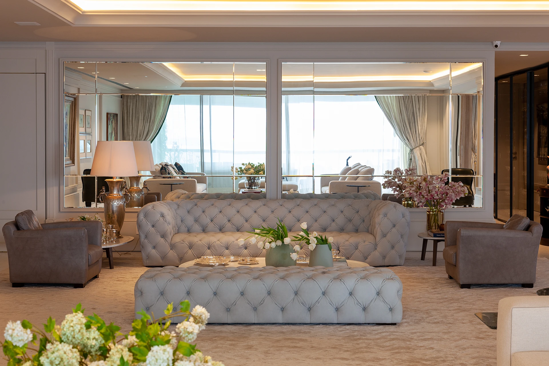 A área social — composta por estar, jantar, home theater e terraços — explora a escala generosa do imóvel e se beneficia da luz natural abundante da Baía de Todos os Santos. O projeto mescla elementos clássicos, como boiseries e proporções tradicionais, a mobiliário contemporâneo e peças trazidas pelo cliente, construindo uma linguagem que combina tradição e atualidade. Tons claros predominam, criando uma base atemporal que acolhe obras de arte, peças assinadas e mobiliário de design.