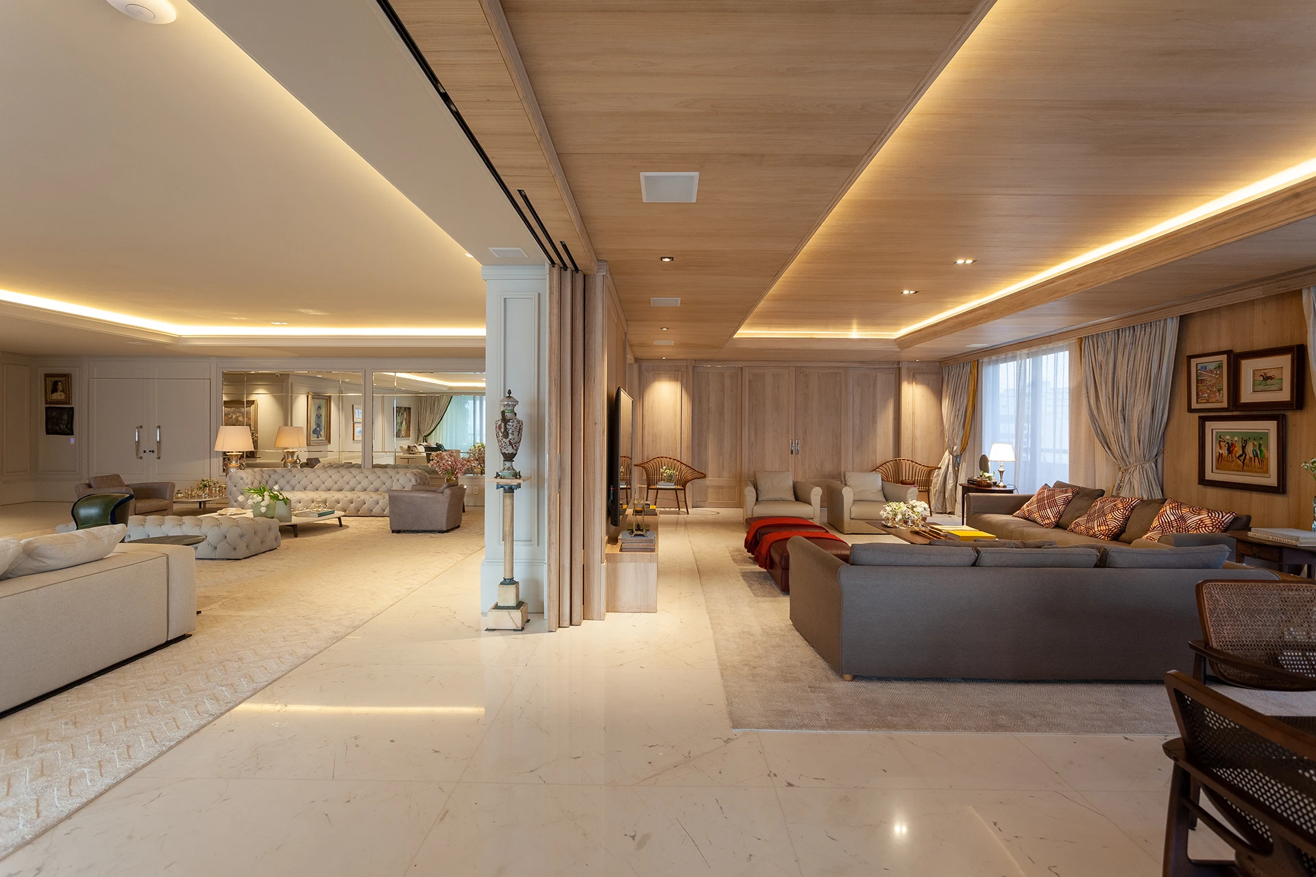 O ponto de partida foi adequar os espaços às necessidades do dia a dia: filhos adolescentes ganharam suítes confortáveis, áreas para estudo e integração entre amigos, enquanto a ala íntima foi preservada com acessos estratégicos às áreas de apoio, como cozinha, copa e estar íntimo. A independência entre área social e área de uso cotidiano foi essencial para garantir praticidade sem interferir na sofisticação do conjunto.